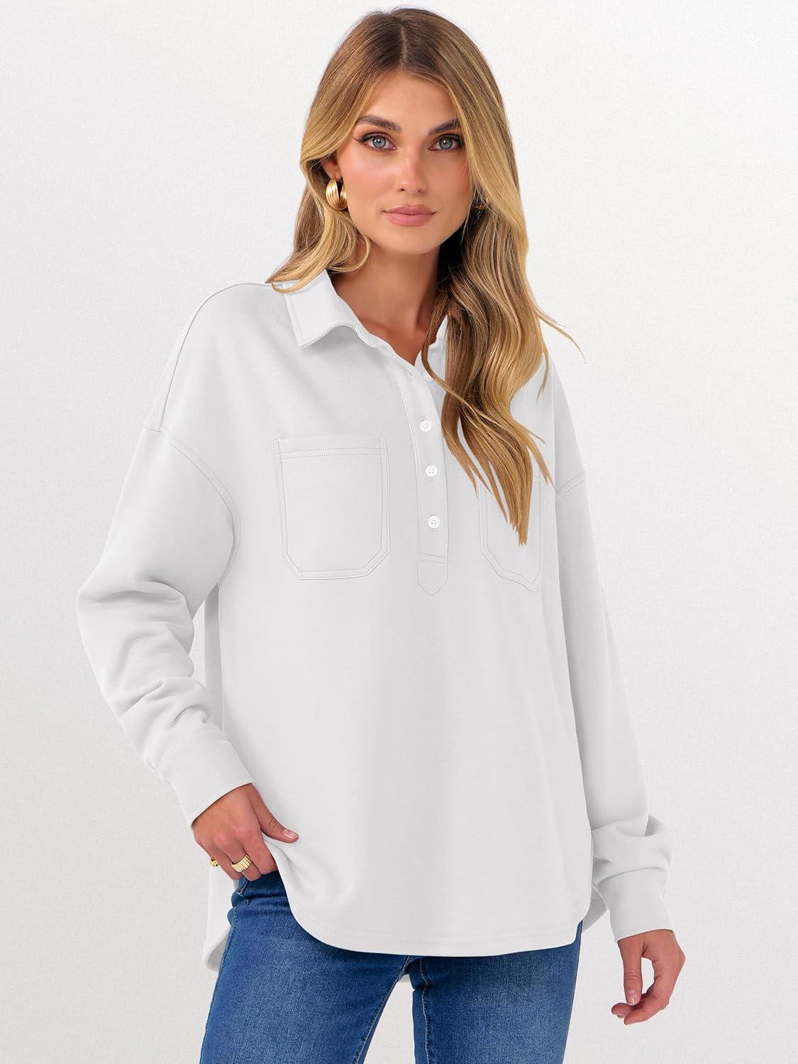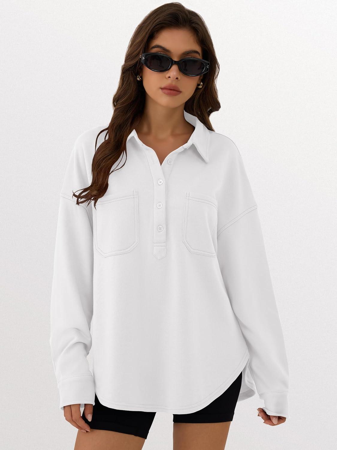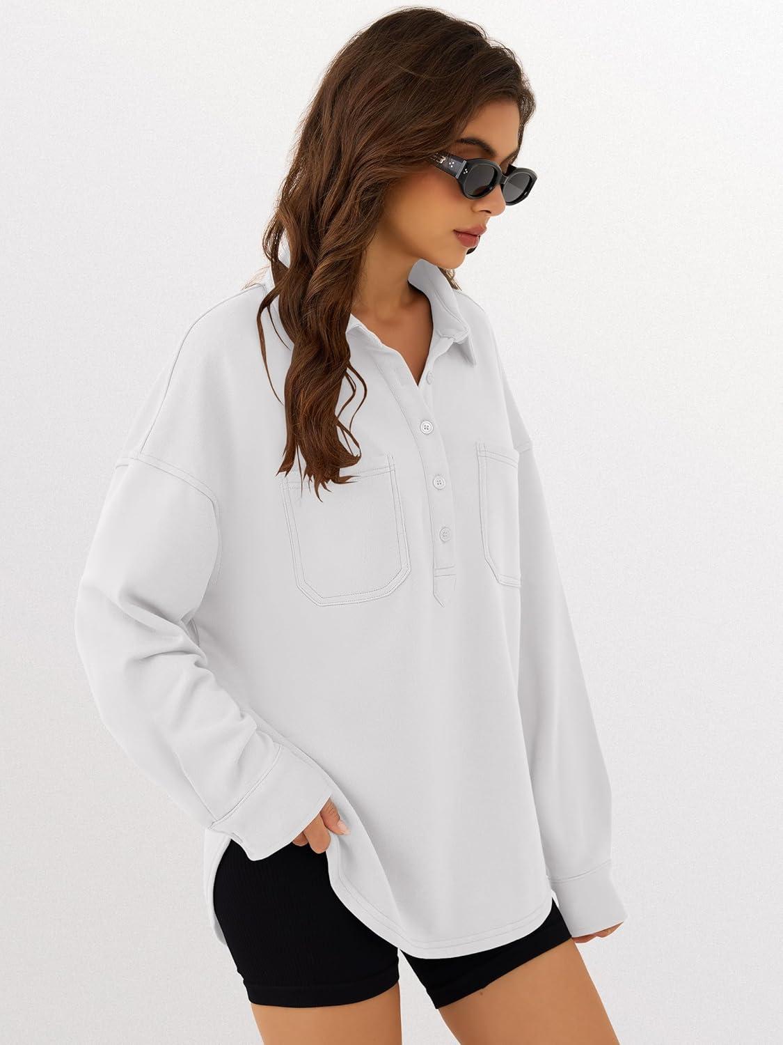 ANRABESS Sweatshirt for Women Oversized Casual Long Sleeve Side Slit Button Lapel Polo Pullover Tunic Tops 2025 Fall Outfits(White)