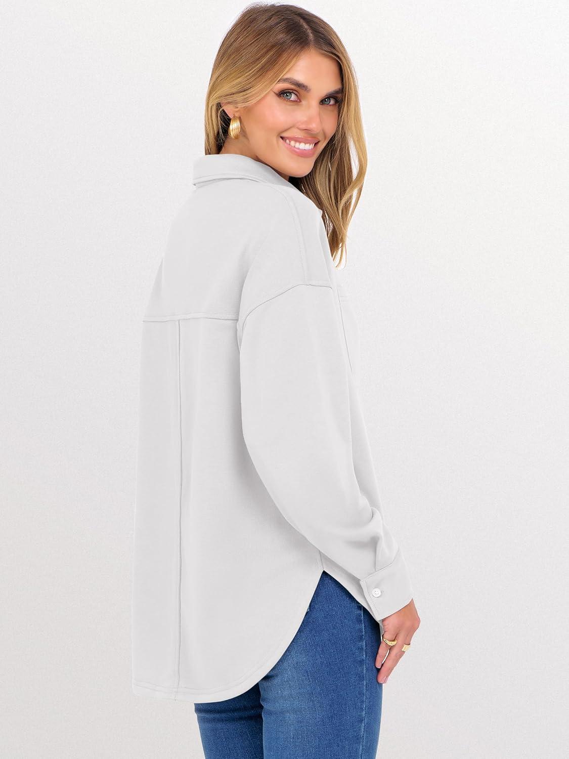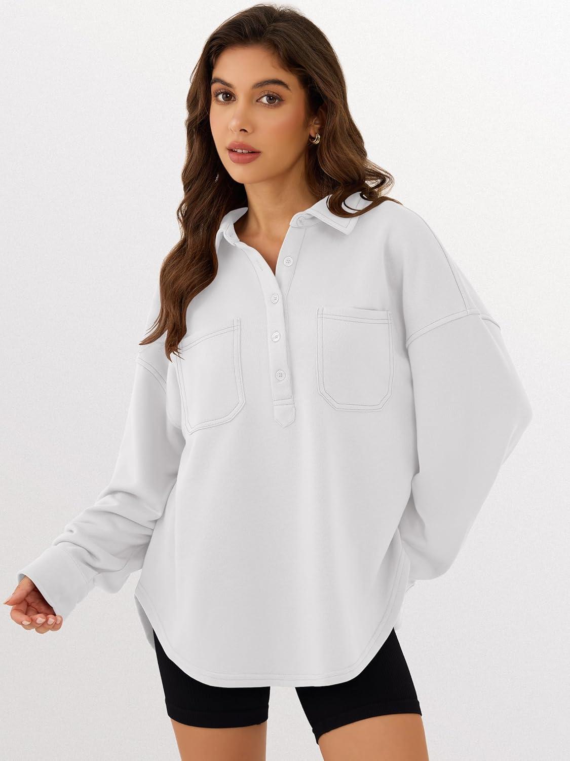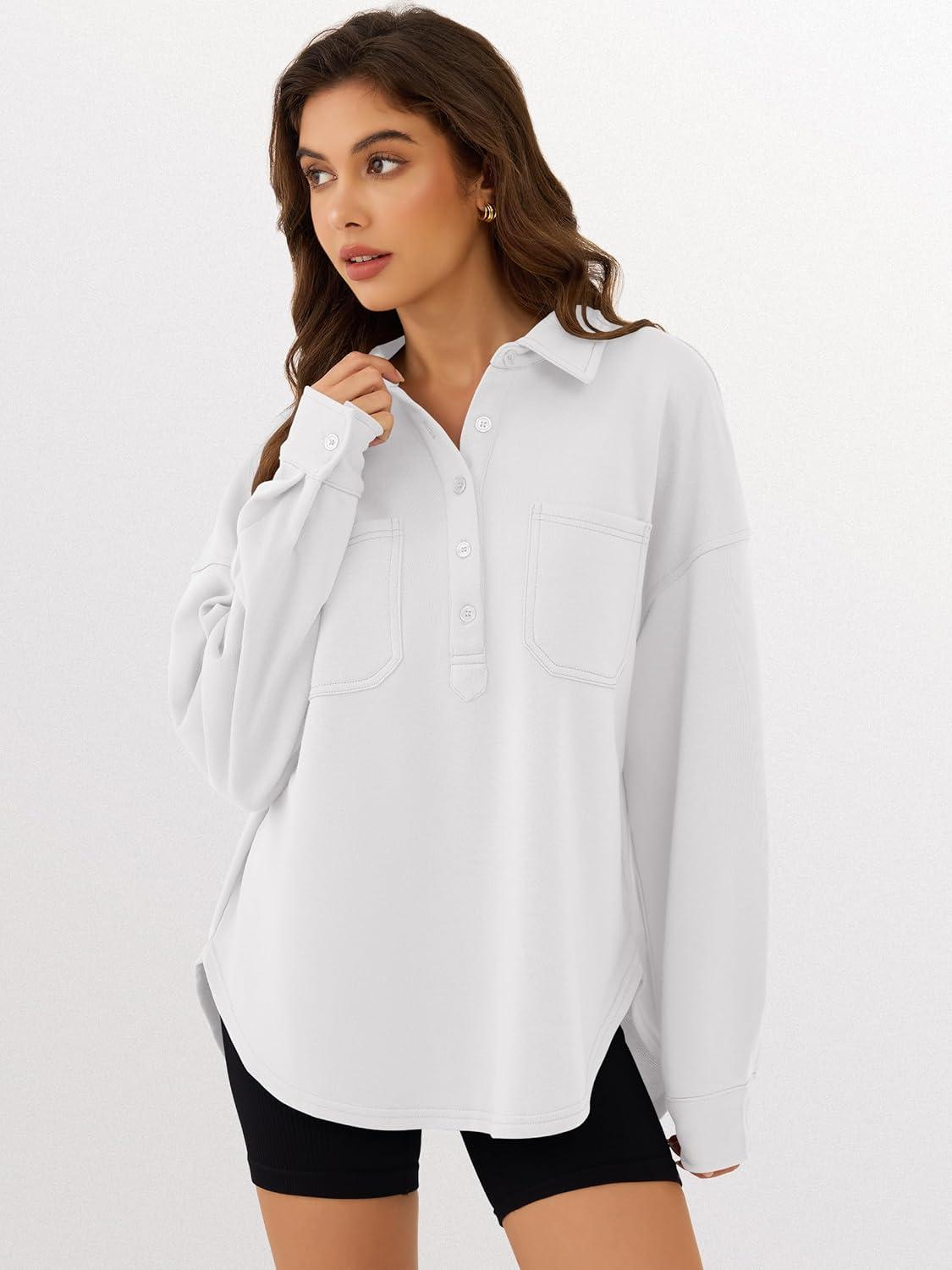 ANRABESS Sweatshirt for Women Oversized Casual Long Sleeve Side Slit Button Lapel Polo Pullover Tunic Tops 2025 Fall Outfits(White)