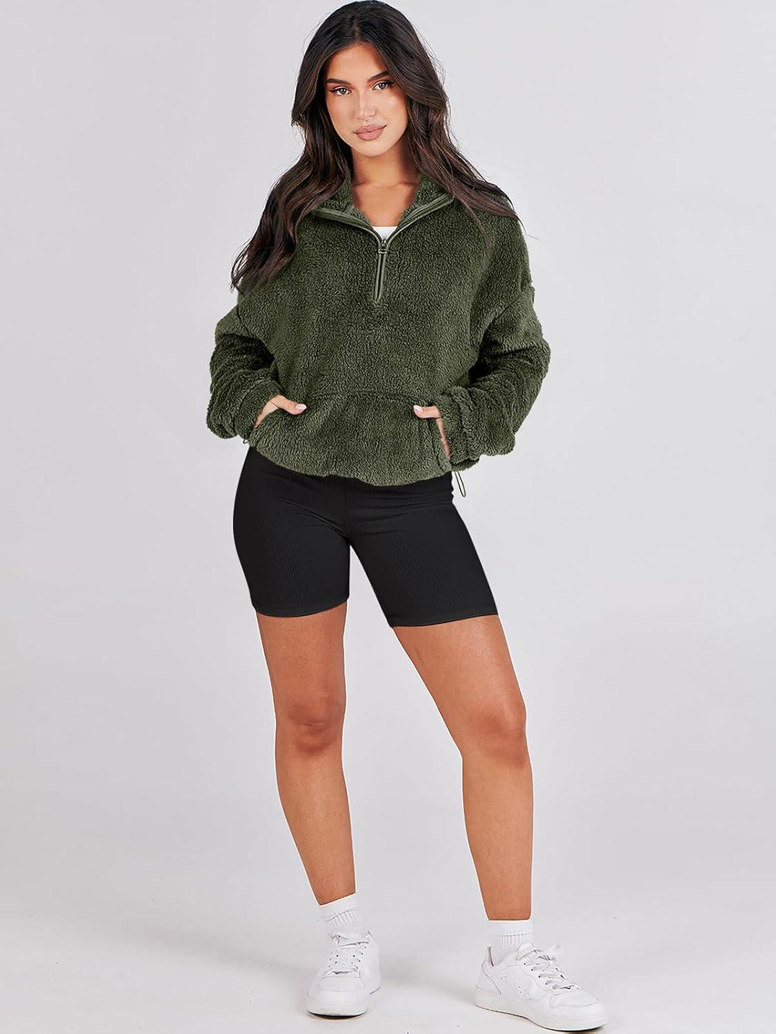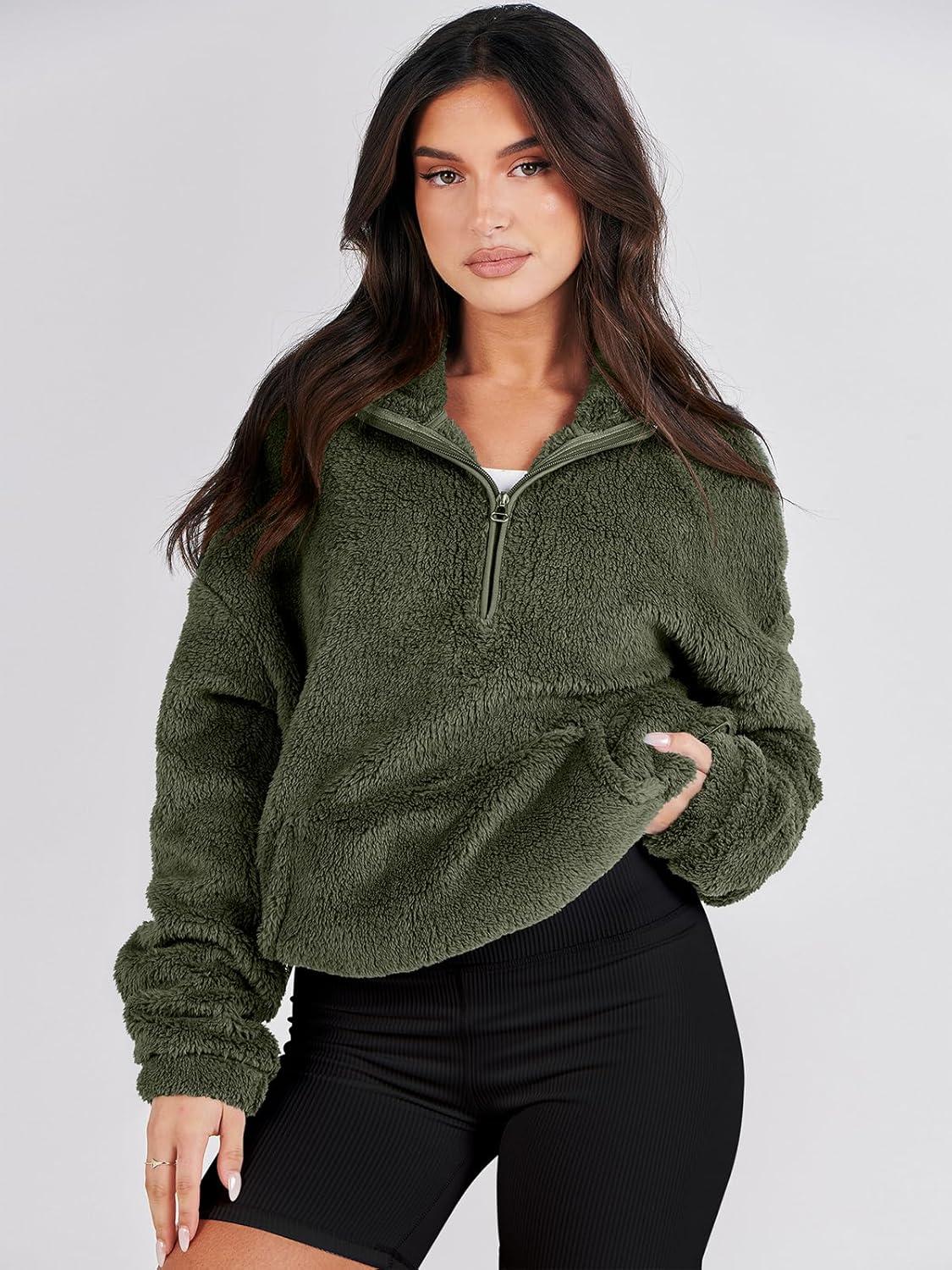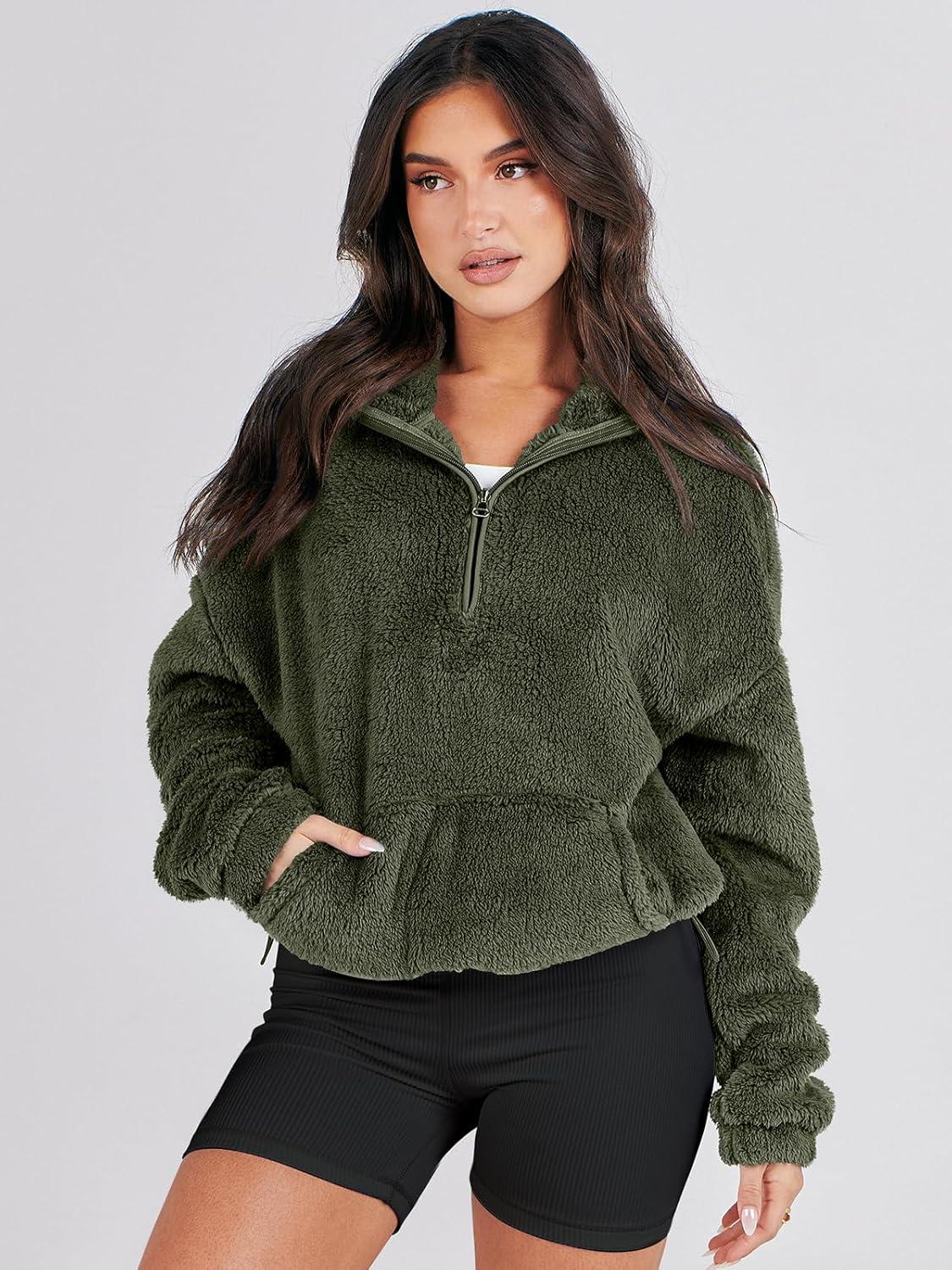 ANRABESS Sweatshirt for Women Zip Up Hoodies Cropped Pullover Fleece Hooded Sherpa Sweaters Tops 2025 Fall Winter Clothes(Army Green)