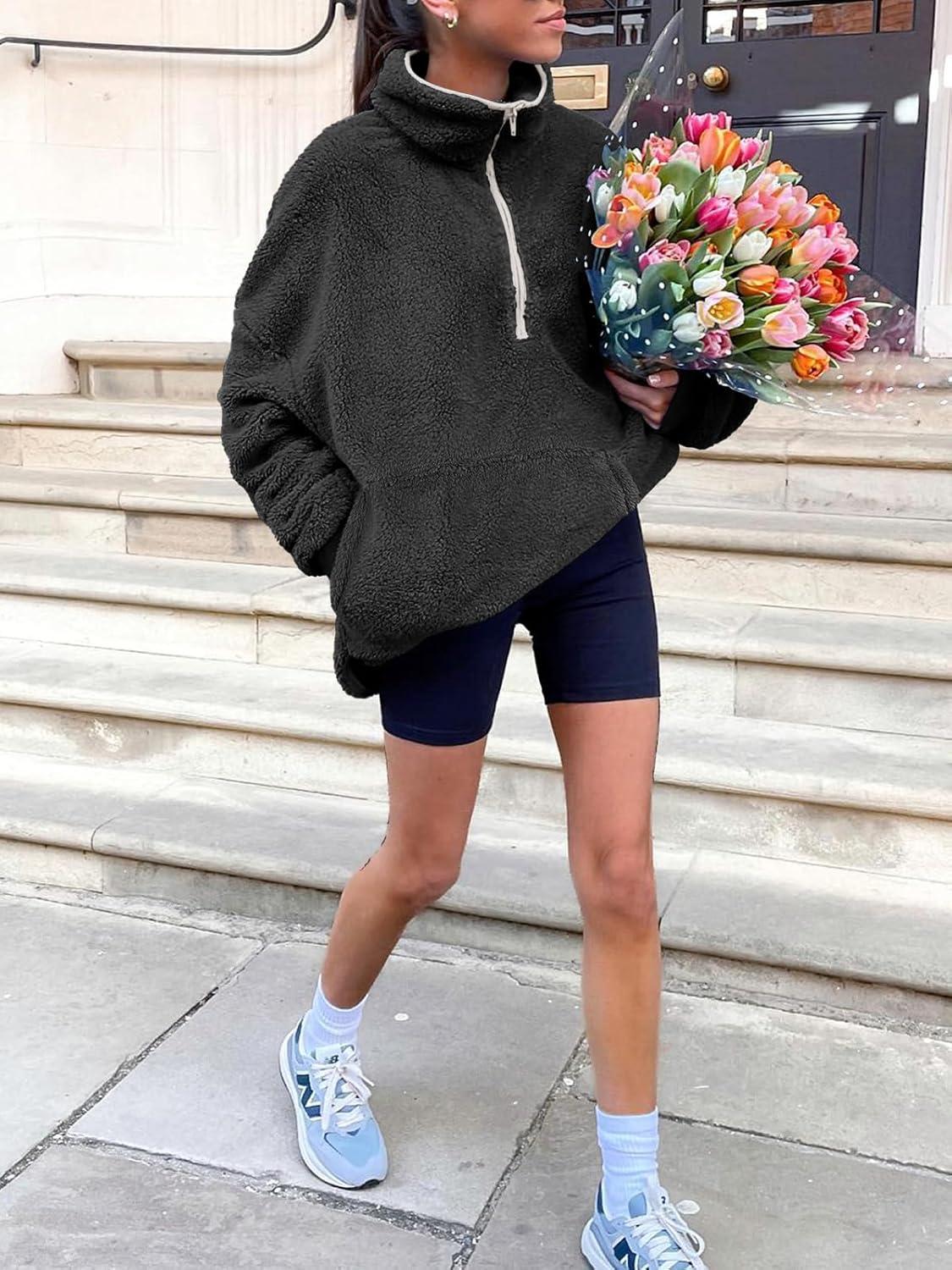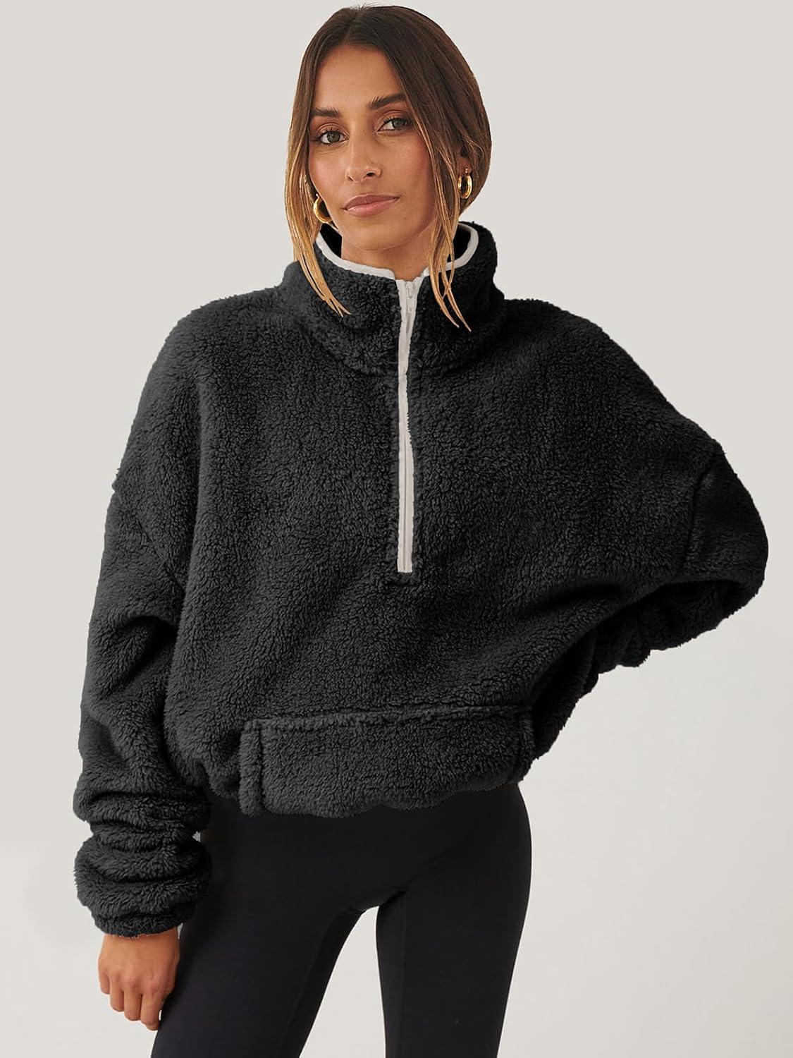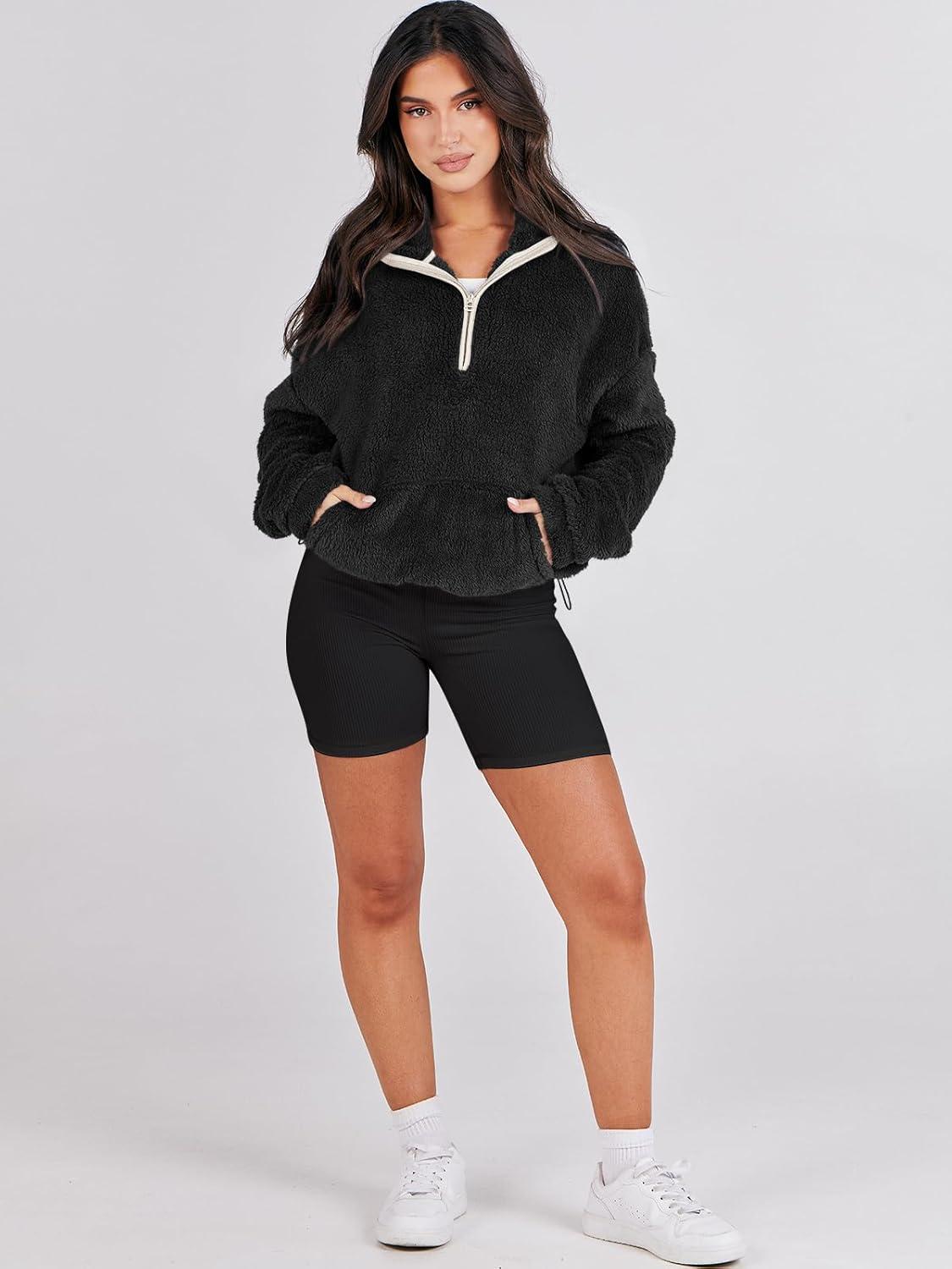 ANRABESS Sweatshirt for Women Zip Up Hoodies Cropped Pullover Fleece Hooded Sherpa Sweaters Tops 2025 Fall Winter Clothes(Black)