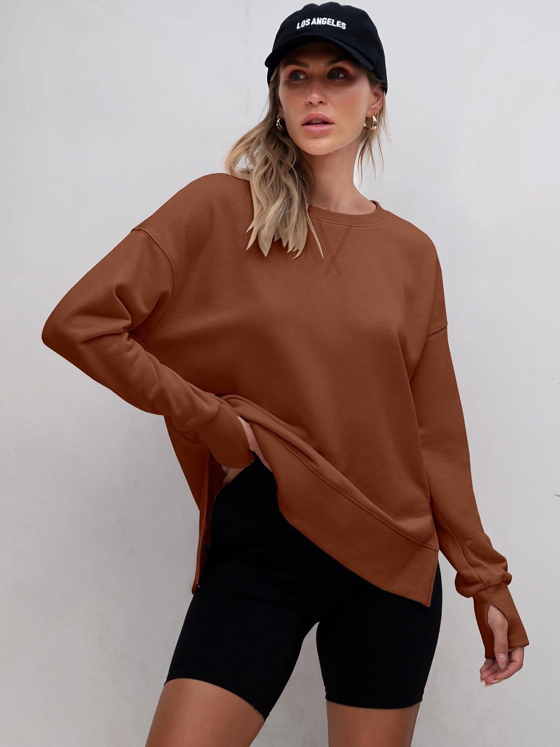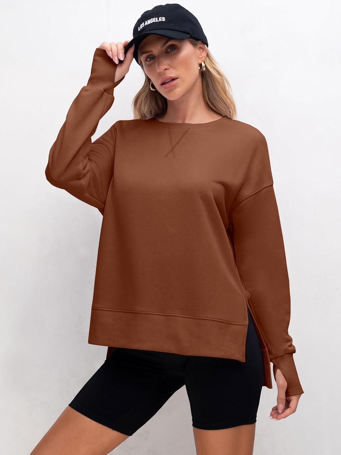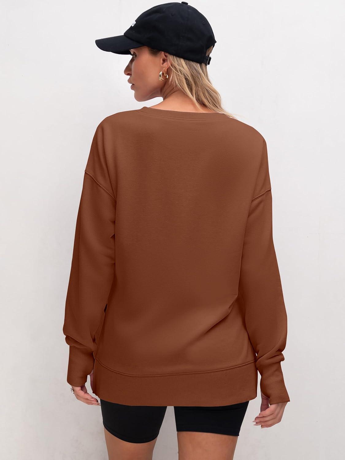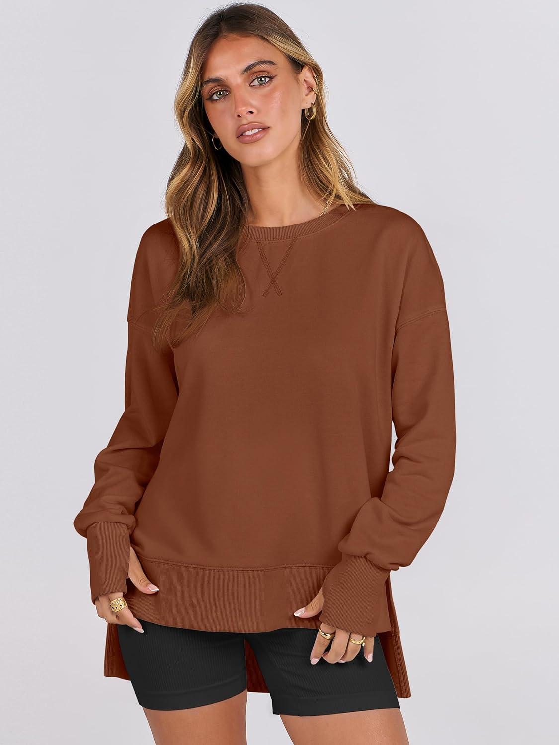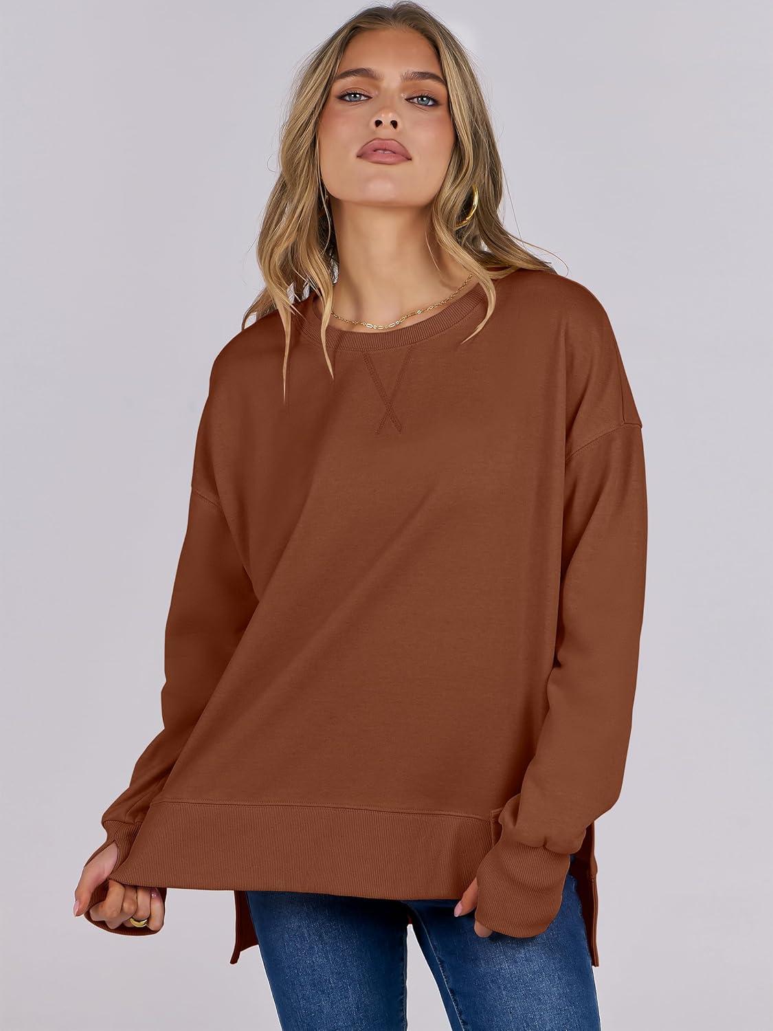 ANRABESS Sweatshirts for Women 2025 Fall Long Sleeve Shirts Oversized Crewneck Lightweight Side Split Casual Pullover Tops(Burnt Brown)