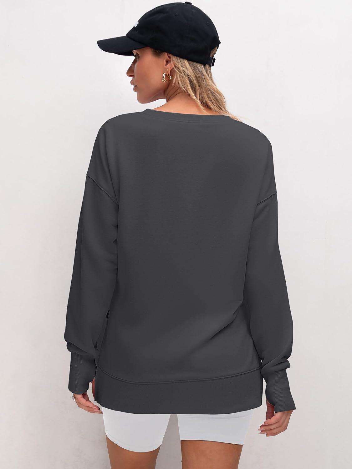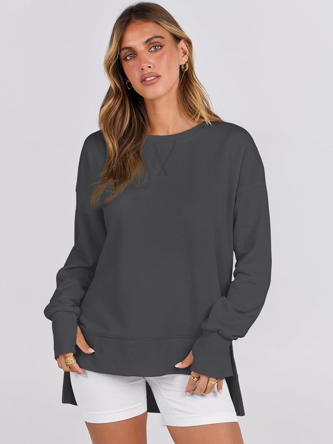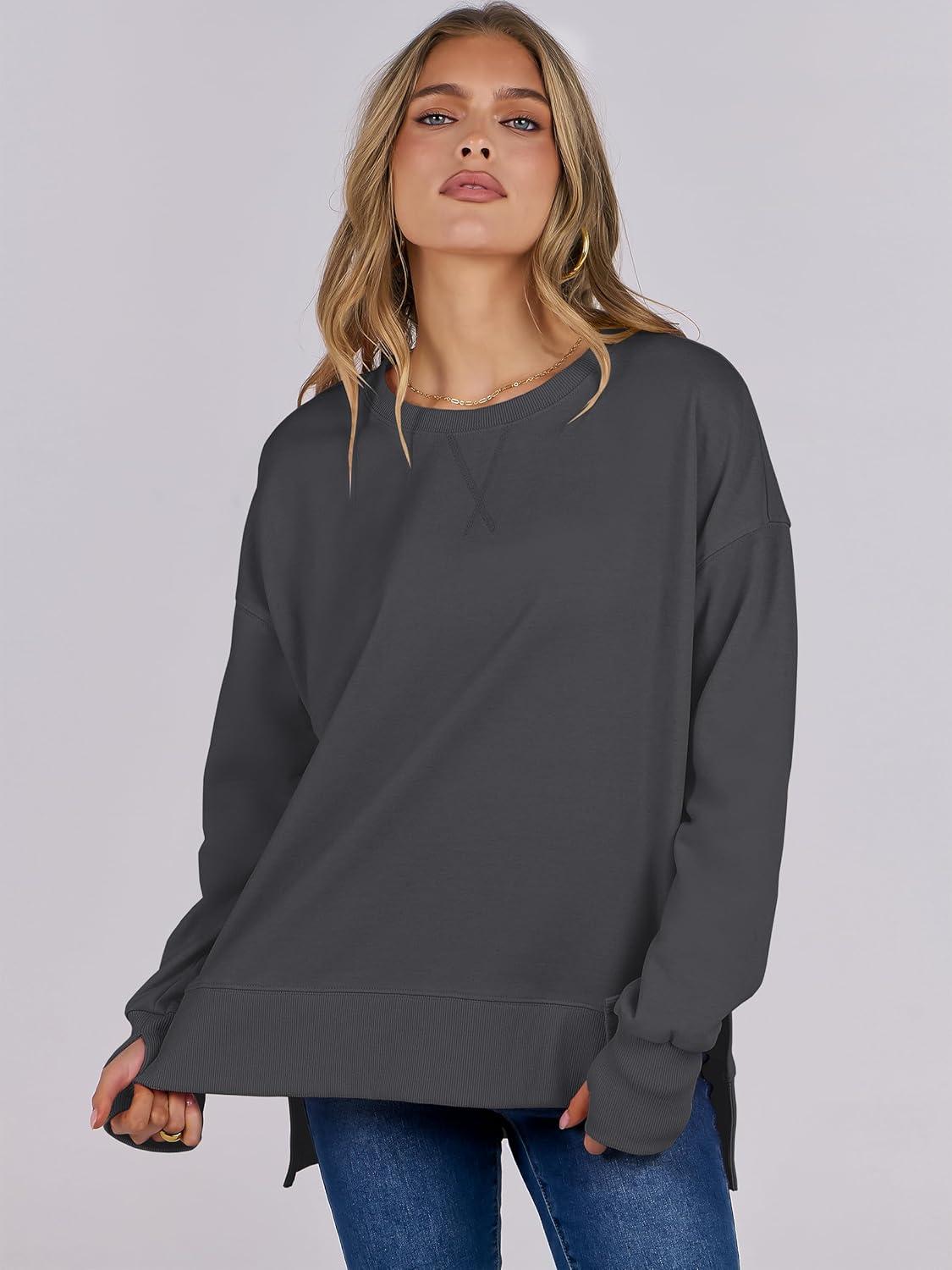 ANRABESS Sweatshirts for Women 2025 Fall Long Sleeve Shirts Oversized Crewneck Lightweight Side Split Casual Pullover Tops(Deep Gray)