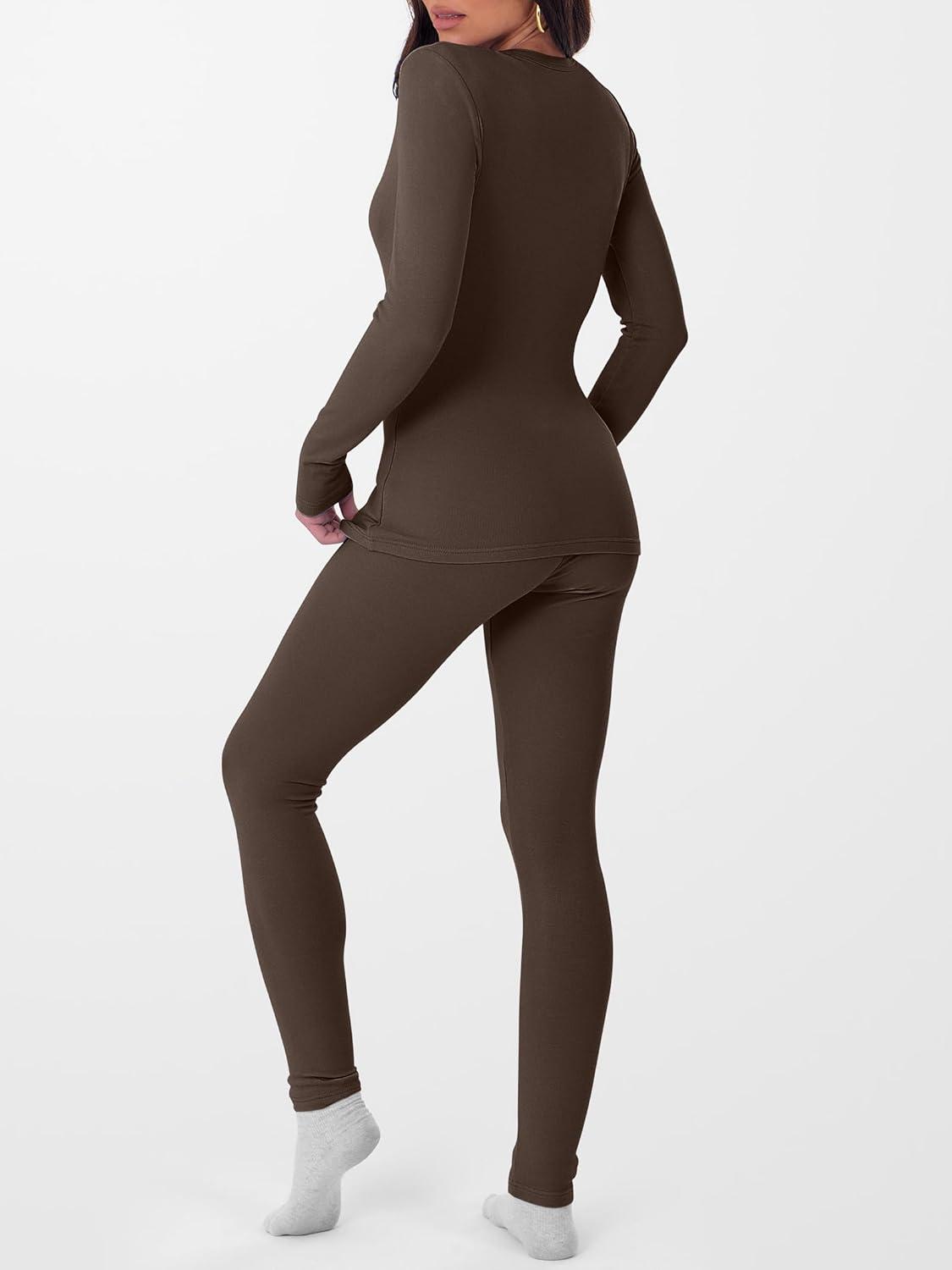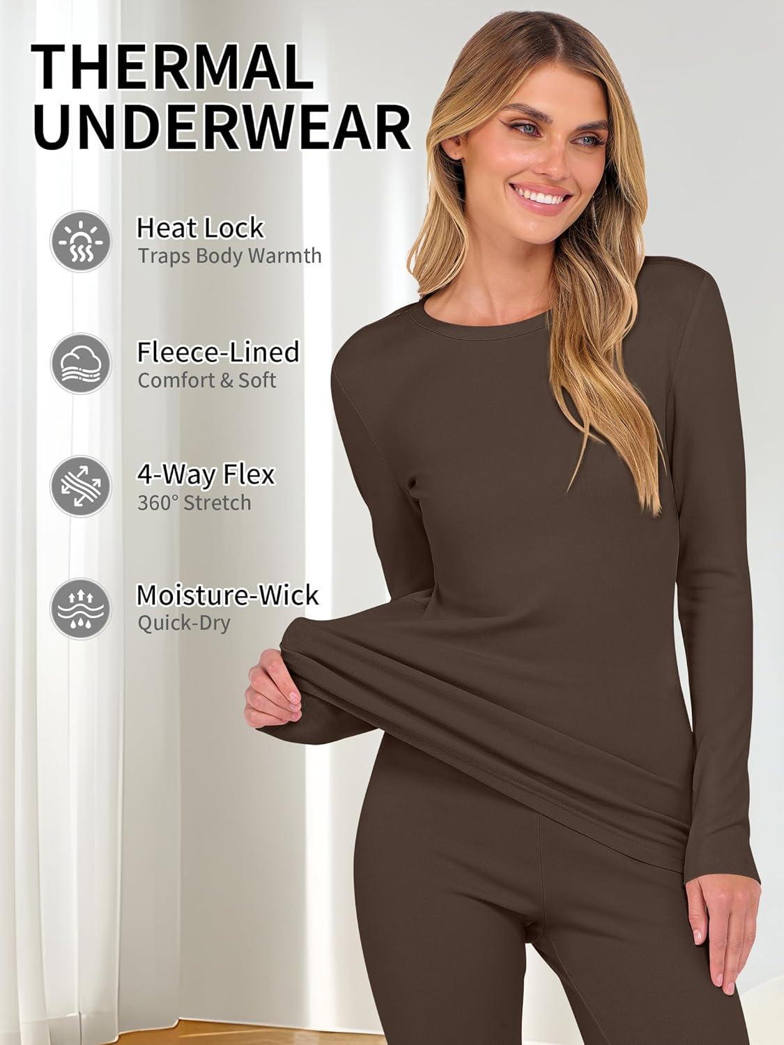 ANRABESS Thermal Underwear for Women Long Johns Fleece Lined Base Layer Pajama Set Cold Weather Top Bottom Winter Clothing(Dark Brown)