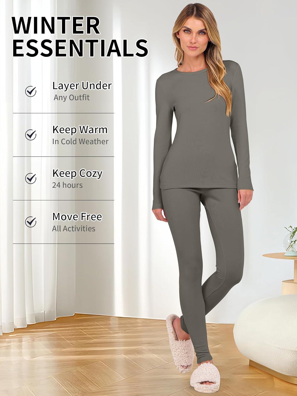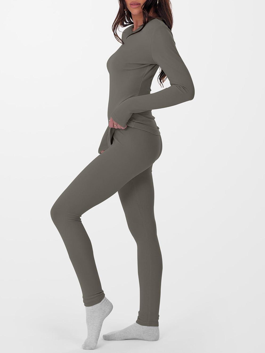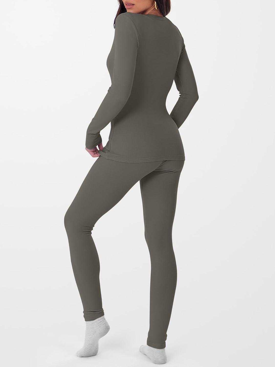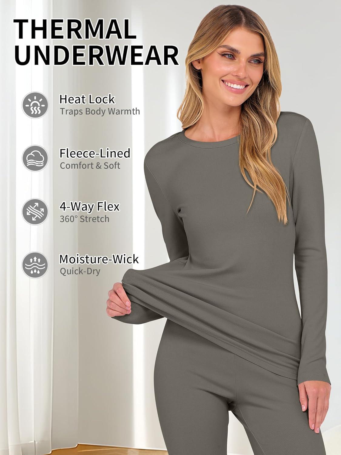 ANRABESS Thermal Underwear for Women Long Johns Fleece Lined Base Layer Pajama Set Cold Weather Top Bottom Winter Clothing(Olive Gray)