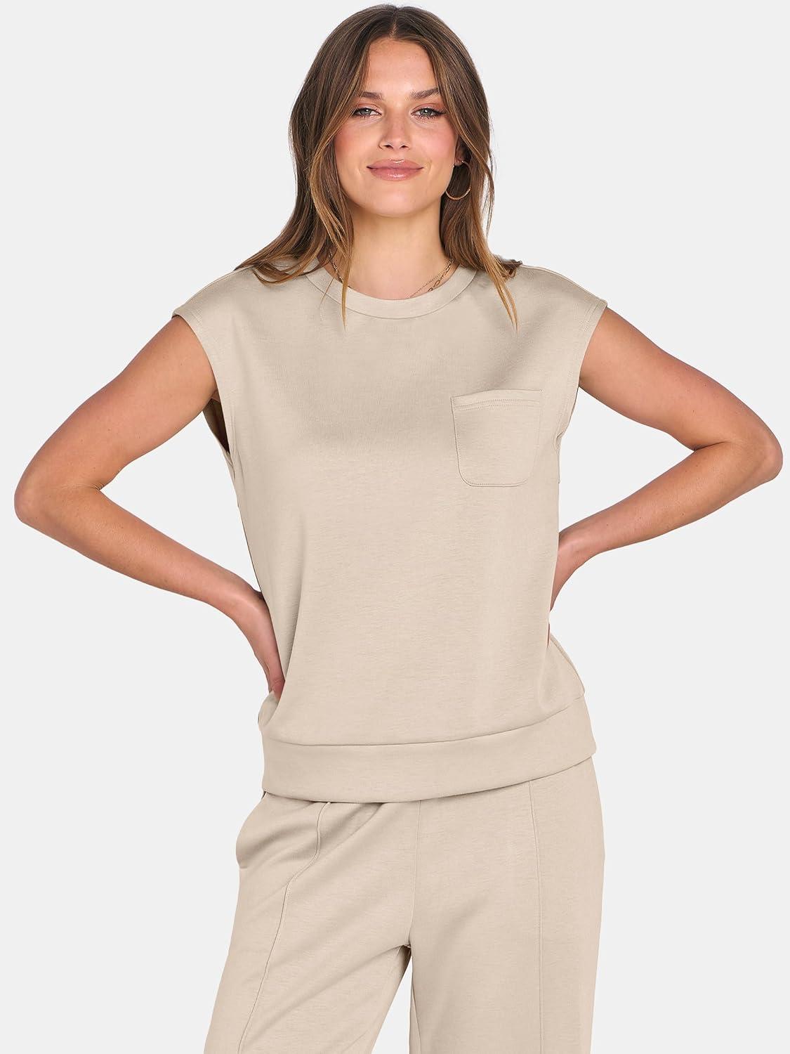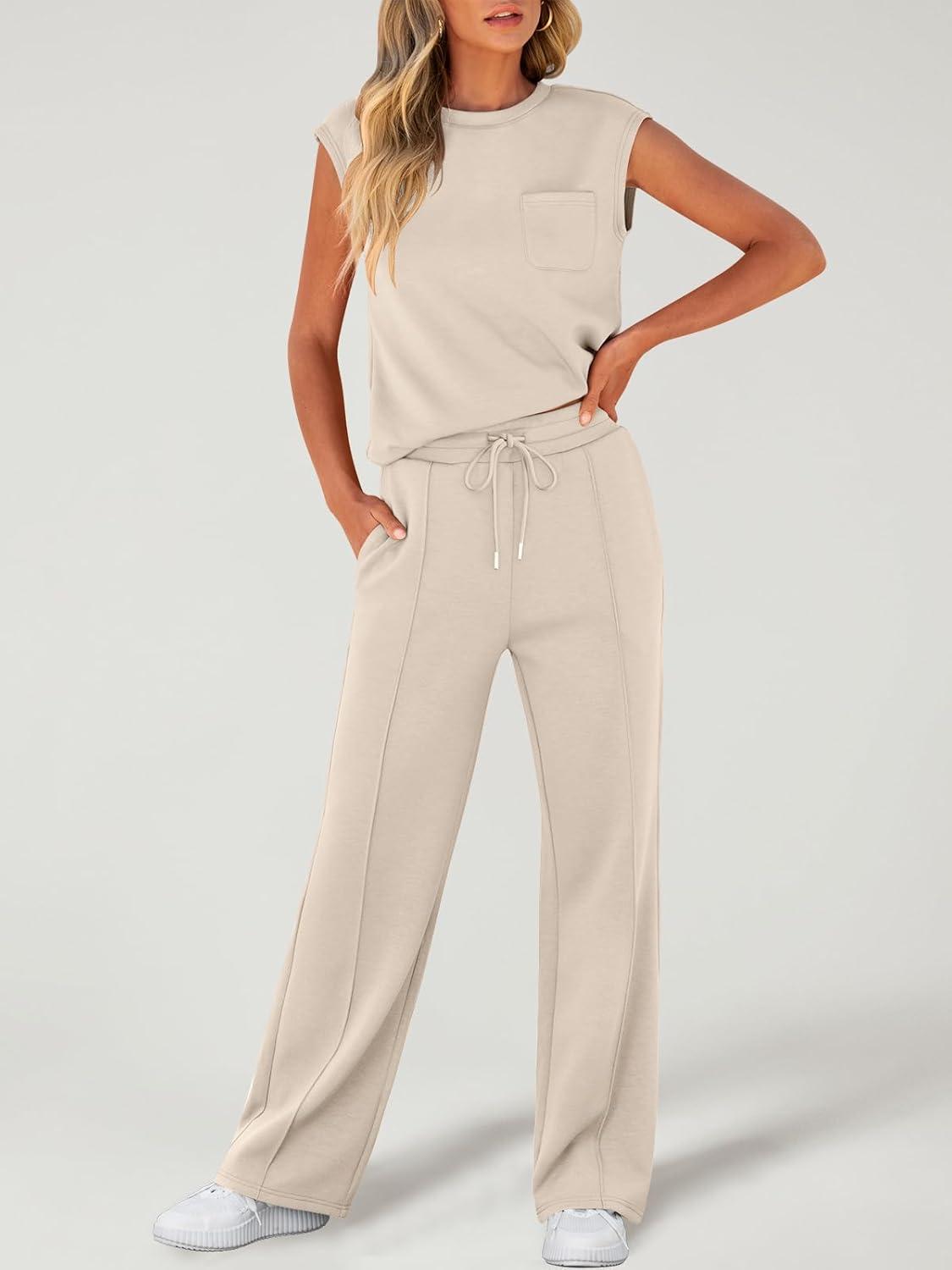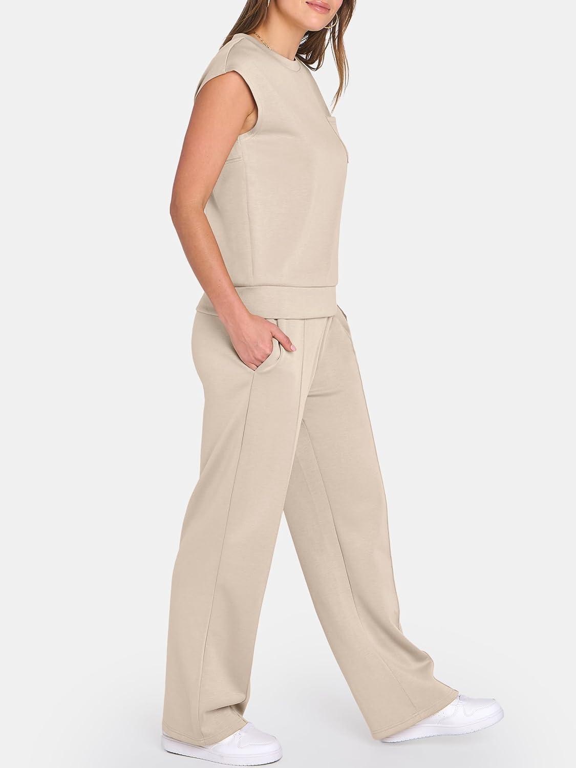 ANRABESS Two Piece Sets for Women Summer Sleeveless Sweatsuits Wide Leg Casual Lounge Set Matching Vacation Travel Outfits(Apricot)