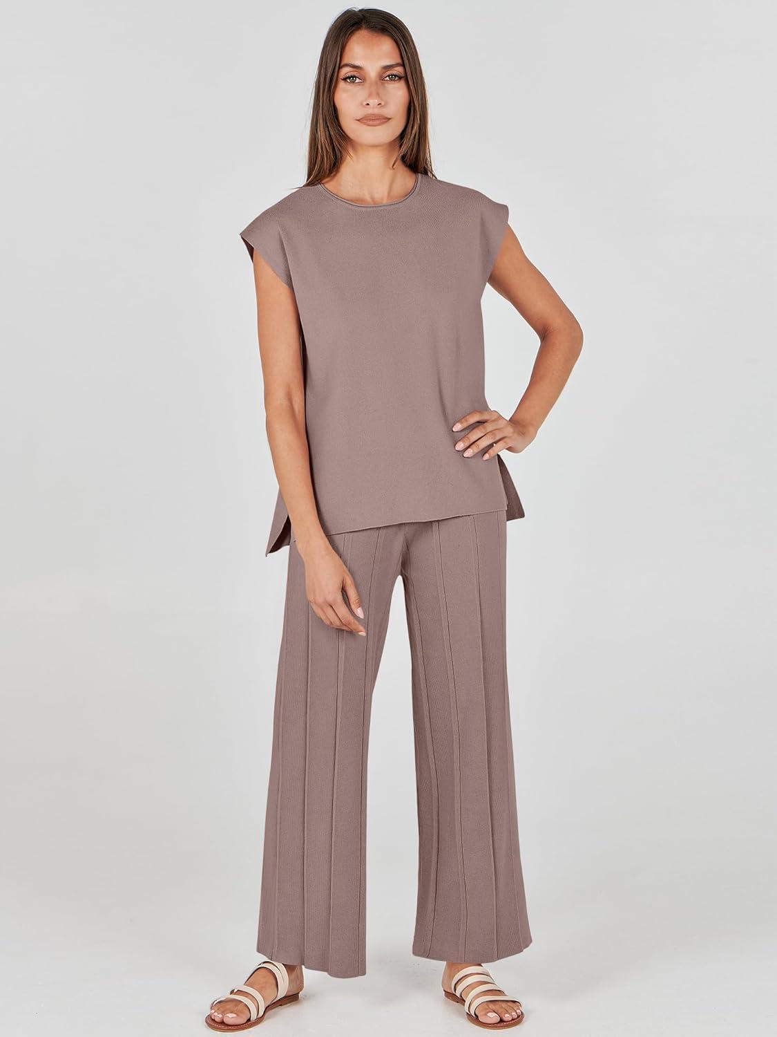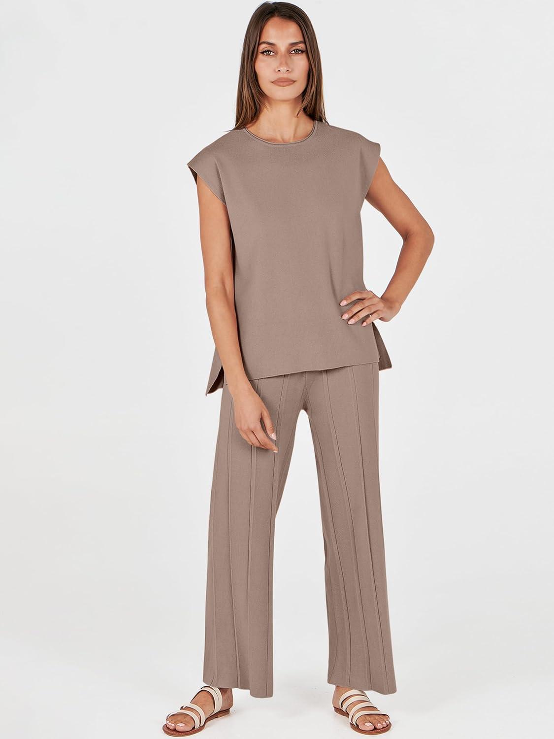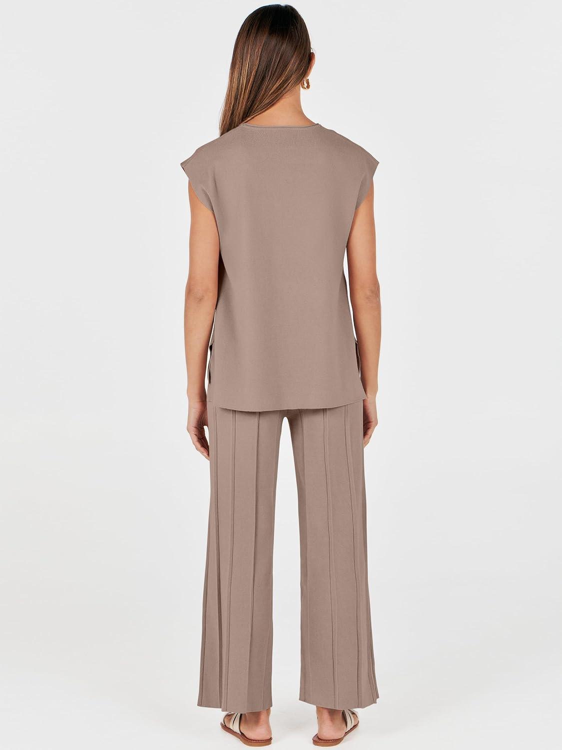 ANRABESS Women 2 Piece Lounge Sets Summer Casual Knit Sweater Vest Pant Set Beach Vacation Airport Clothes 2025 Fall Outfits(Brown)