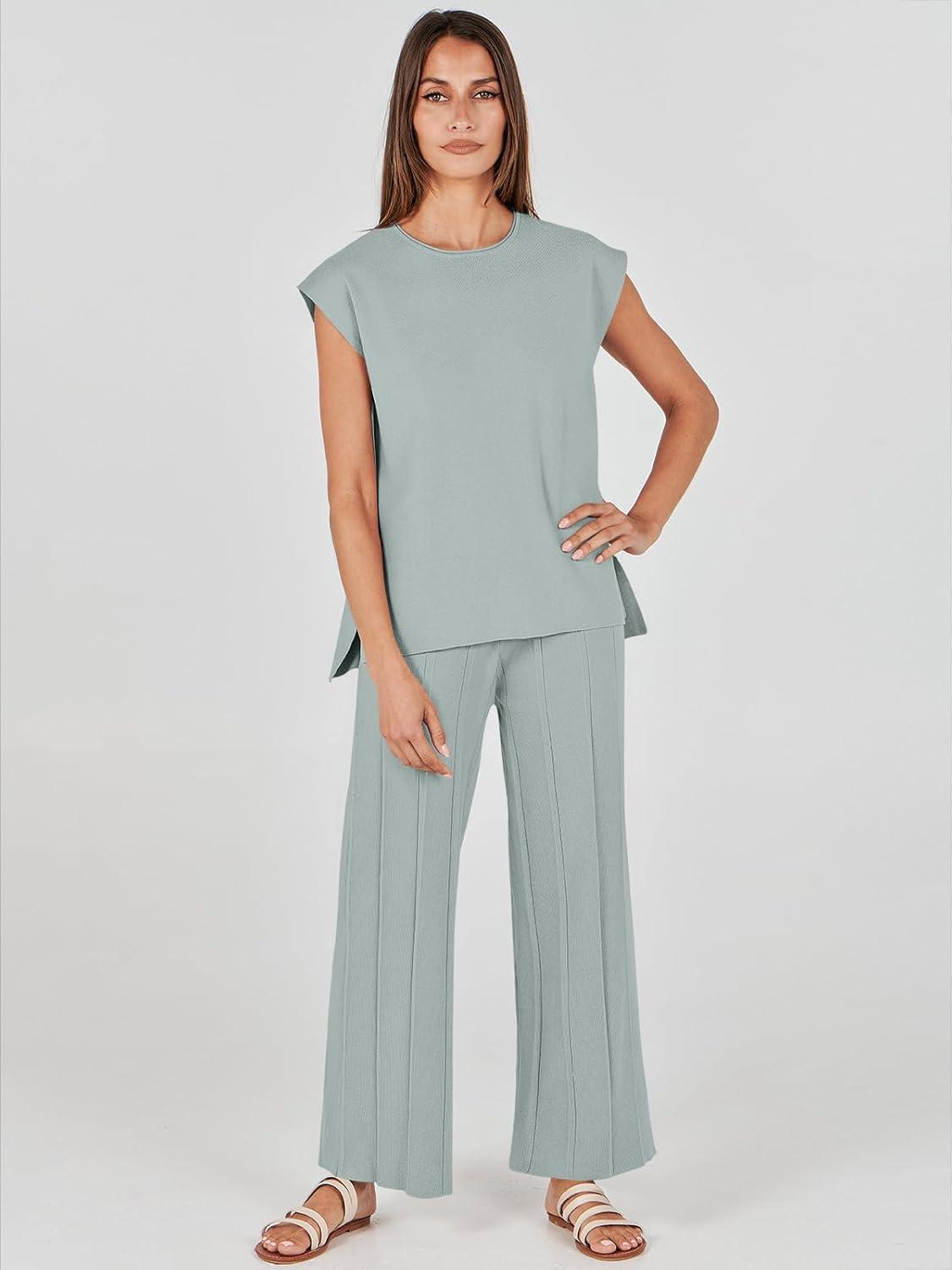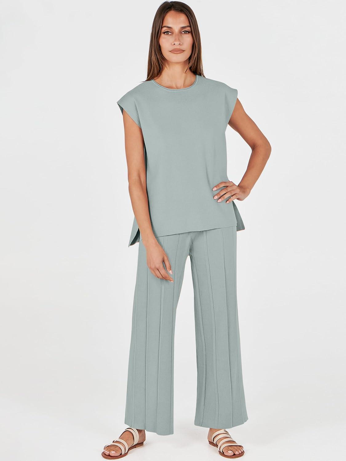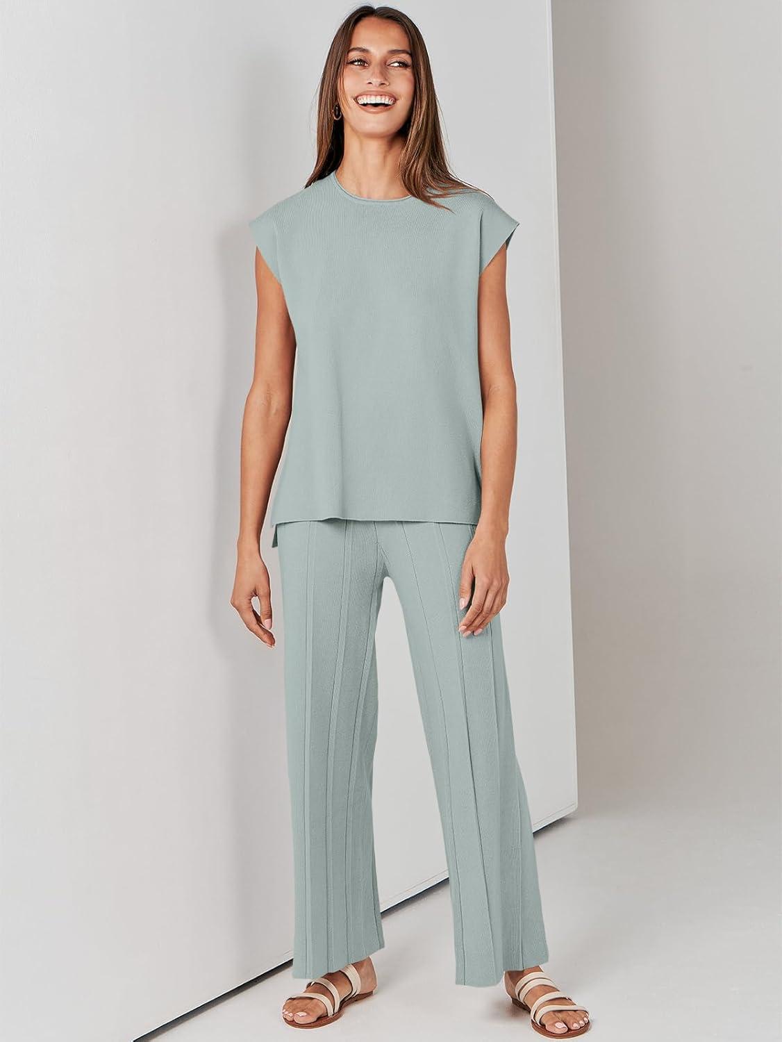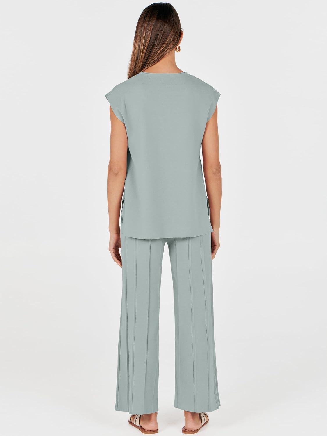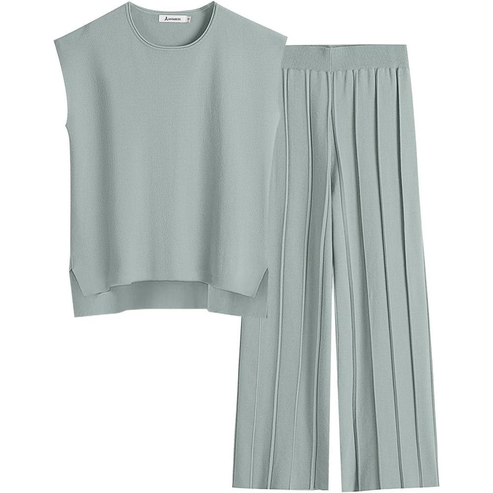 ANRABESS Women 2 Piece Lounge Sets Summer Casual Knit Sweater Vest Pant Set Beach Vacation Airport Clothes 2025 Fall Outfits(Grey Green)