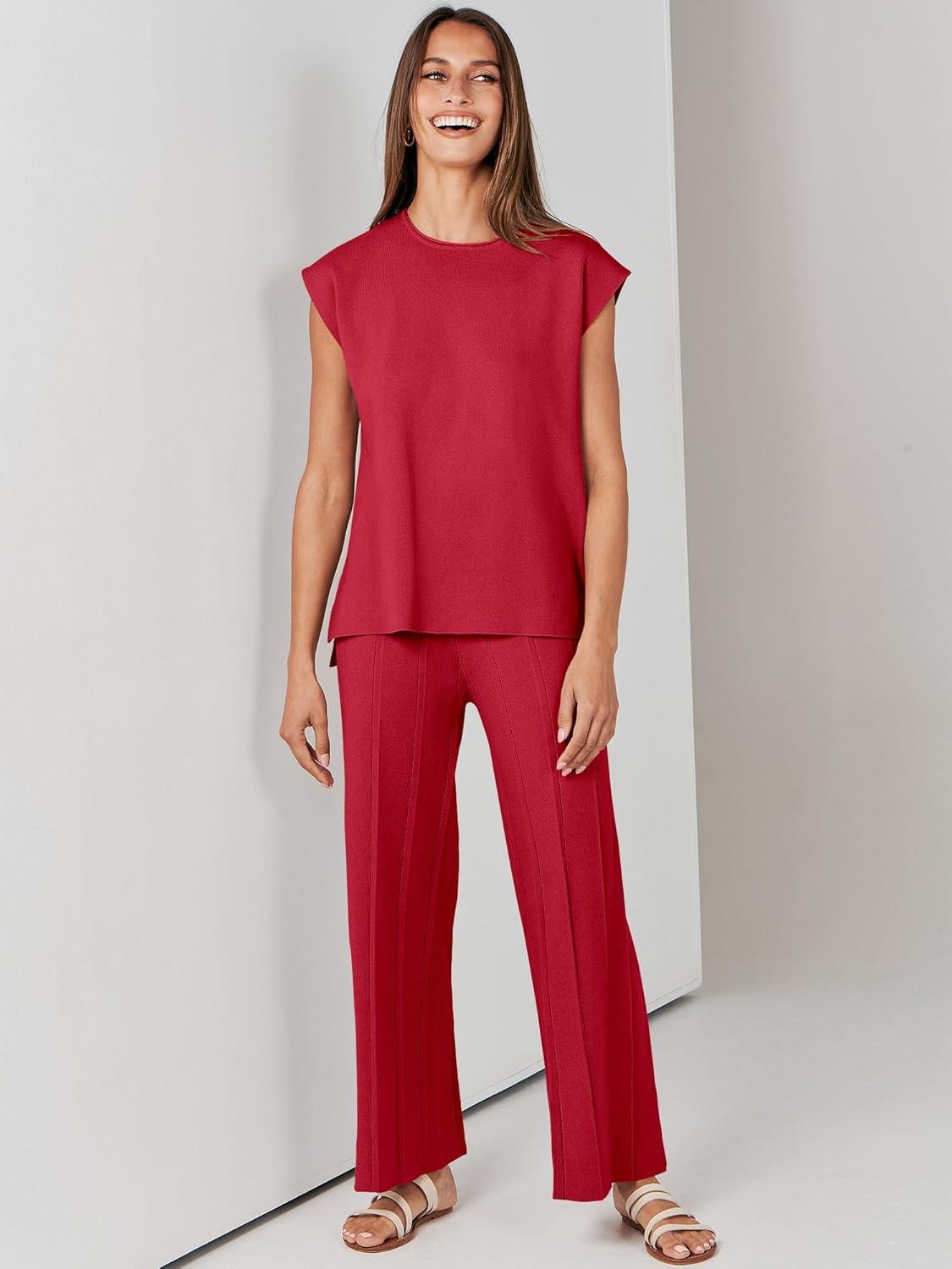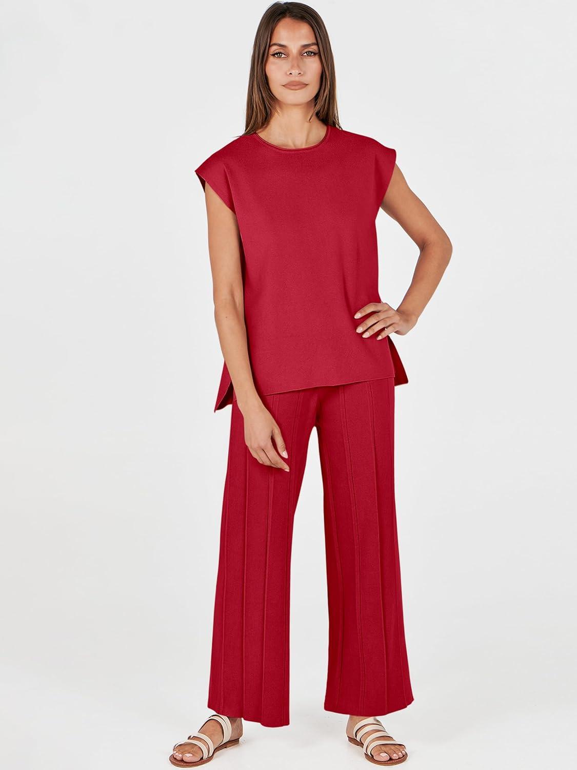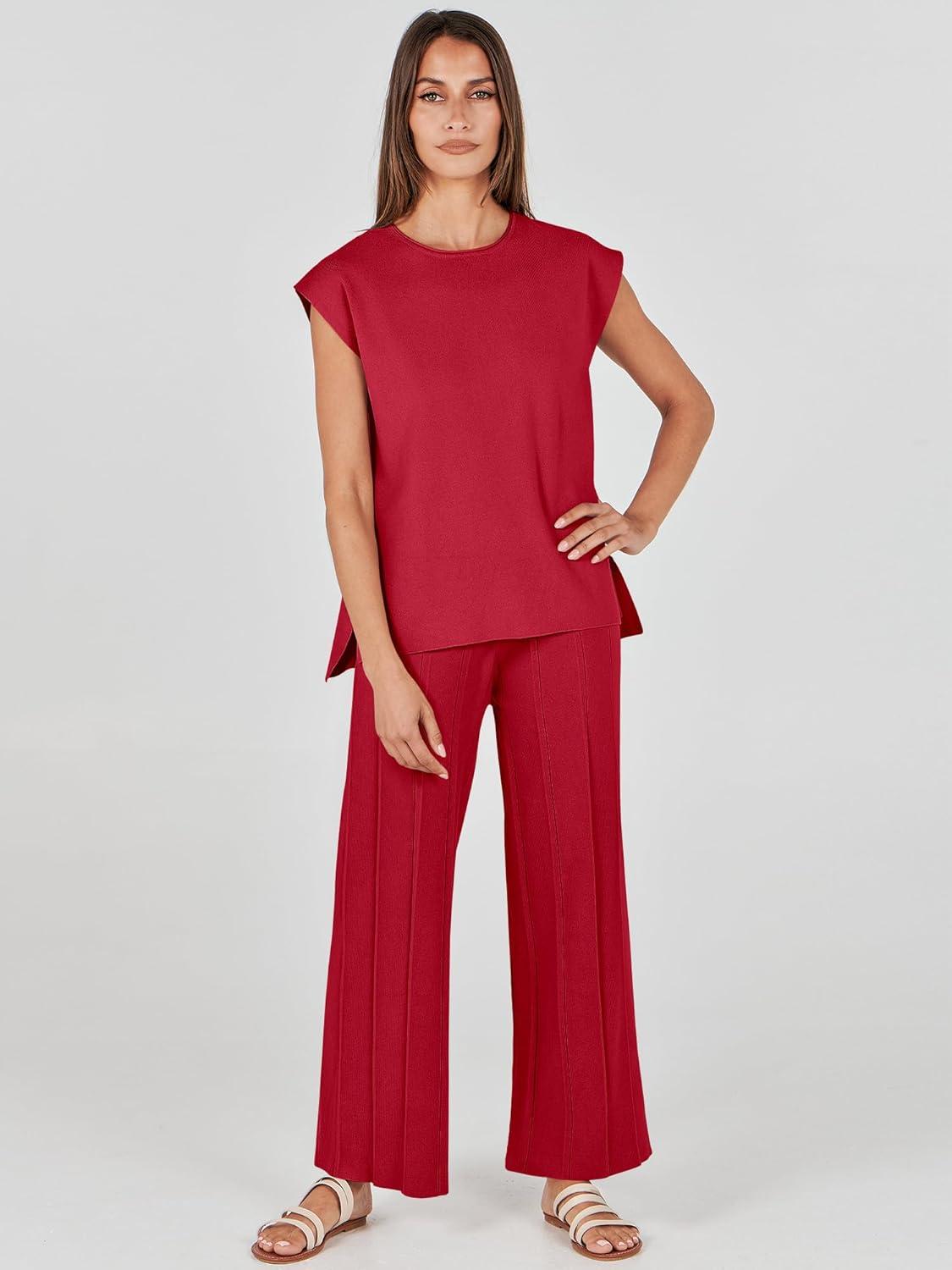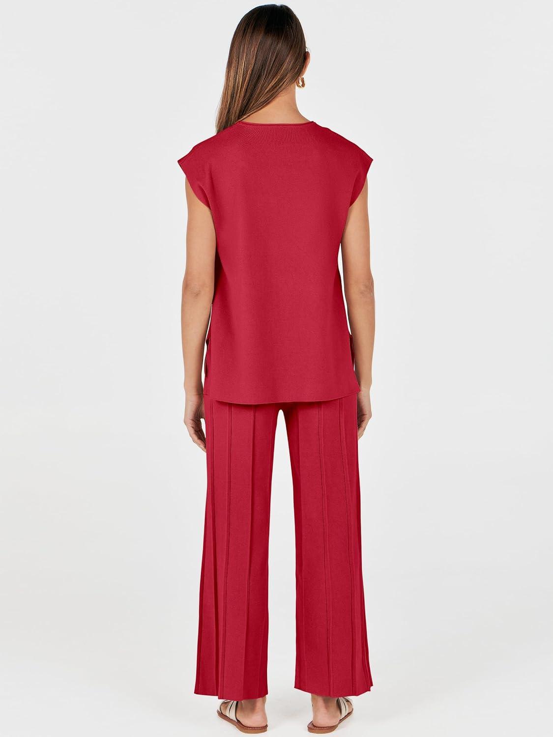 ANRABESS Women 2 Piece Lounge Sets Summer Casual Knit Sweater Vest Pant Set Beach Vacation Airport Clothes 2025 Fall Outfits(Red)