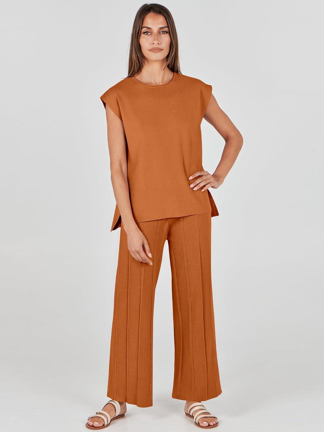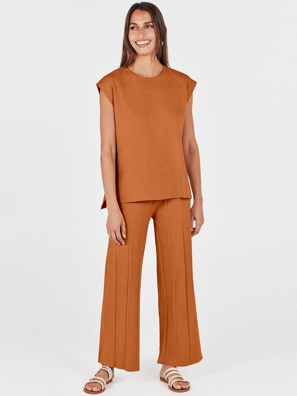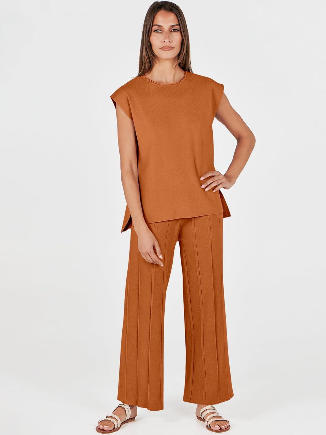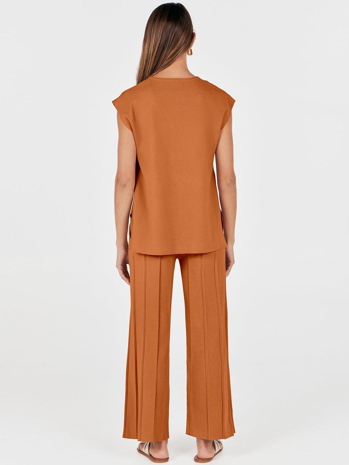 ANRABESS Women 2 Piece Lounge Sets Summer Casual Knit Sweater Vest Pant Set Beach Vacation Airport Clothes 2025 Fall Outfits(Rust)