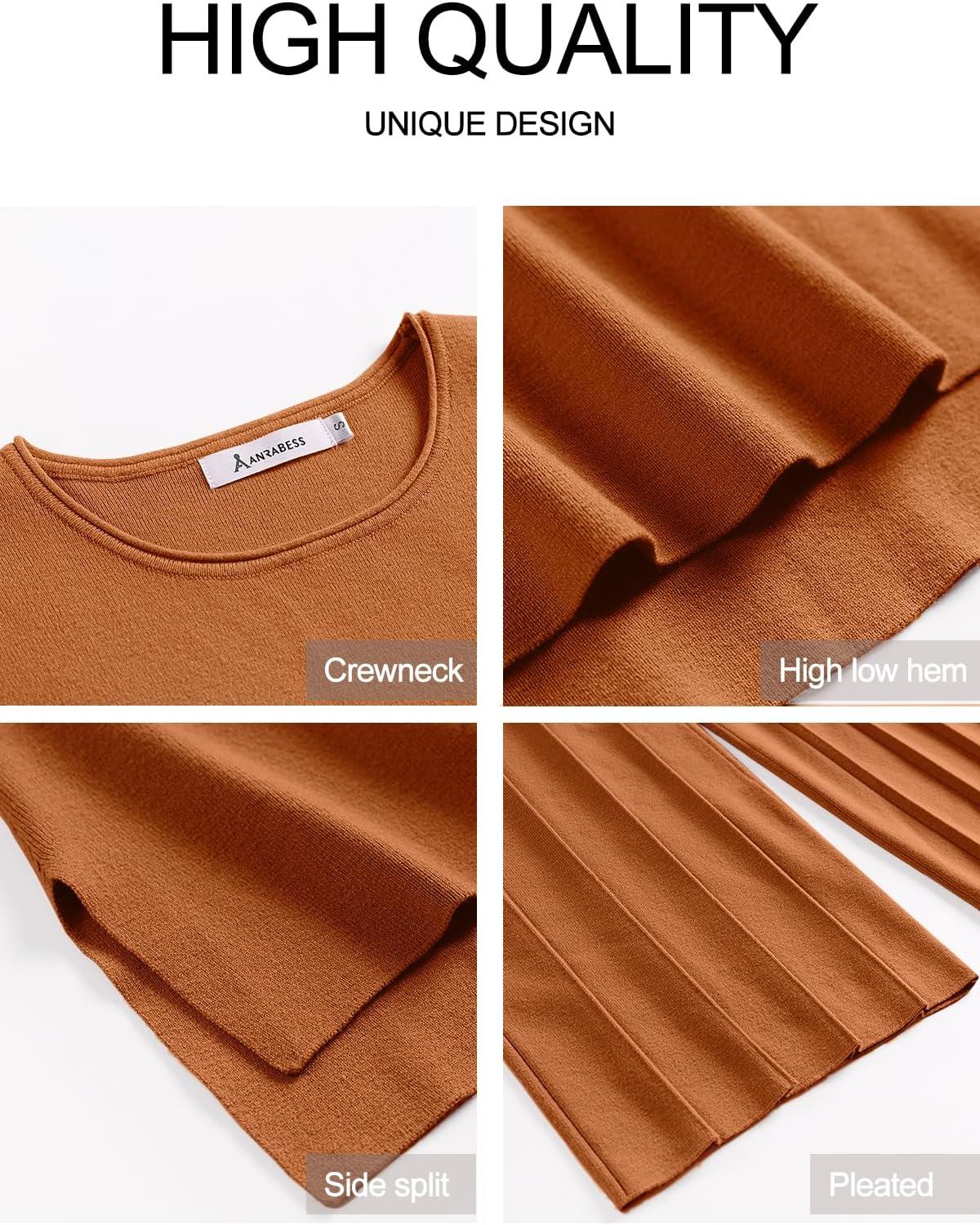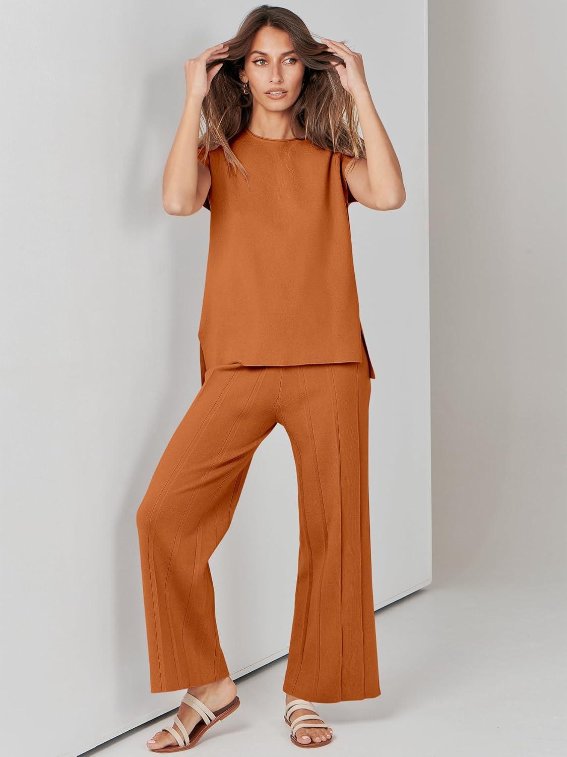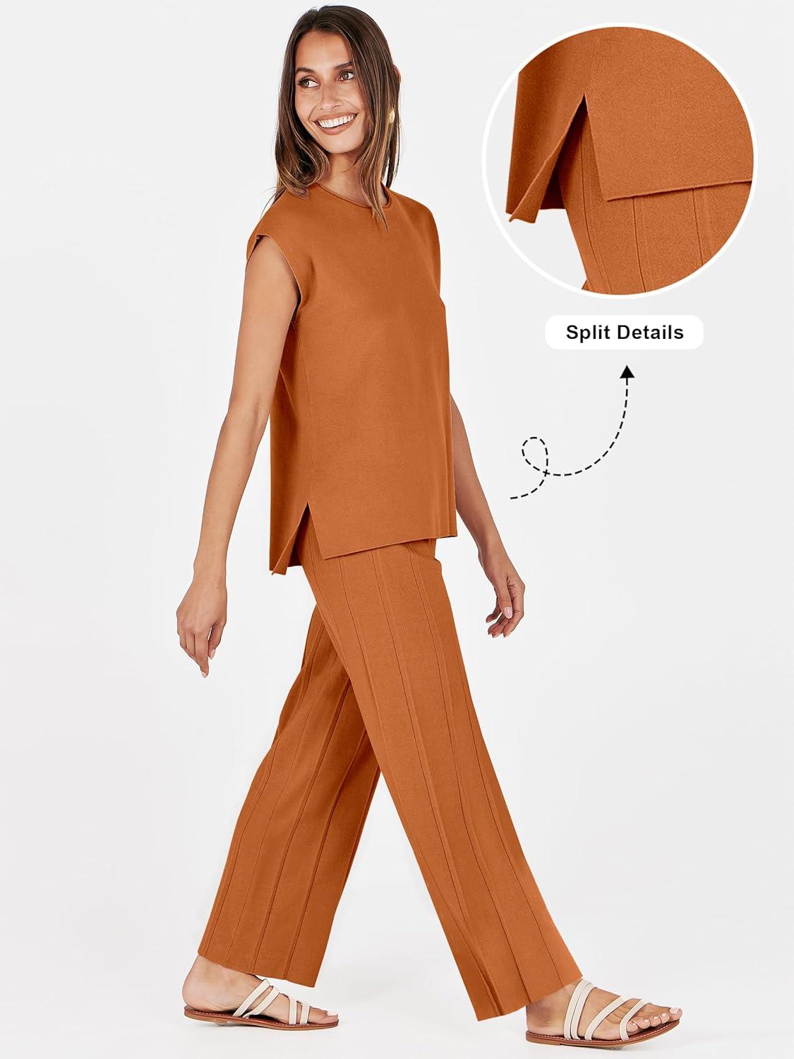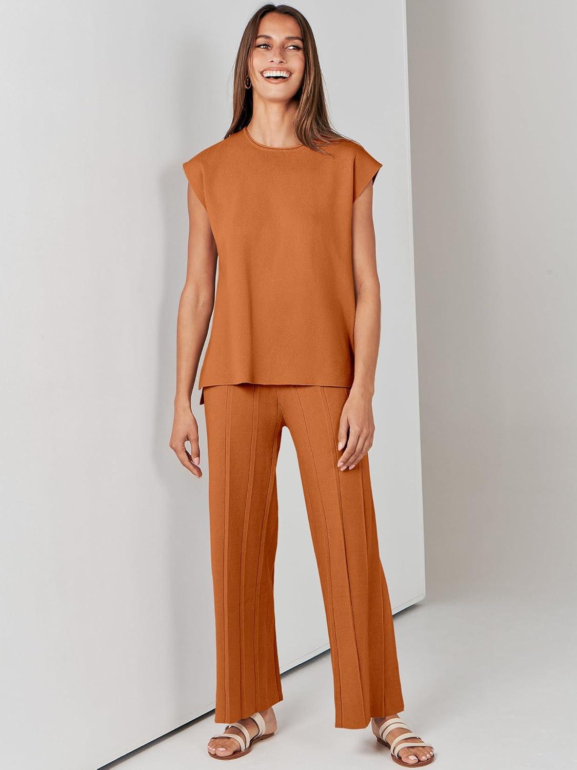 ANRABESS Women 2 Piece Lounge Sets Summer Casual Knit Sweater Vest Pant Set Beach Vacation Airport Clothes 2025 Fall Outfits(Rust)