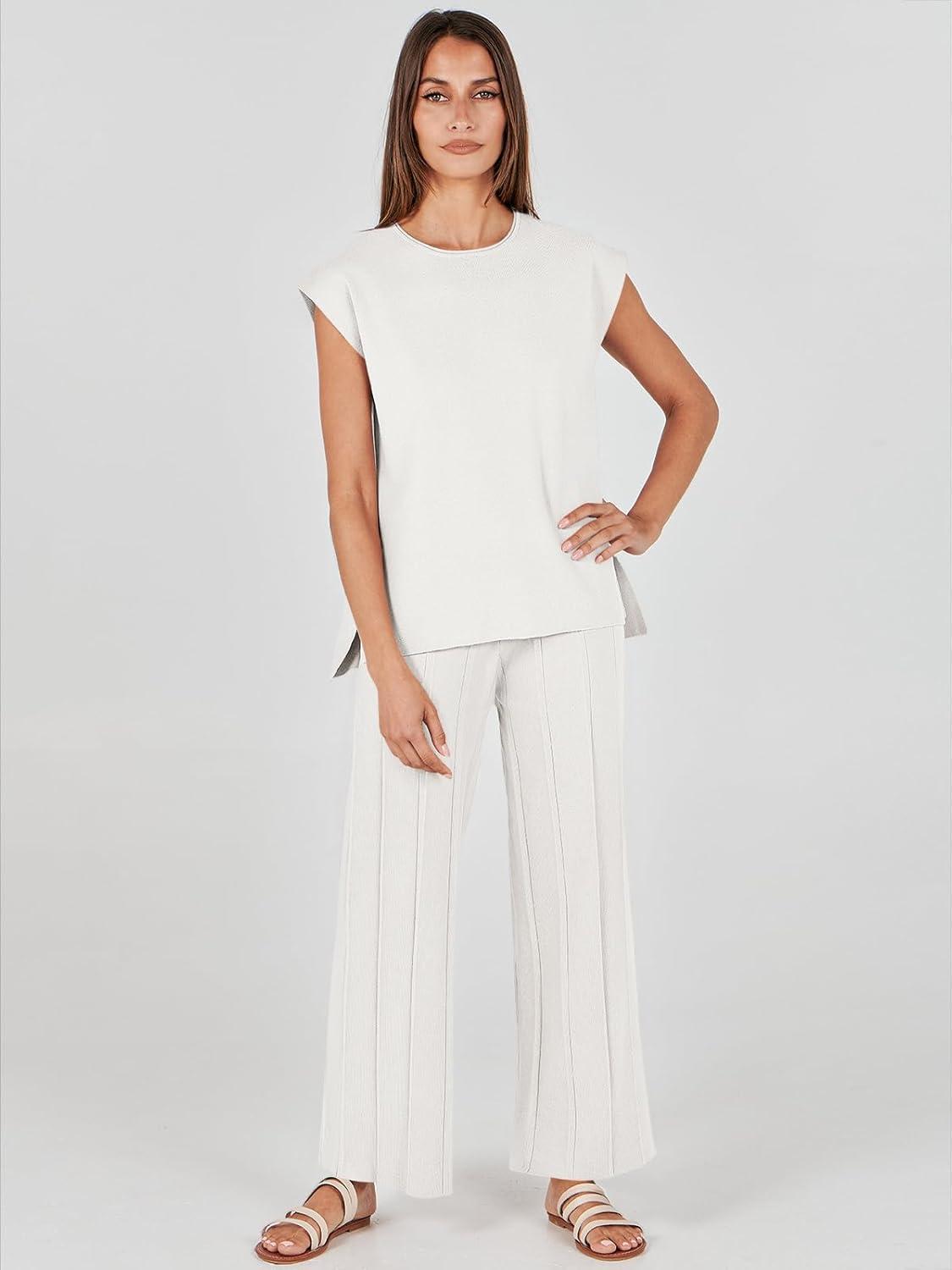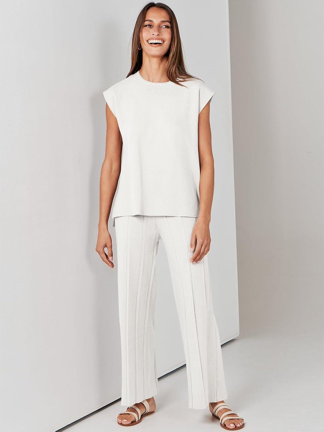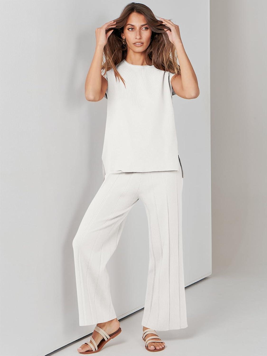 ANRABESS Women 2 Piece Lounge Sets Summer Casual Knit Sweater Vest Pant Set Beach Vacation Airport Clothes 2025 Fall Outfits(White)