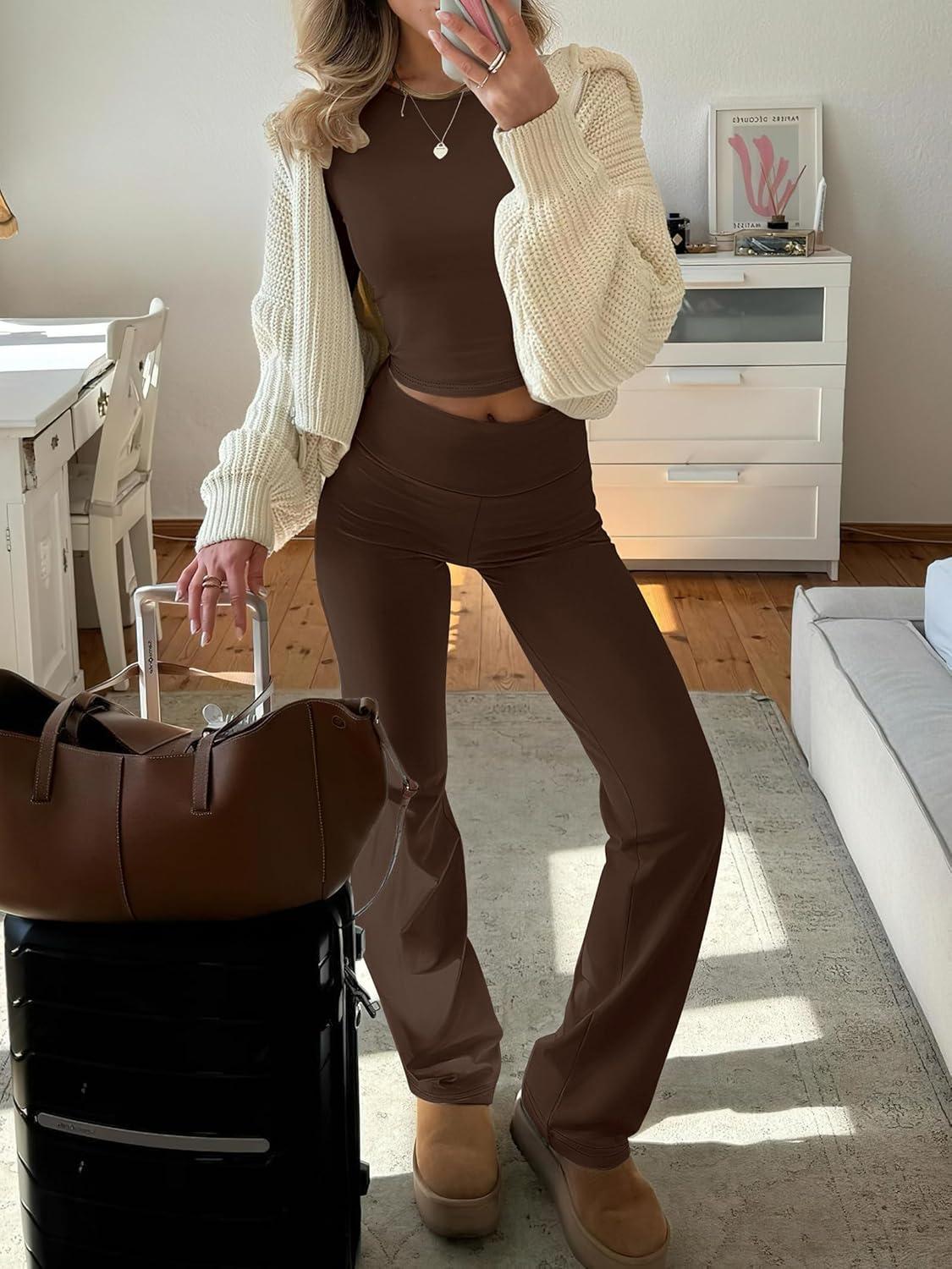 ANRABESS Women 2 Piece Outfits Fall Lounge Sets Long Sleeve Cropped Top Fold Over Flare Pants Comfy Pajamas Set Y2K Clothes(Coffee)