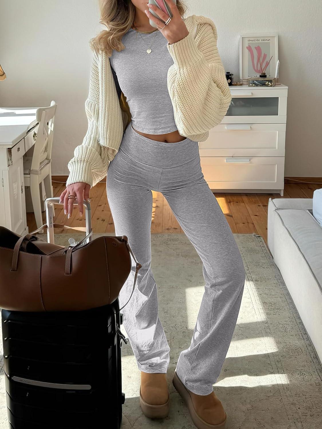 ANRABESS Women 2 Piece Outfits Fall Lounge Sets Long Sleeve Cropped Top Fold Over Flare Pants Comfy Pajamas Set Y2K Clothes(Grey)