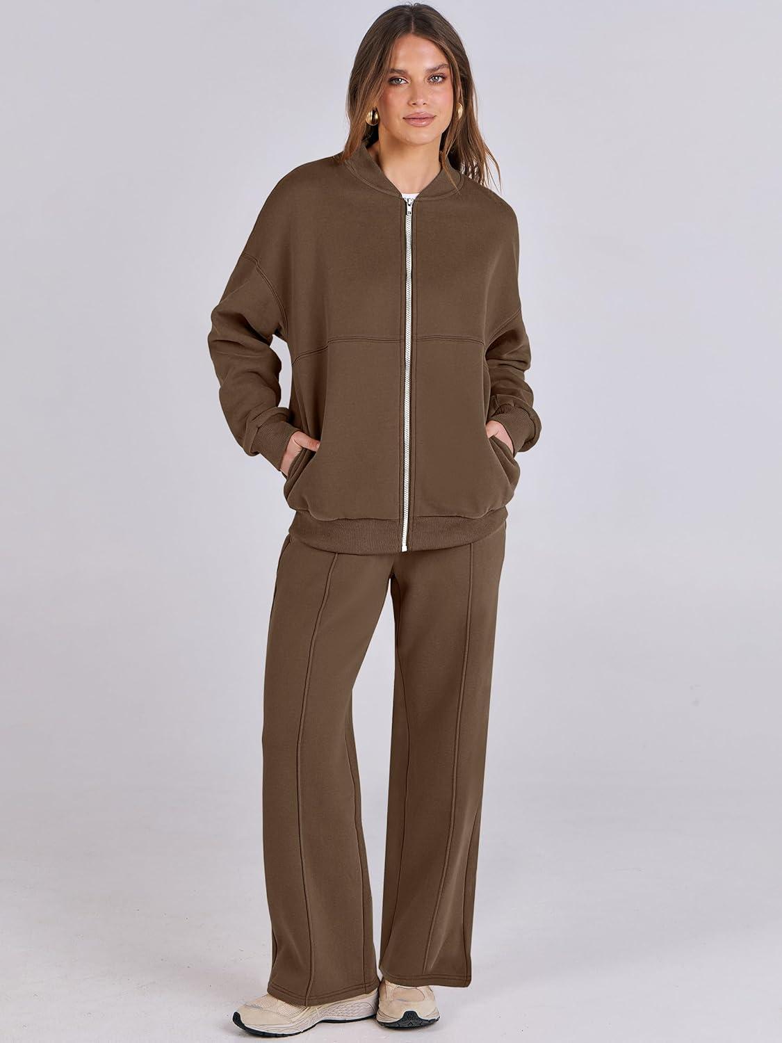 ANRABESS Women 2 Piece Outfits Lounge Set Oversized Zip Up Sweatshirt Jacket Sweatpant Matching Sweat Sets Winter Sweatsuits(Dark Brown)