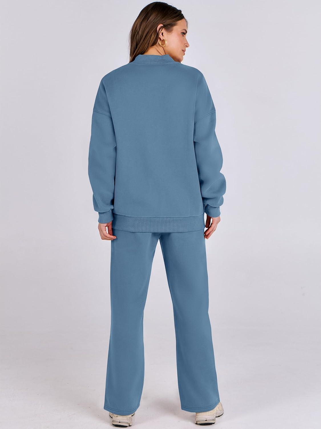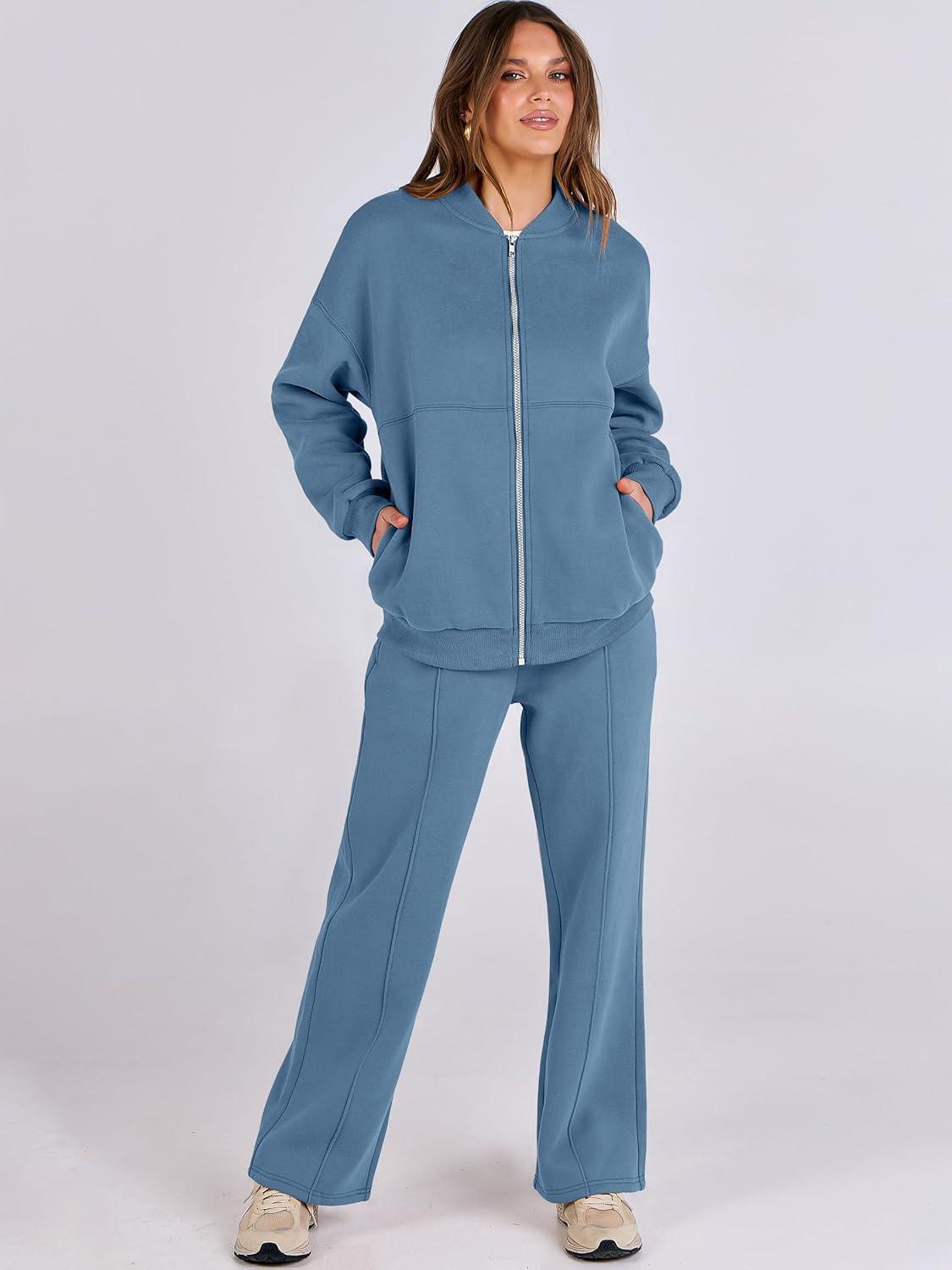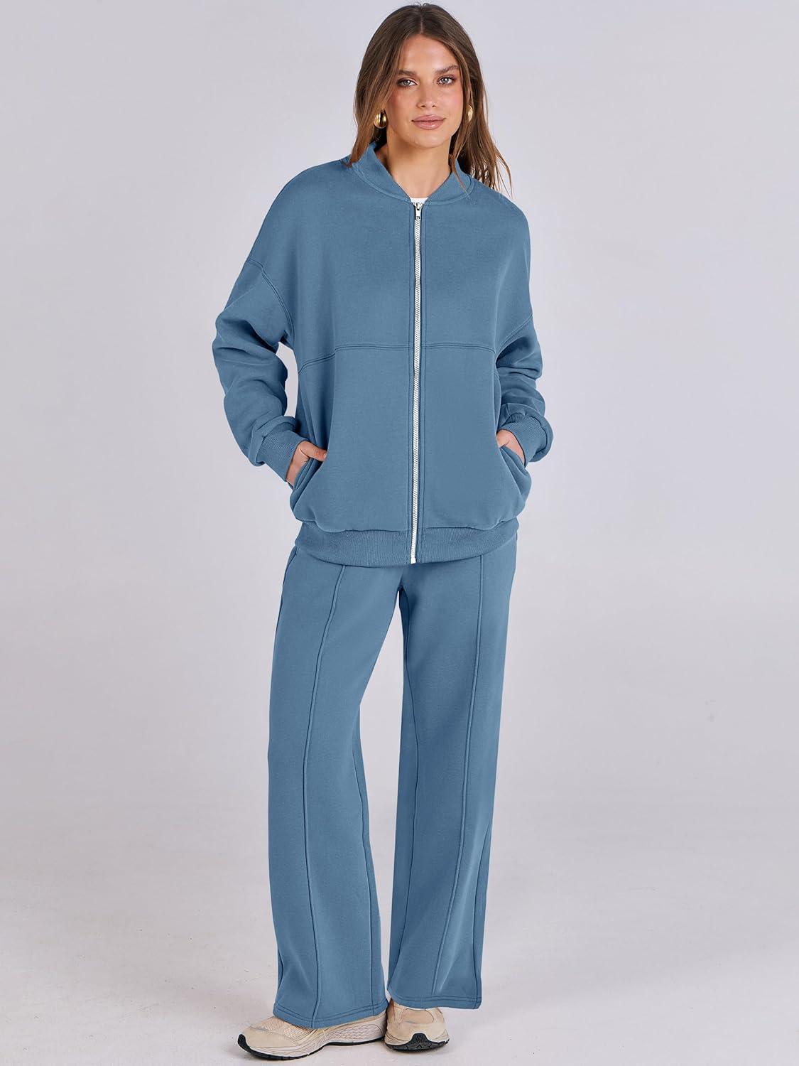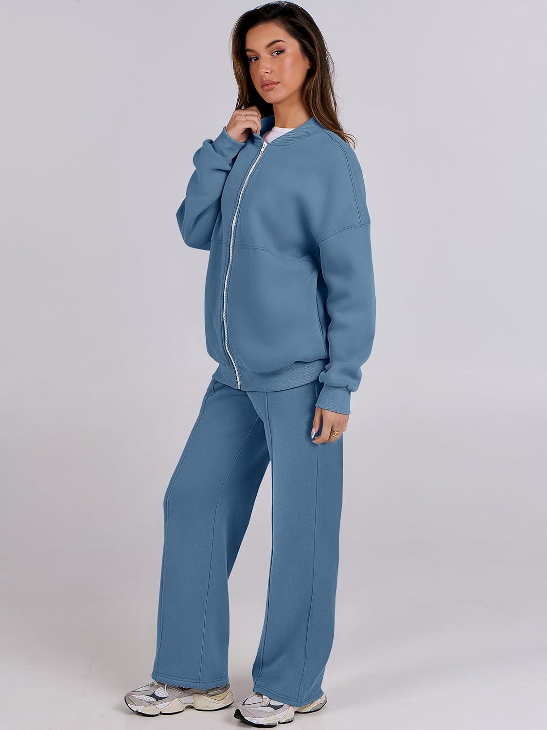 ANRABESS Women 2 Piece Outfits Lounge Set Oversized Zip Up Sweatshirt Jacket Sweatpant Matching Sweat Sets Winter Sweatsuits(Haze Blue)