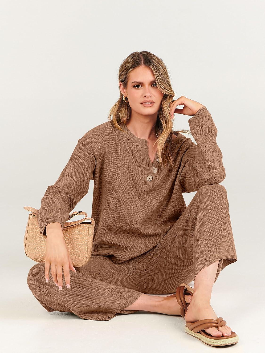 ANRABESS Women 2 Piece Outfits Oversized Loose Waffle Knit Sweater Set 2025 Fall Trendy Matching Lounge Sets Cozy Clothes(Light Brown)