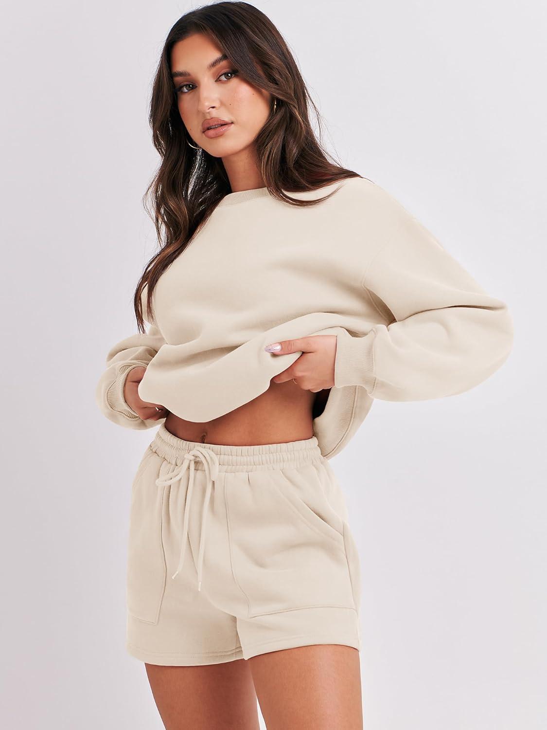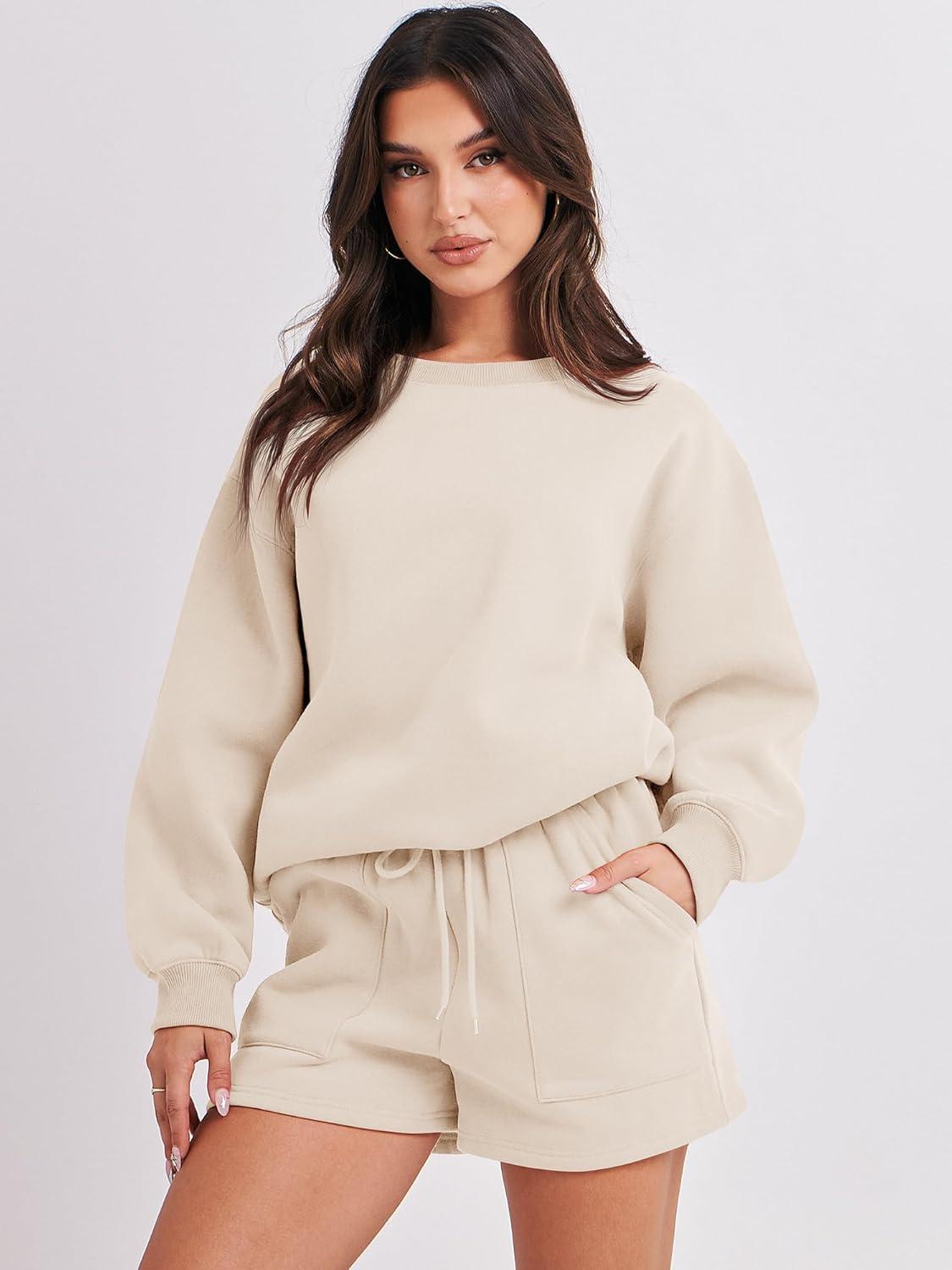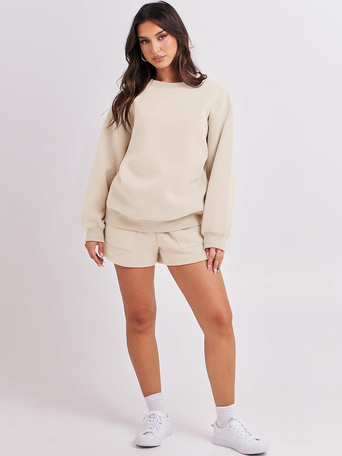 ANRABESS Women 2 Piece Outfits Sweat Shorts Sets 2025 Oversized Casual Lounge Matching Set Sweatsuit Tracksuit Fall Clothes(Apricot)