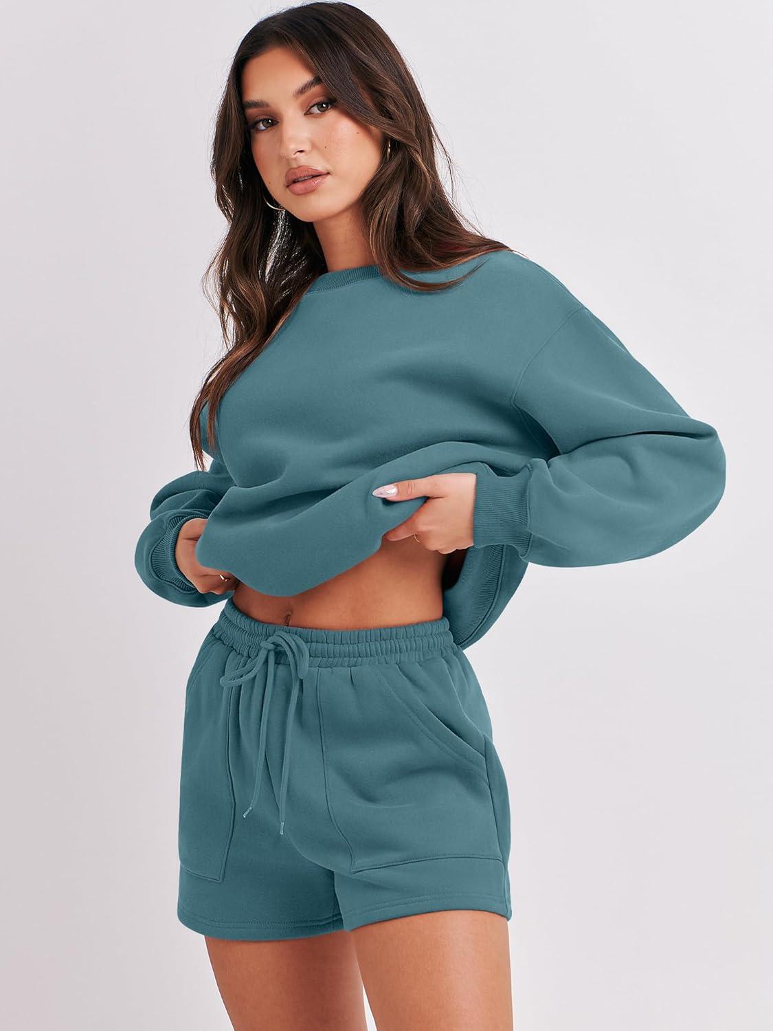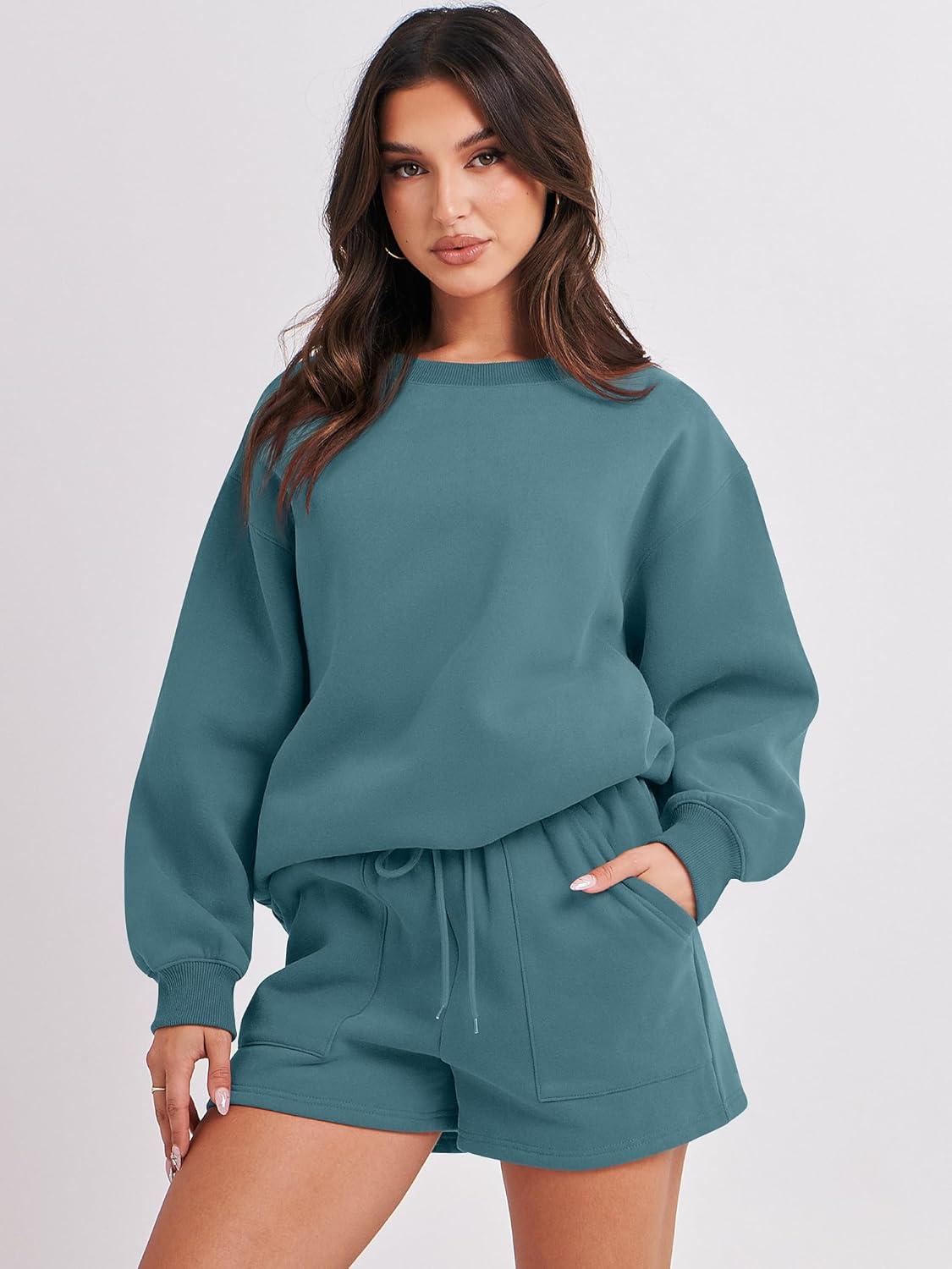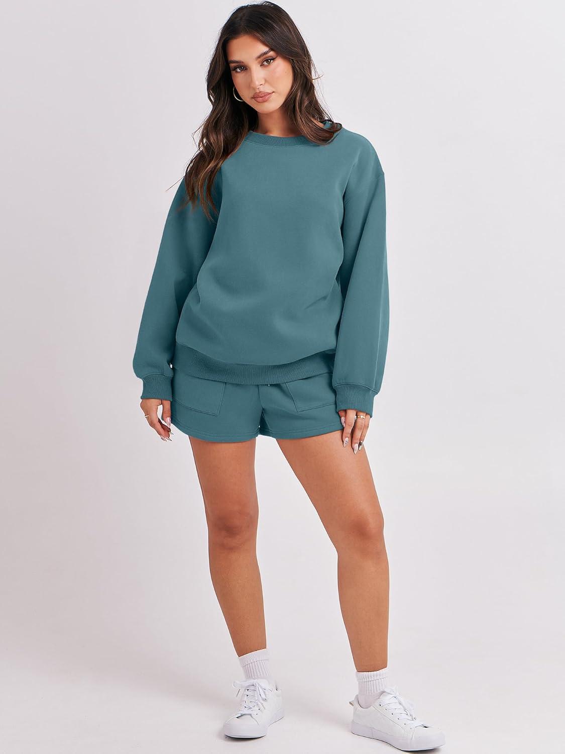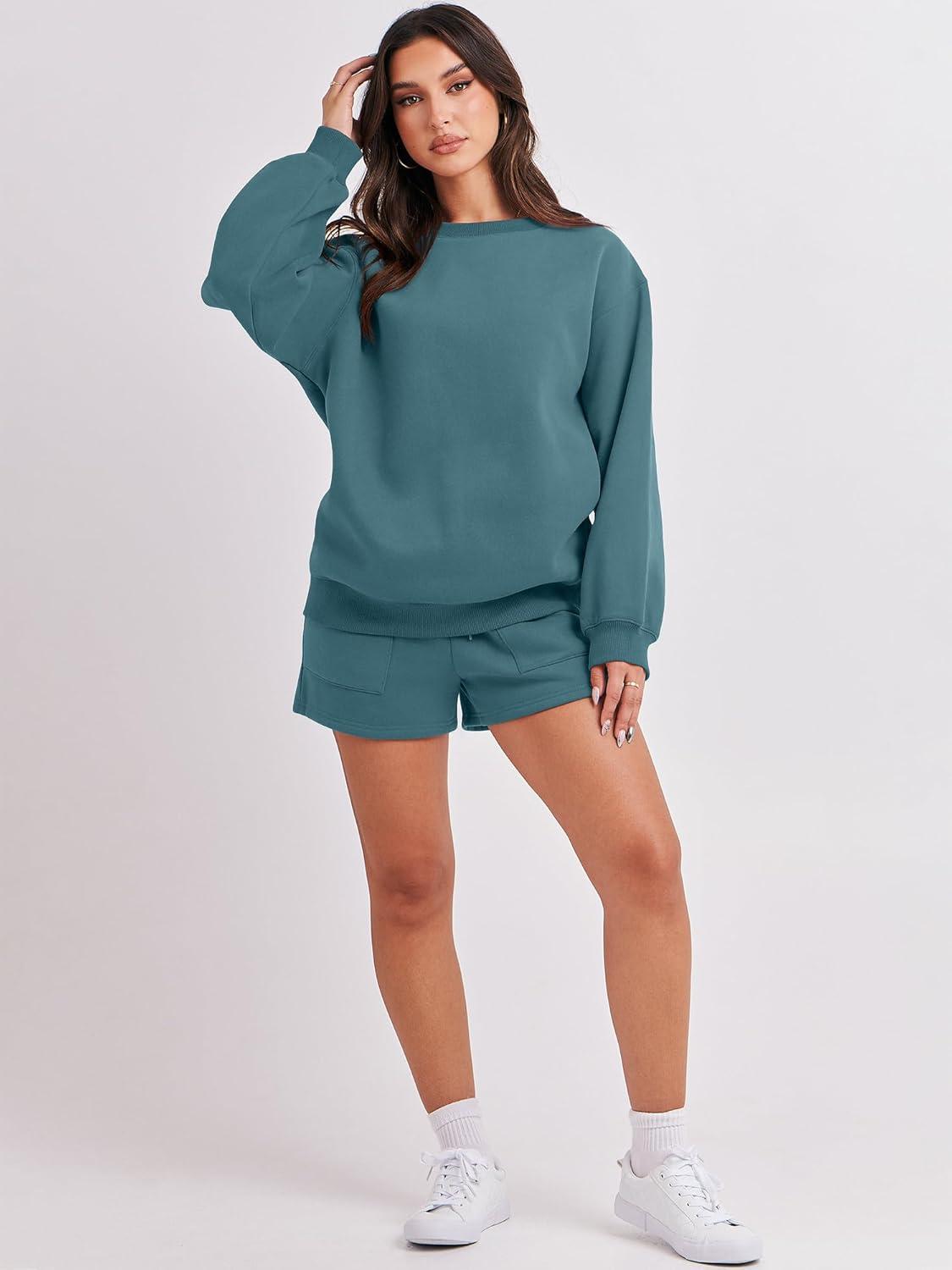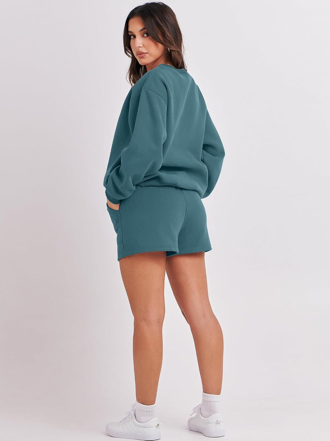 ANRABESS Women 2 Piece Outfits Sweat Shorts Sets 2025 Oversized Casual Lounge Matching Set Sweatsuit Tracksuit Fall Clothes(Lake)