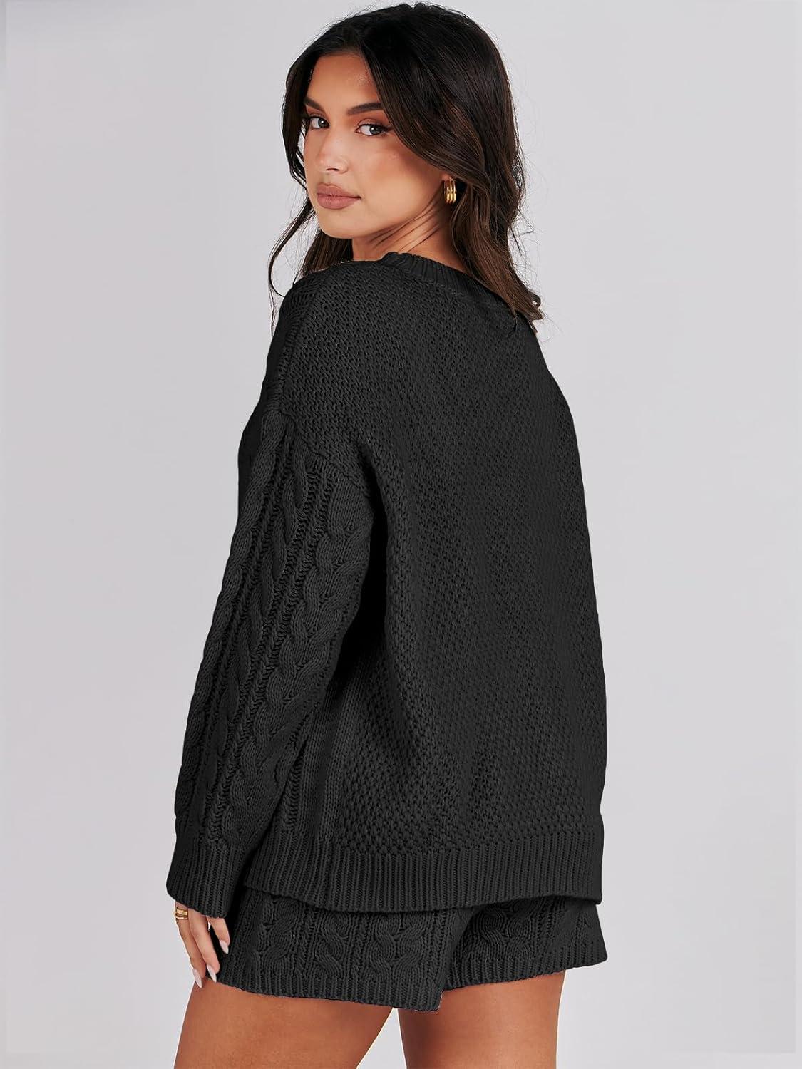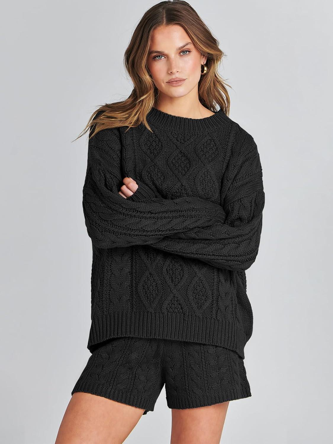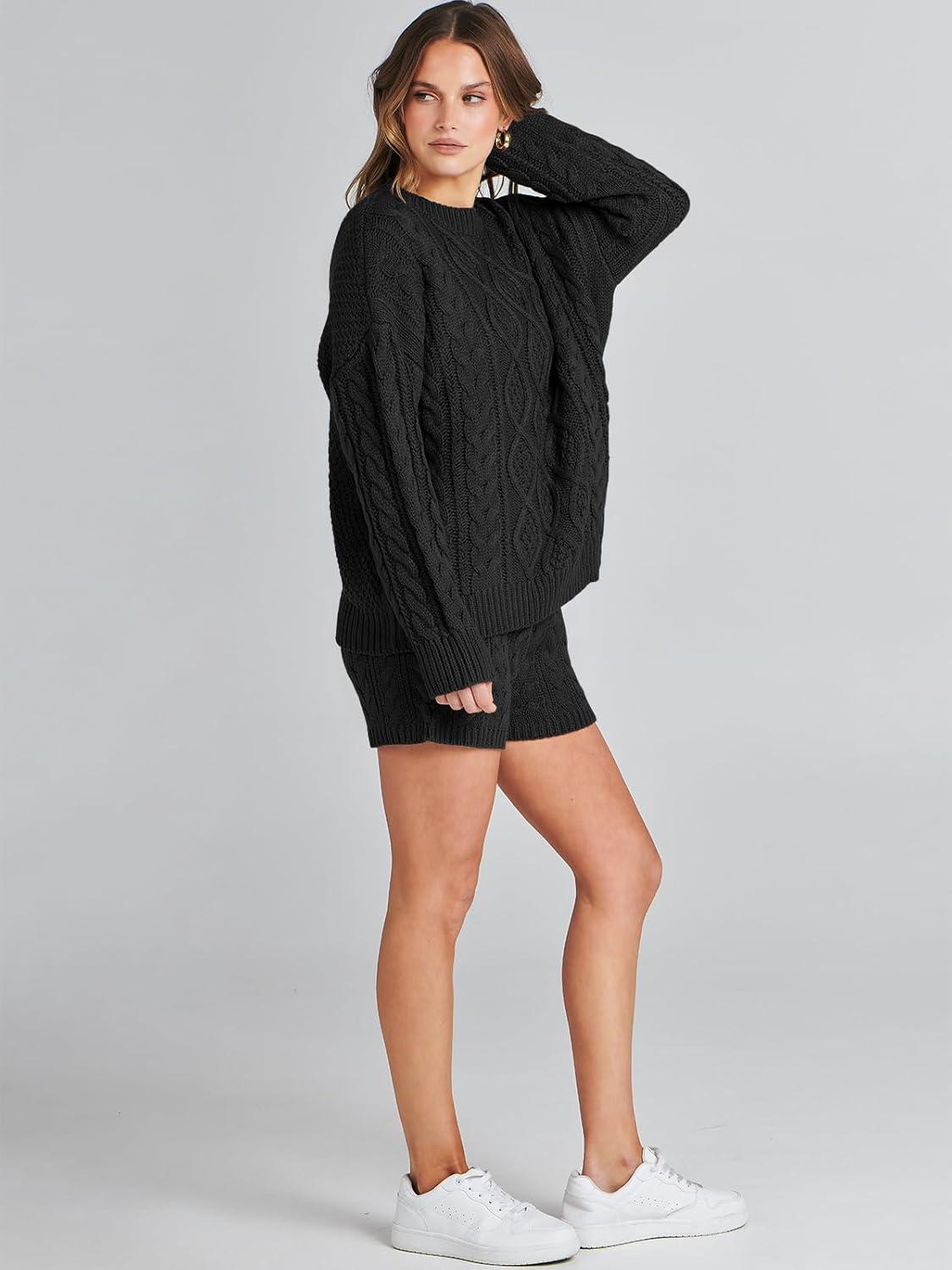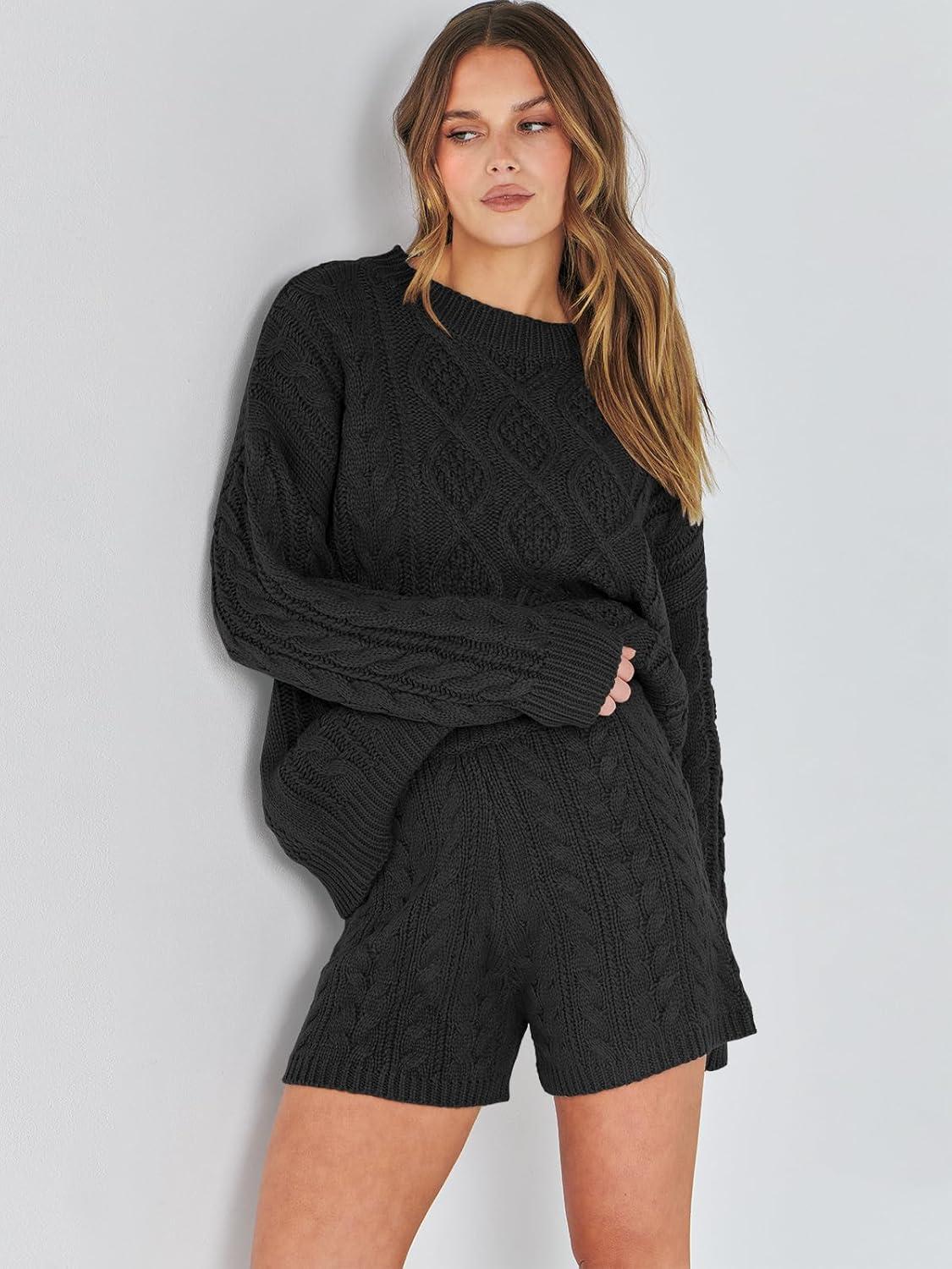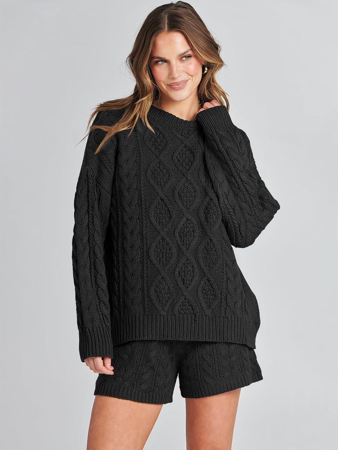 ANRABESS Women 2 Piece Outfits Sweater Lounge Loungewear Sets 2025 Winter Cable Knit Oversized Sweaters Shorts Matching Sets(Black)