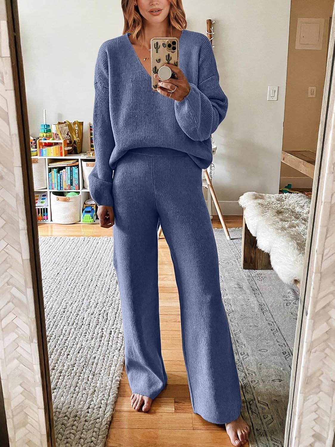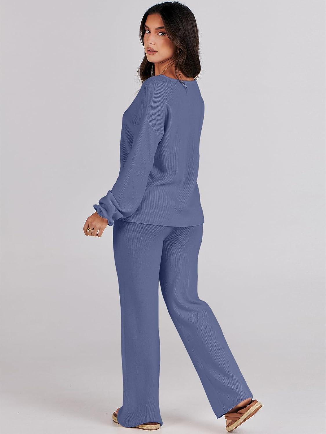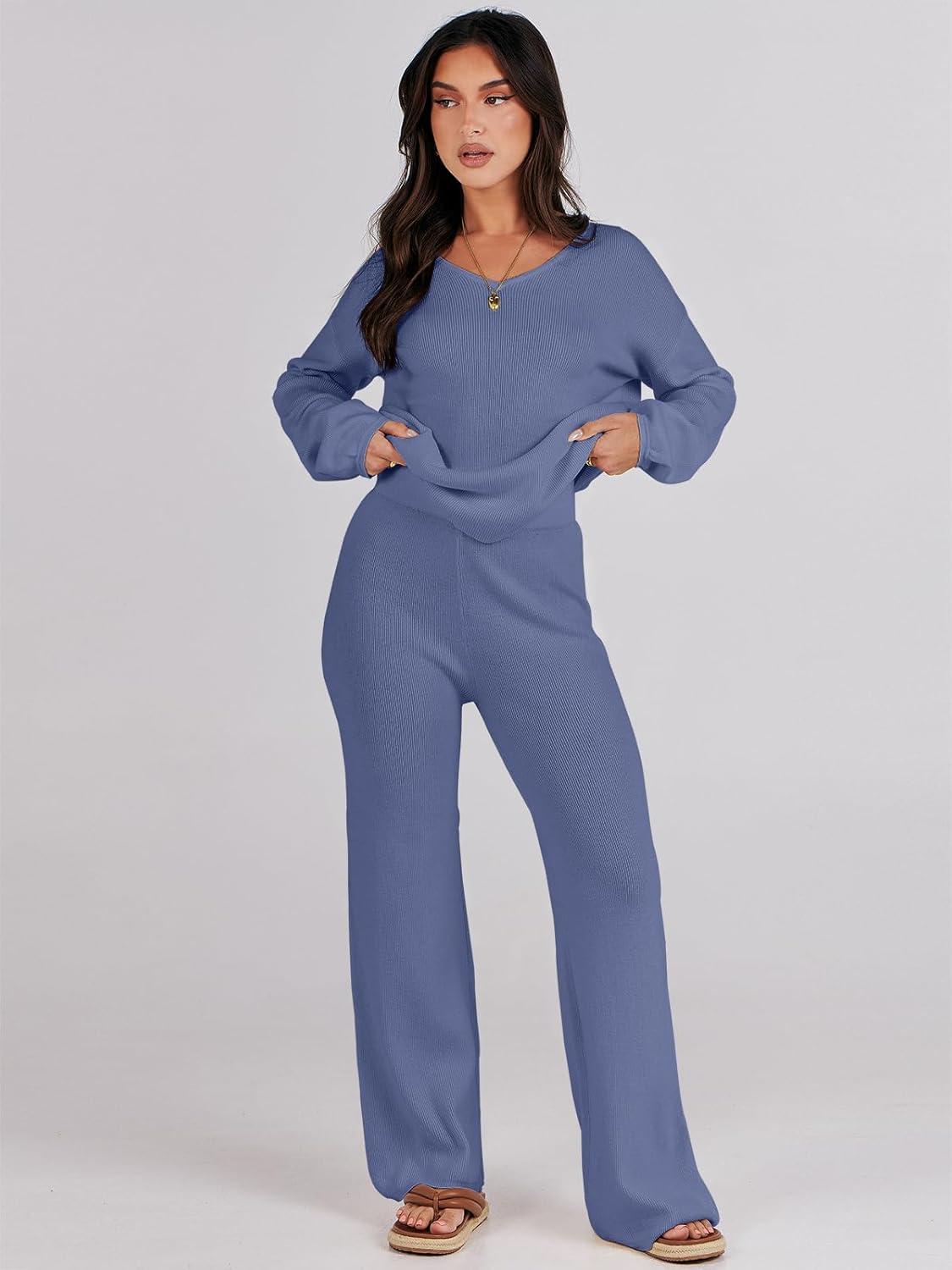 ANRABESS Women 2 Piece Outfits Sweater Lounge Sets Long Sleeve Cable Knit Pullover and Wide Leg Pants Tracksuit Matching Set(Grey Blue)