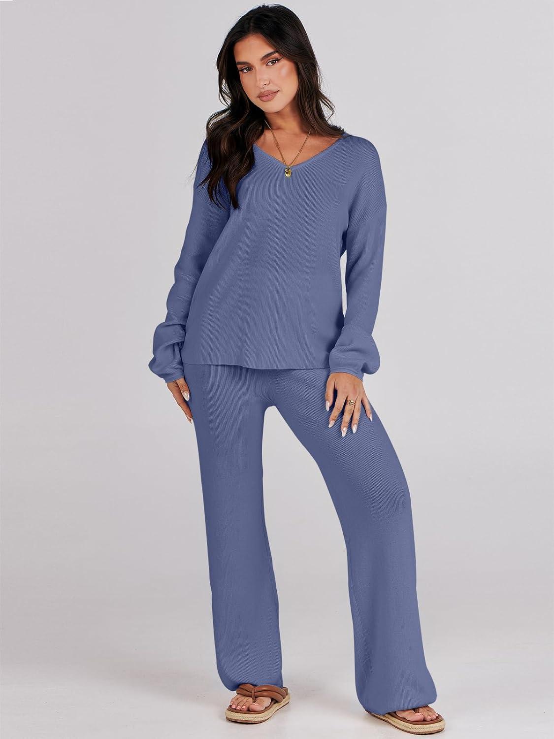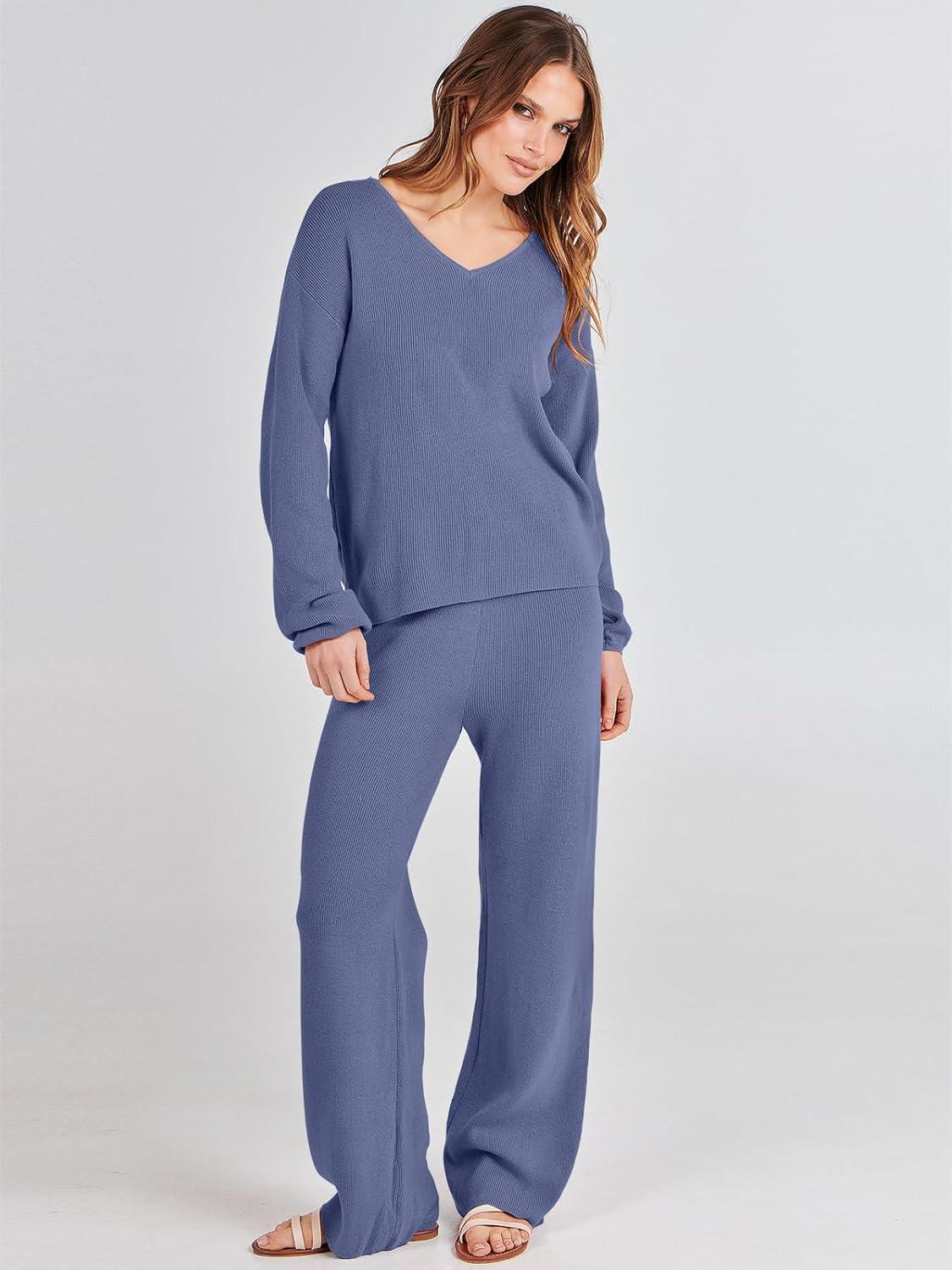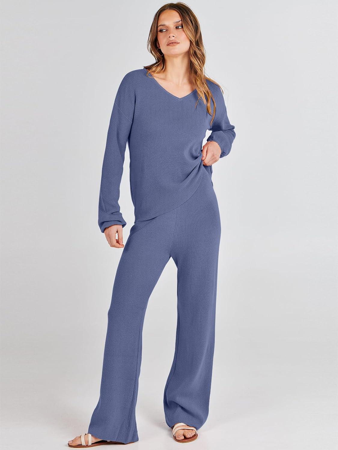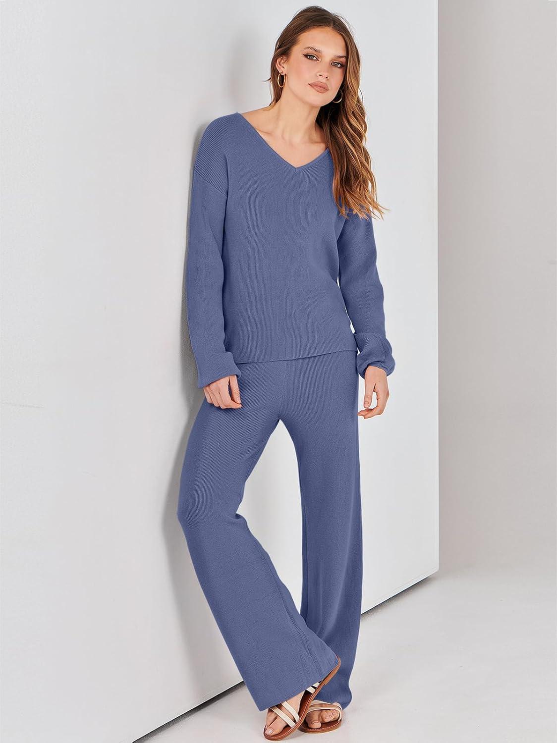 ANRABESS Women 2 Piece Outfits Sweater Lounge Sets Long Sleeve Cable Knit Pullover and Wide Leg Pants Tracksuit Matching Set(Grey Blue)