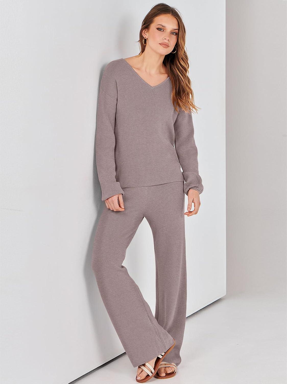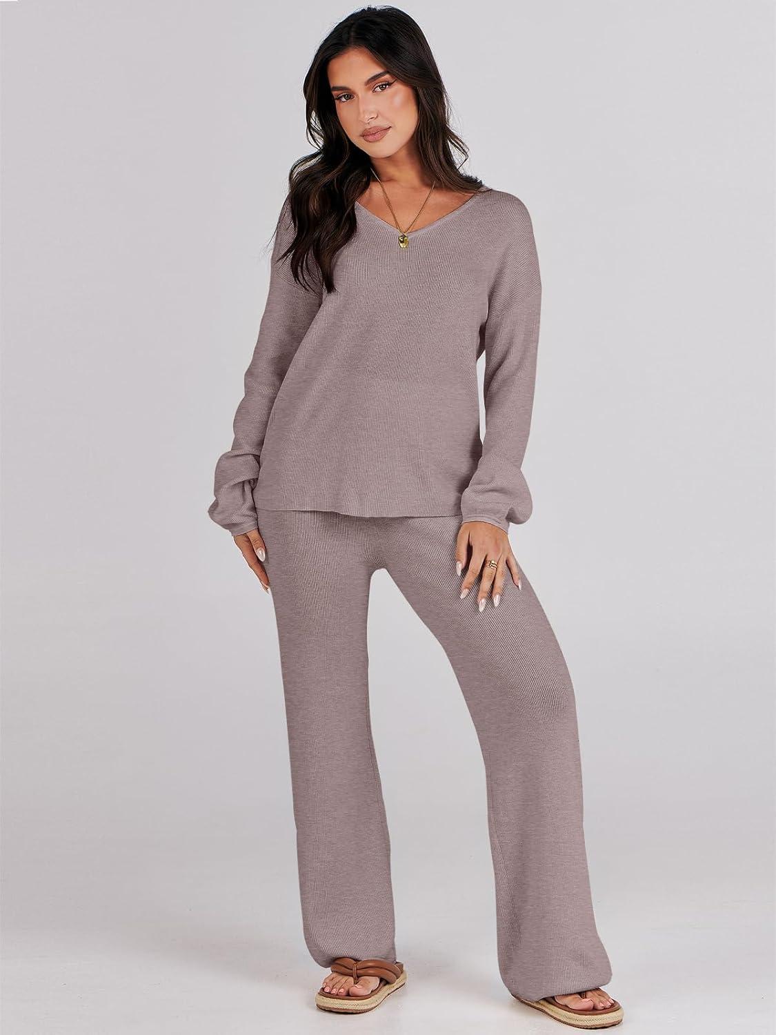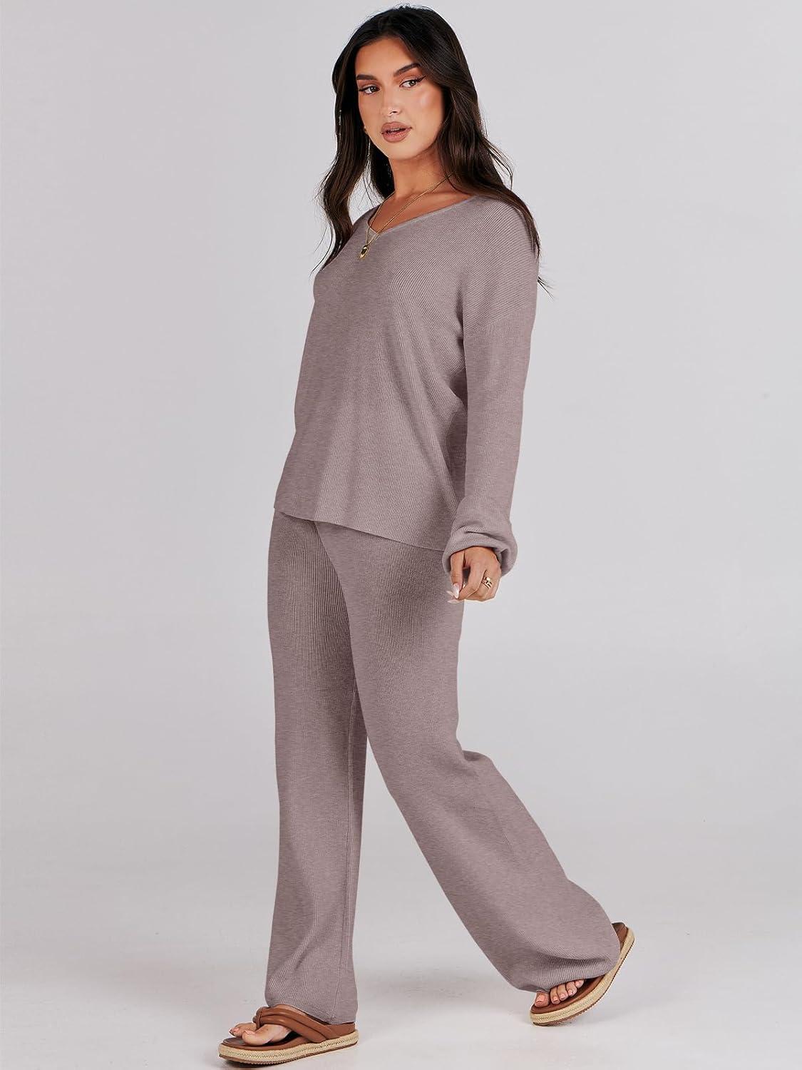 ANRABESS Women 2 Piece Outfits Sweater Lounge Sets Long Sleeve Cable Knit Pullover and Wide Leg Pants Tracksuit Matching Set(Red Khaki)