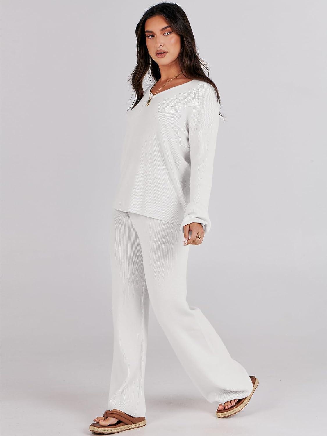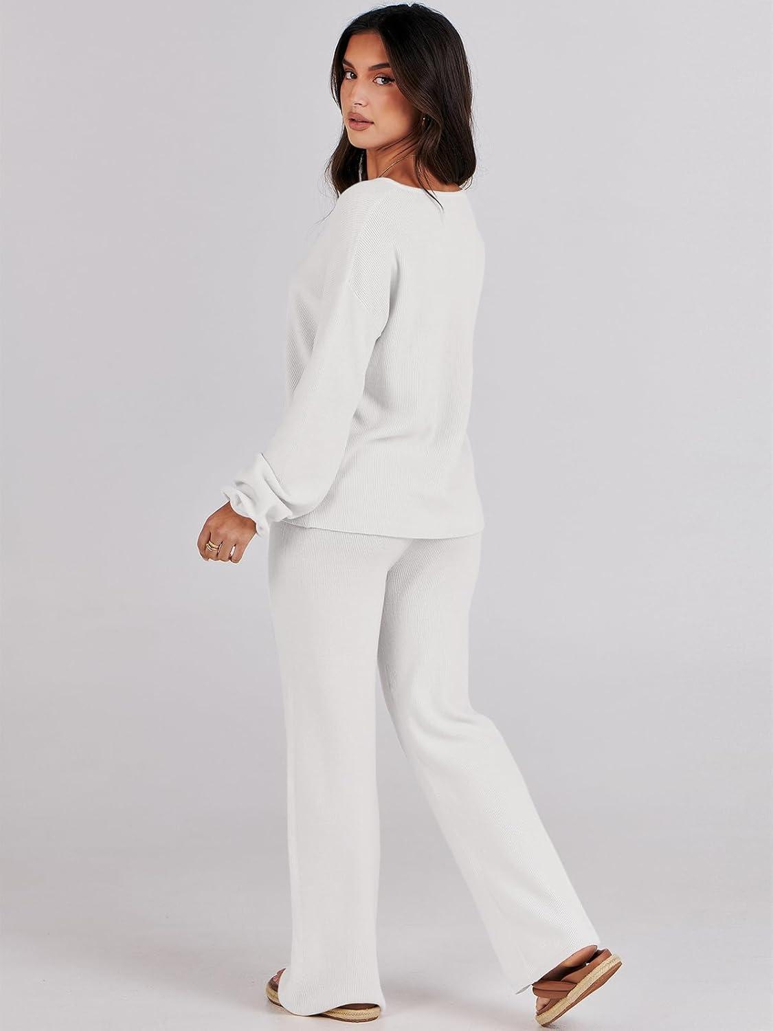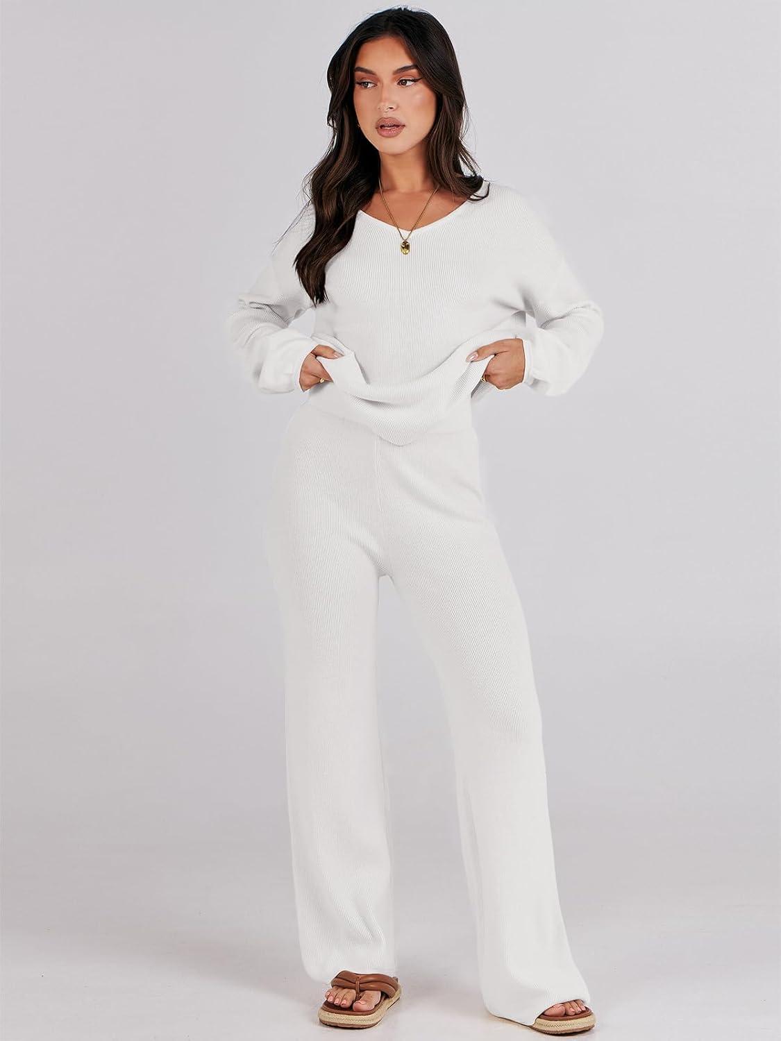 ANRABESS Women 2 Piece Outfits Sweater Lounge Sets Long Sleeve Cable Knit Pullover and Wide Leg Pants Tracksuit Matching Set(White)