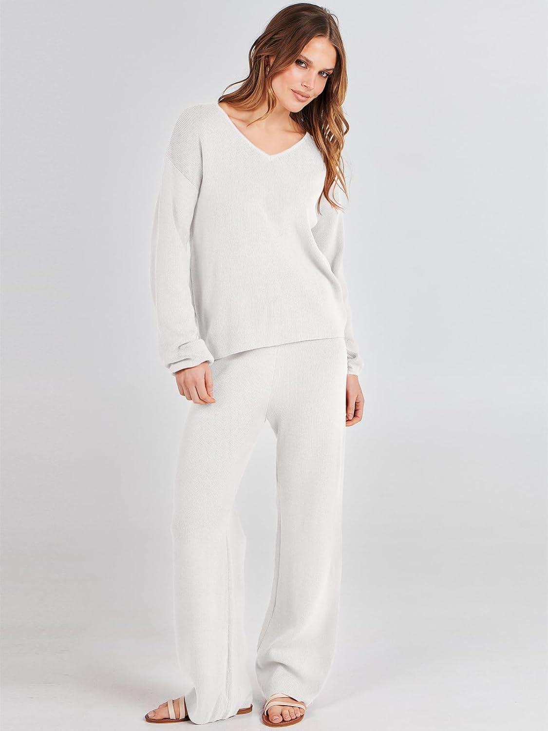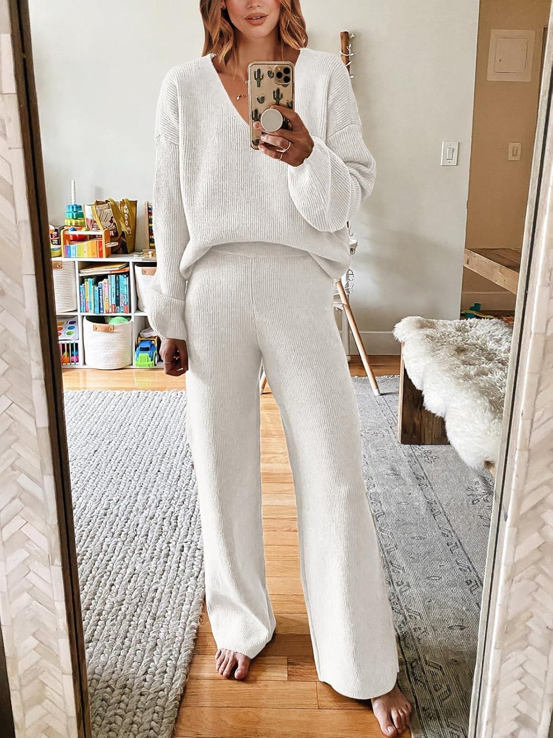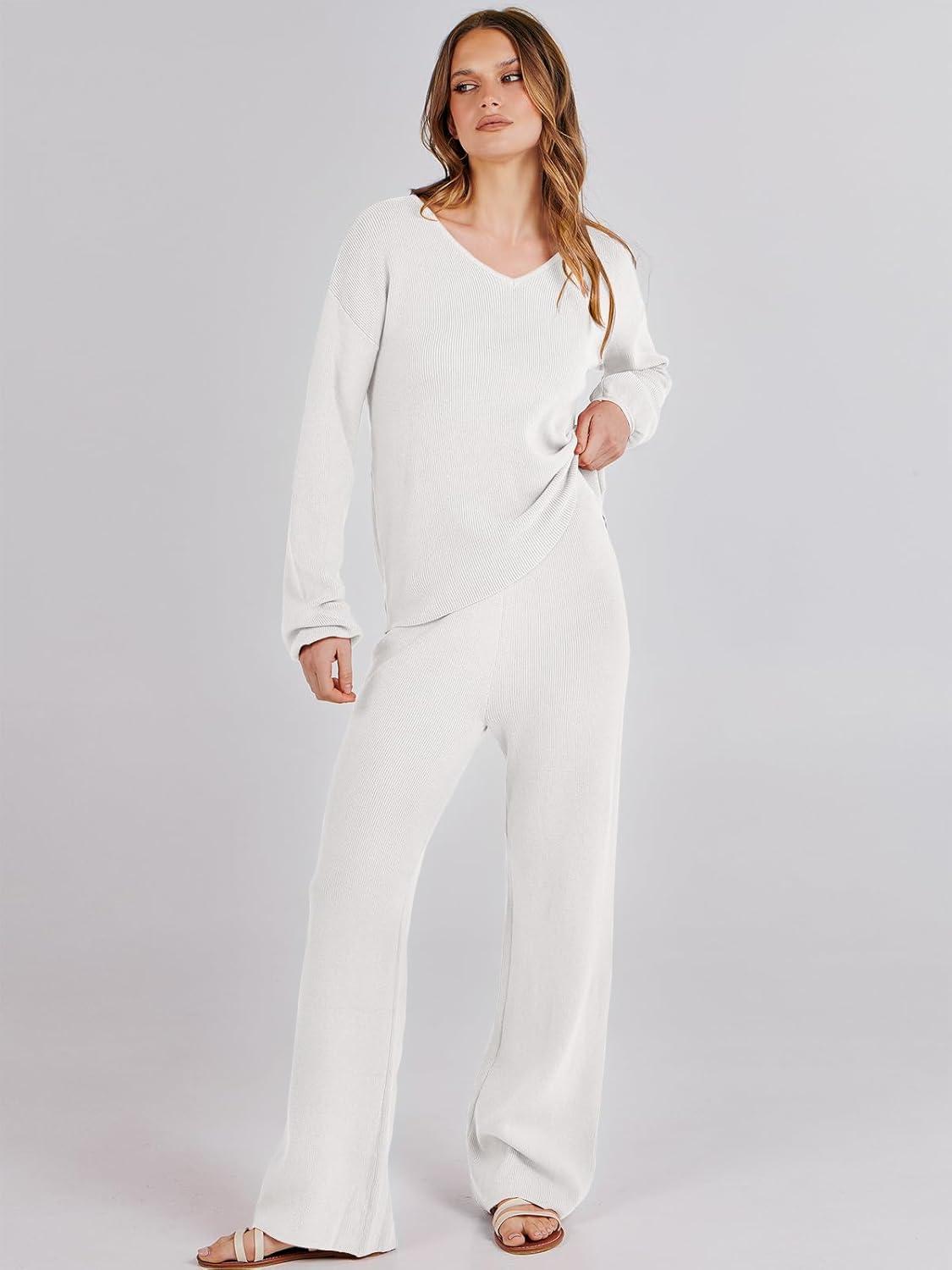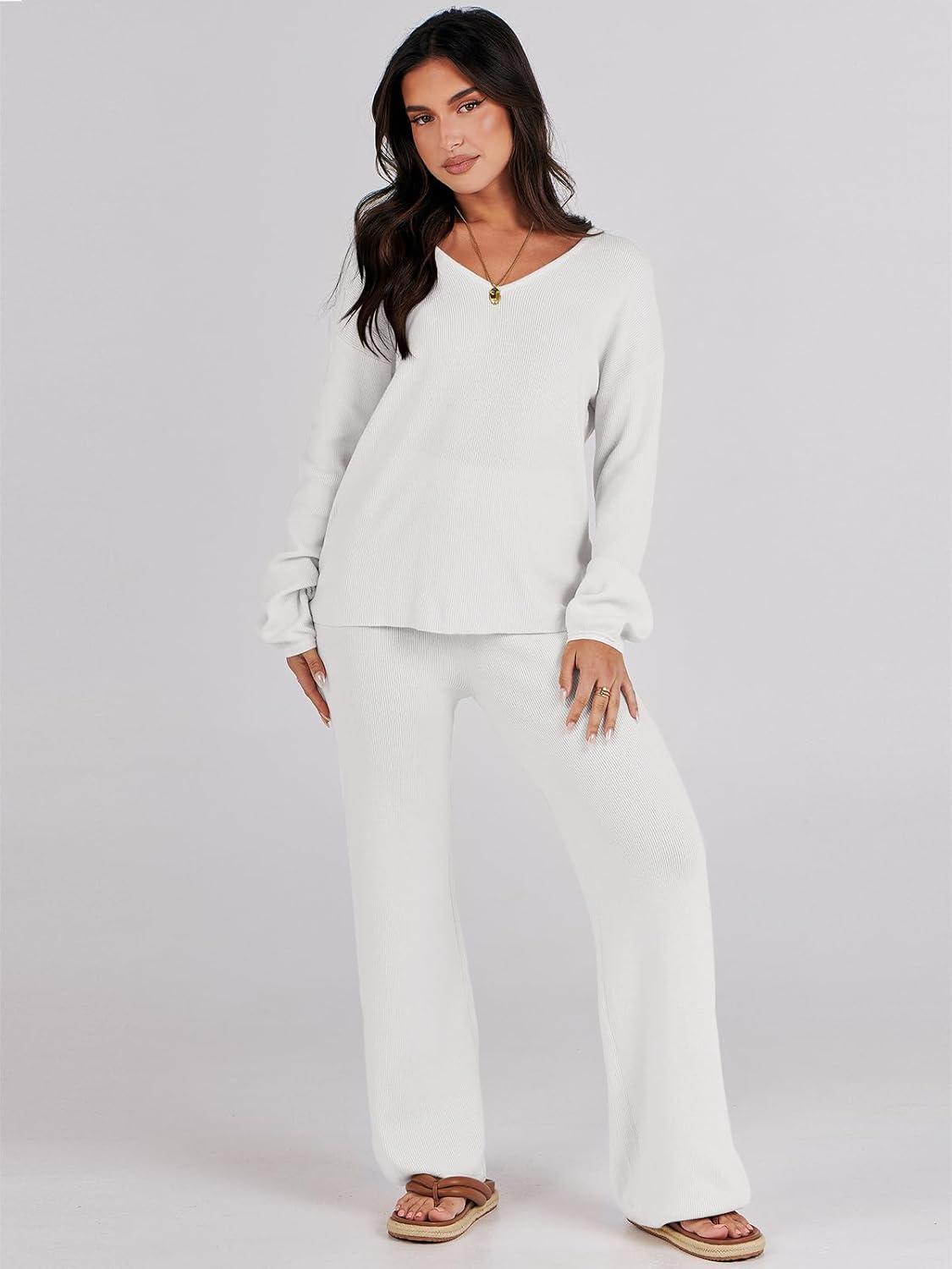 ANRABESS Women 2 Piece Outfits Sweater Lounge Sets Long Sleeve Cable Knit Pullover and Wide Leg Pants Tracksuit Matching Set(White)