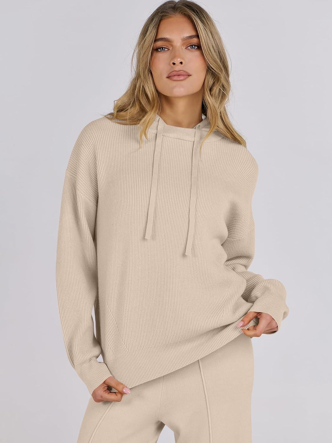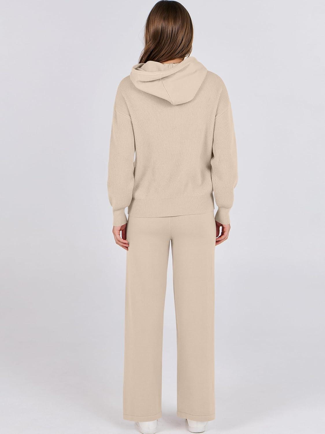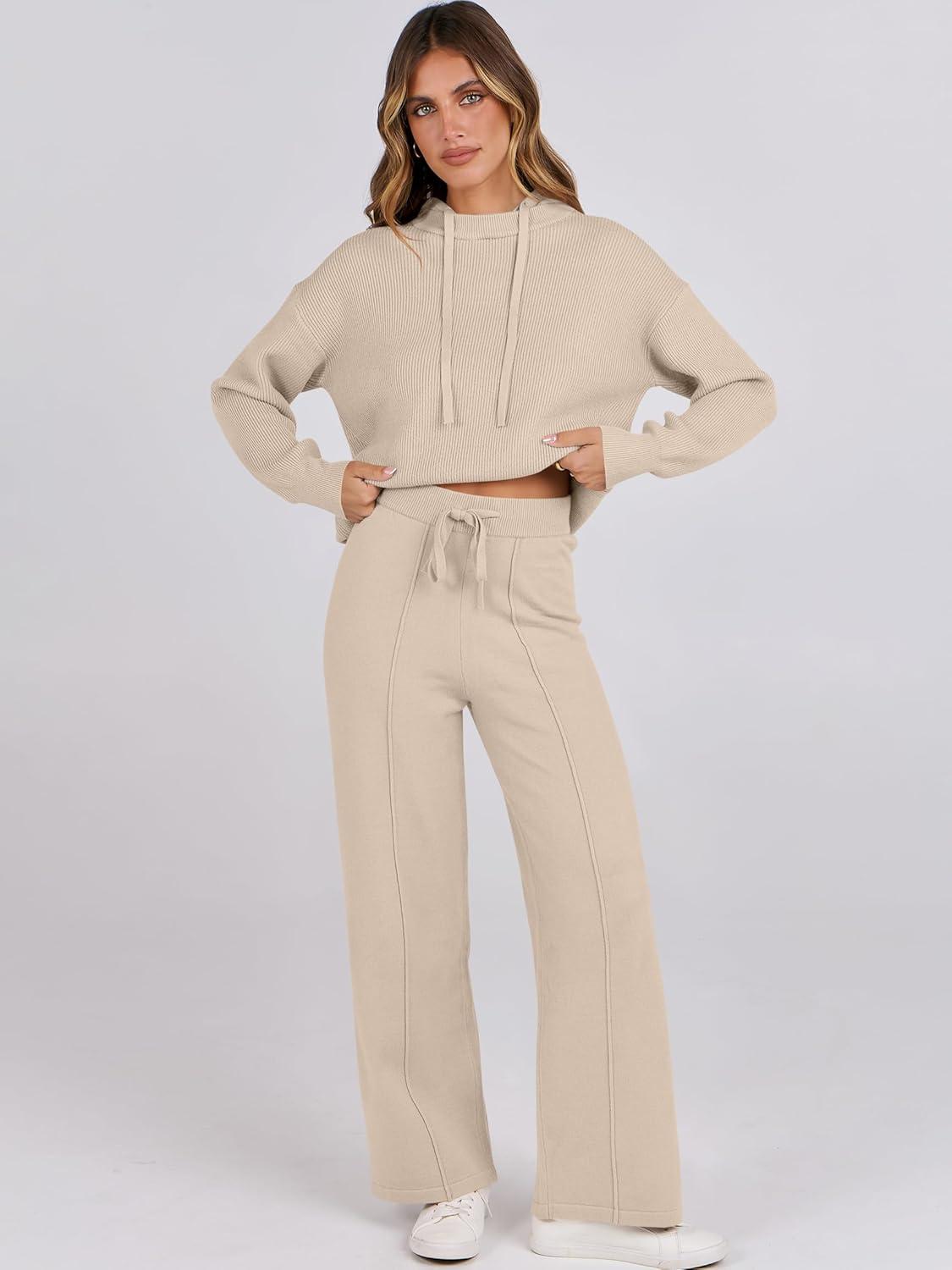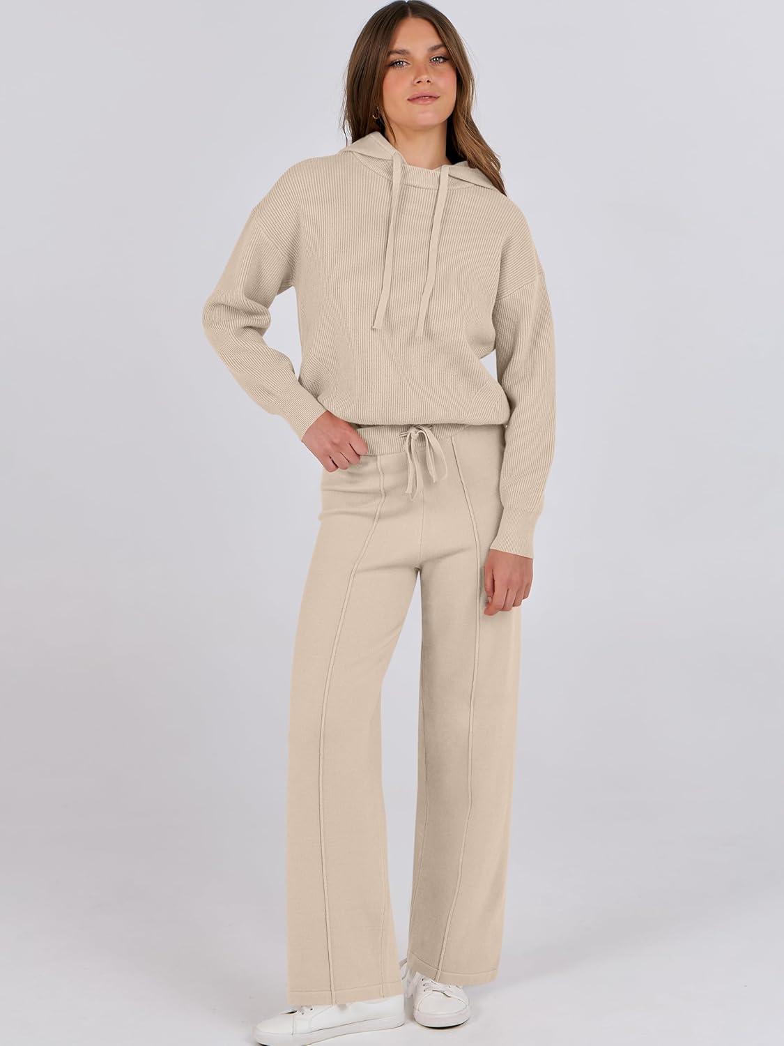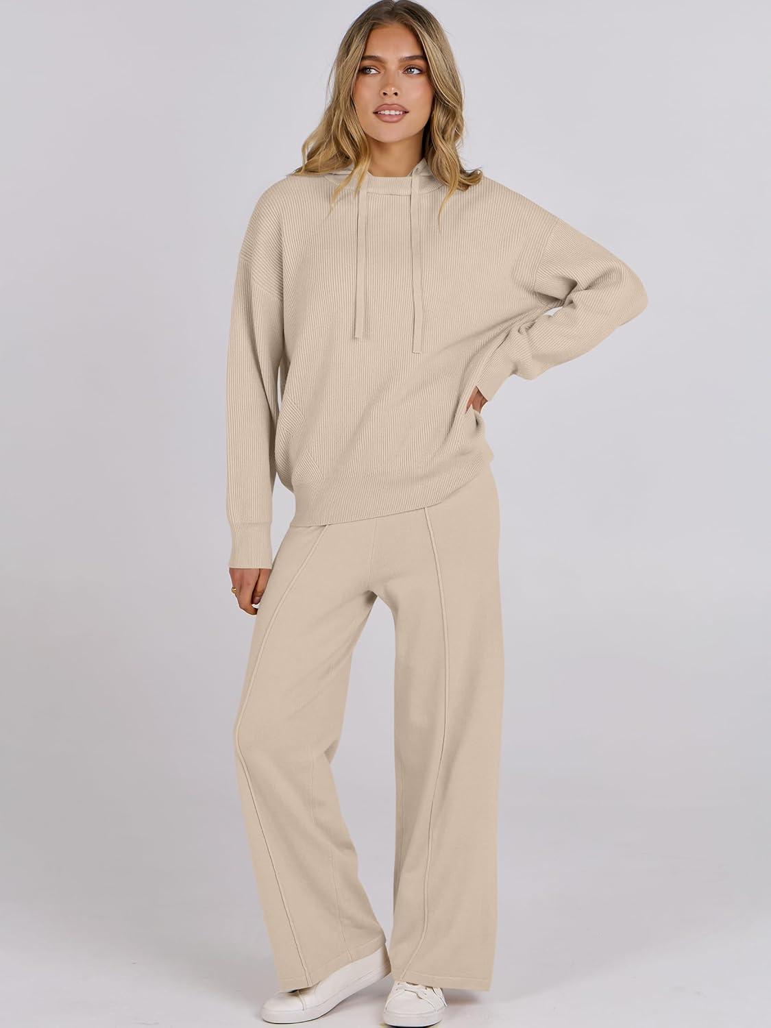 ANRABESS Women 2 Piece Outfits Sweater Sets Loose Long Sleeve Hoodies Knit Pullover Wide Leg Pants 2025 Fall Lounge Sweatsuit(Beige)