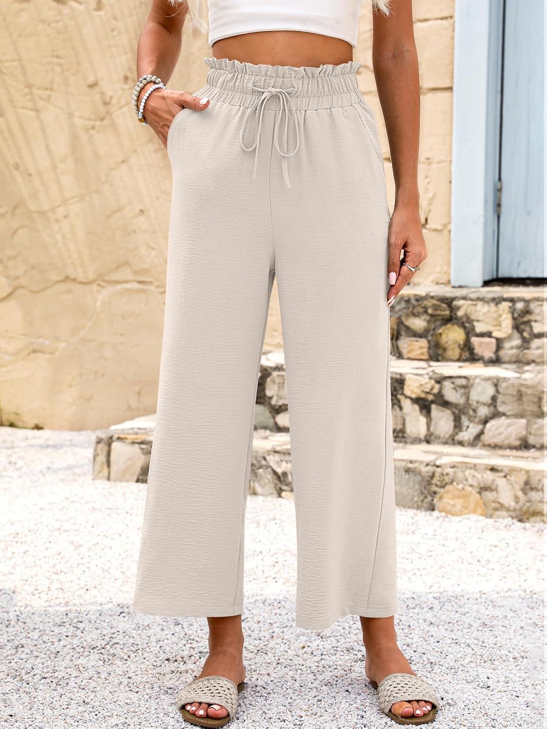 ANRABESS Women 2025 Summer Casual Flowy Loose High Waist Boho Wide Leg Cropped Palazzo Lounge Beach Vacation Pants Trousers(Beige)