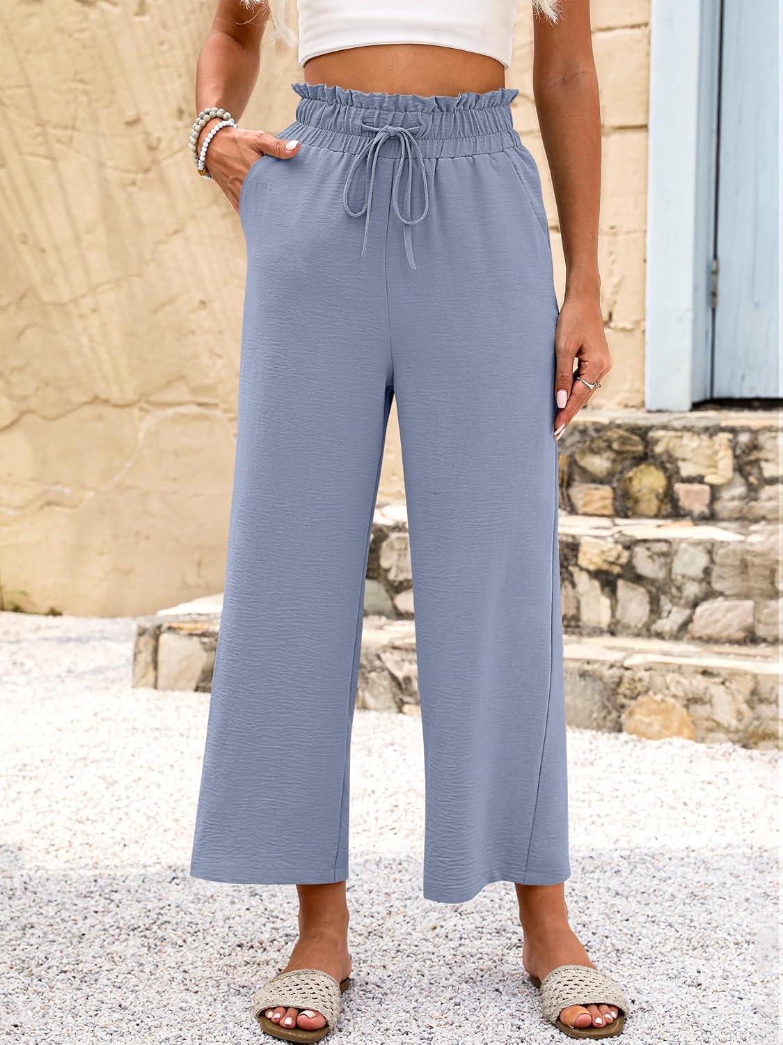ANRABESS Women 2025 Summer Casual Flowy Loose High Waist Boho Wide Leg Cropped Palazzo Lounge Beach Vacation Pants Trousers(Blue)