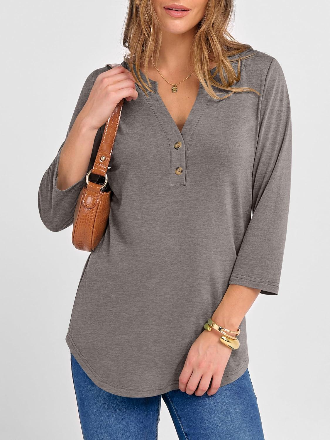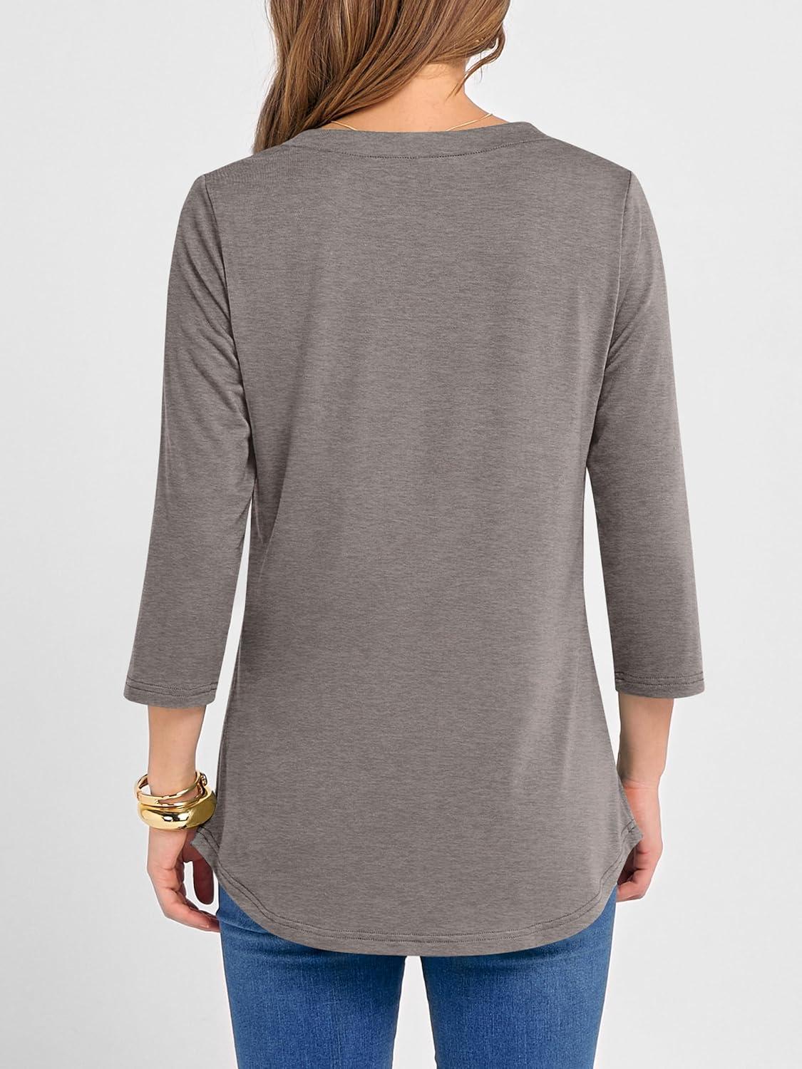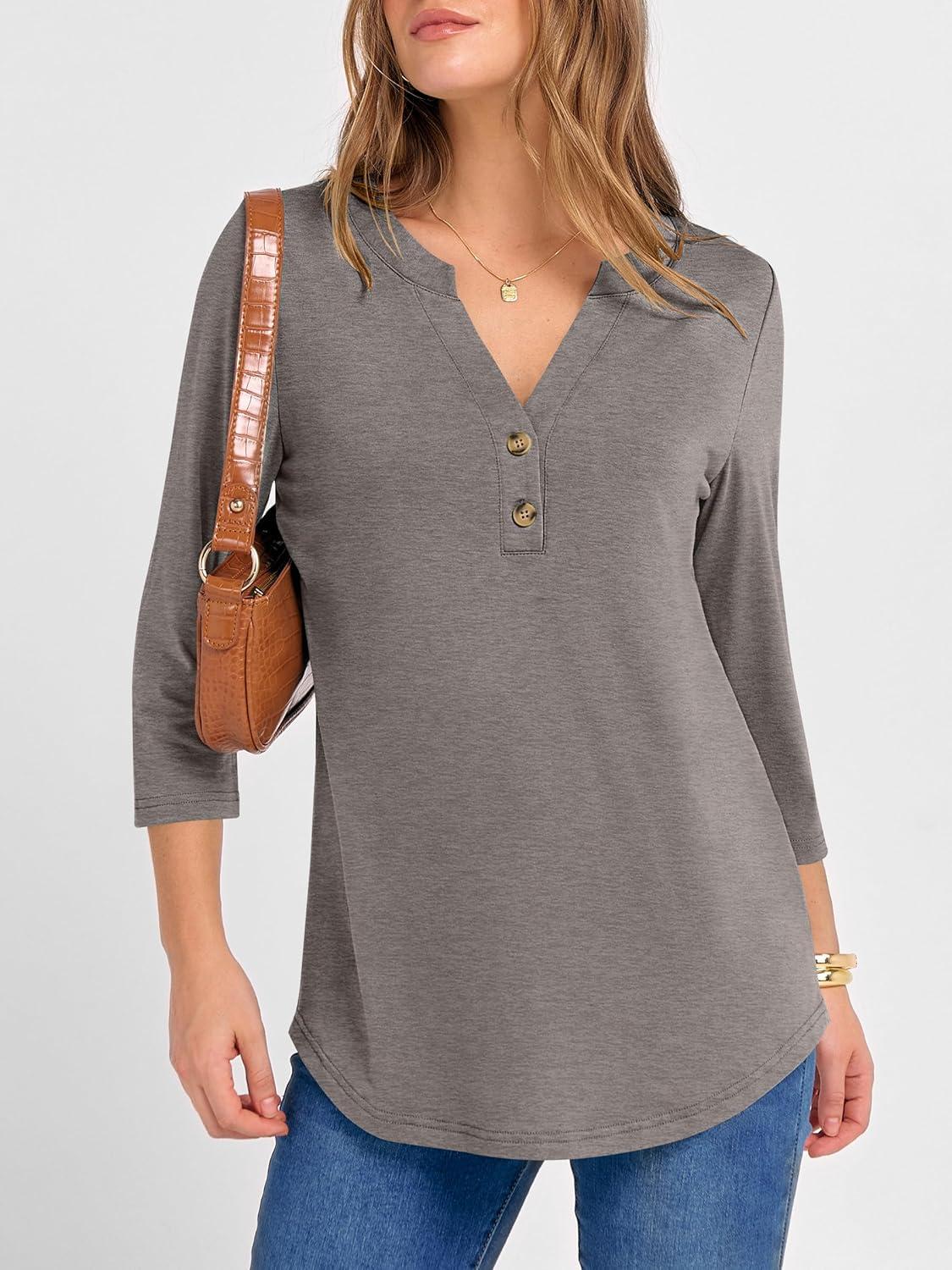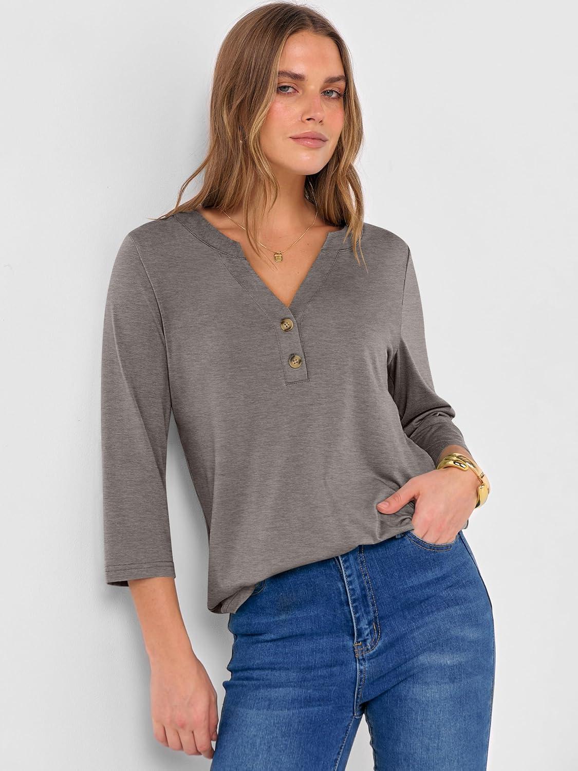 ANRABESS Women 3/4 Length Sleeve Henley Tops V Neck Business Casual Work T Shirts Cute Travel Shirts 2025 Fall Trendy Outfits(Light Taupe)