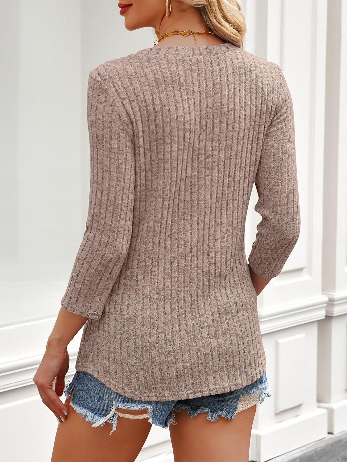 ANRABESS Women 3/4 Sleeve Length Shirts 2025 Fall Lightweight Sweaters Loose Fit Ribbed Knit Casual Soft Layering Tops(Tan)
