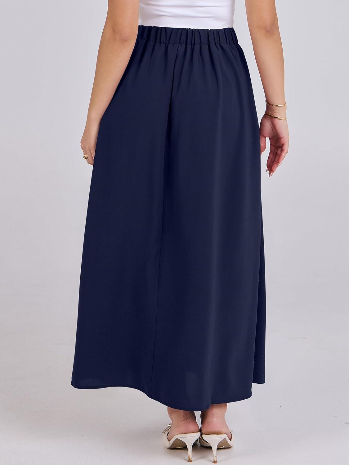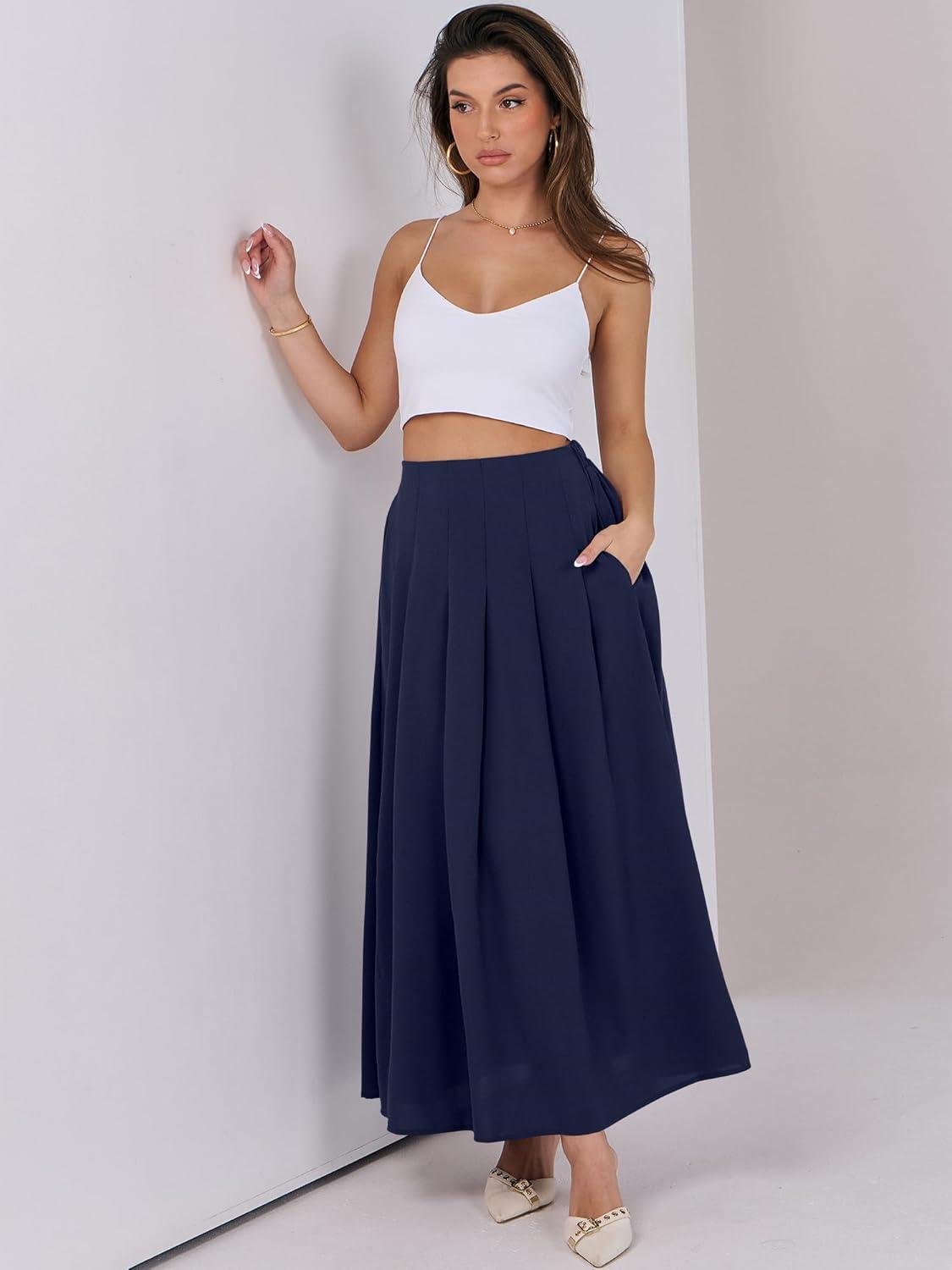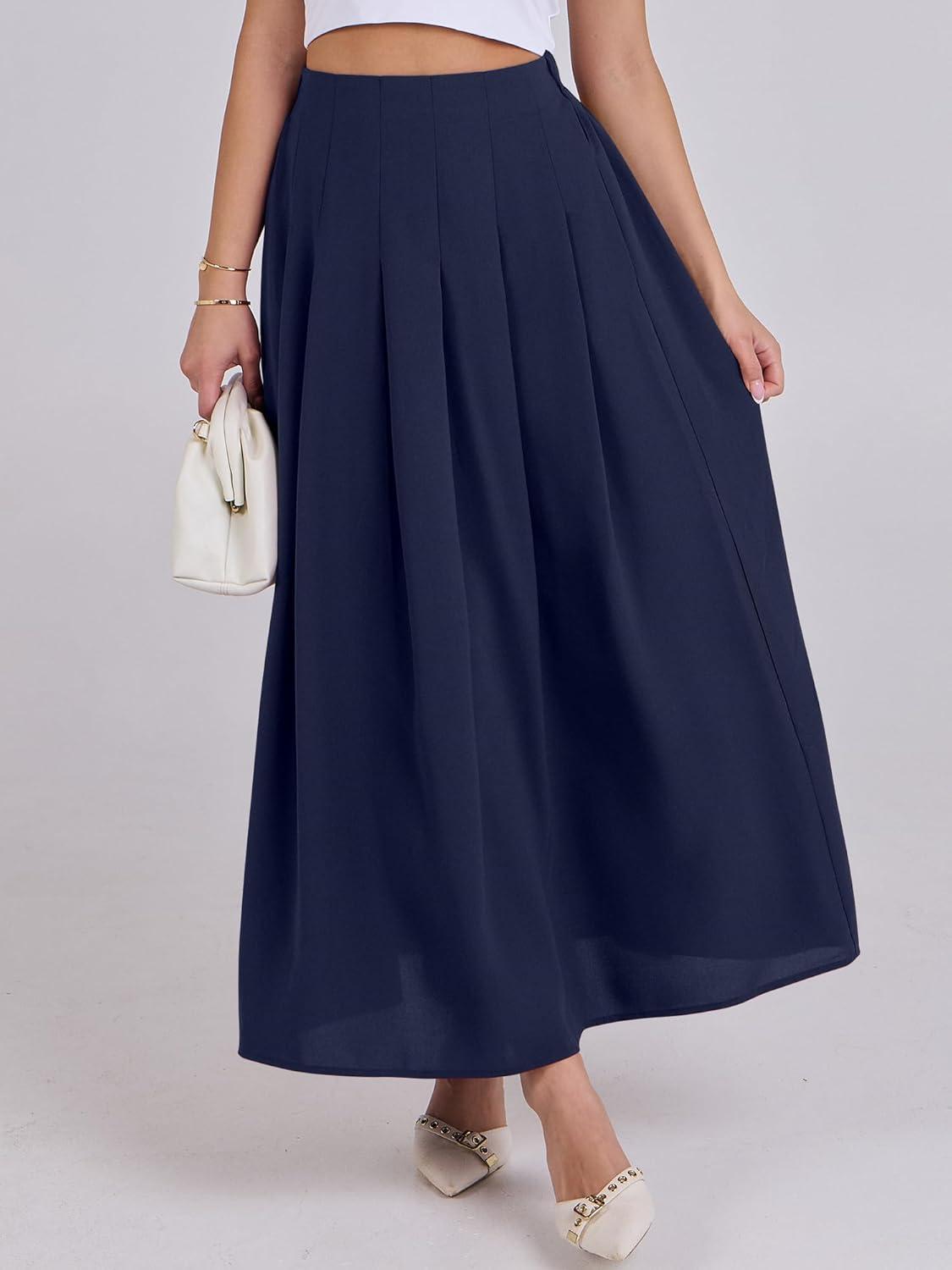 ANRABESS Women A-Line Pleated High Waist Maxi Skirt Full Ankle Length Flowy Swing Elegant Dressy Casual Work Long Skirts(Navy Blue)