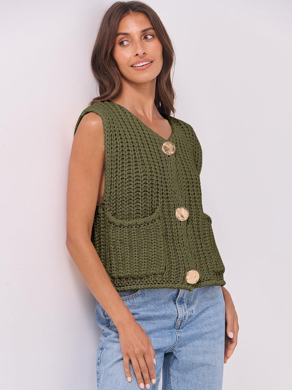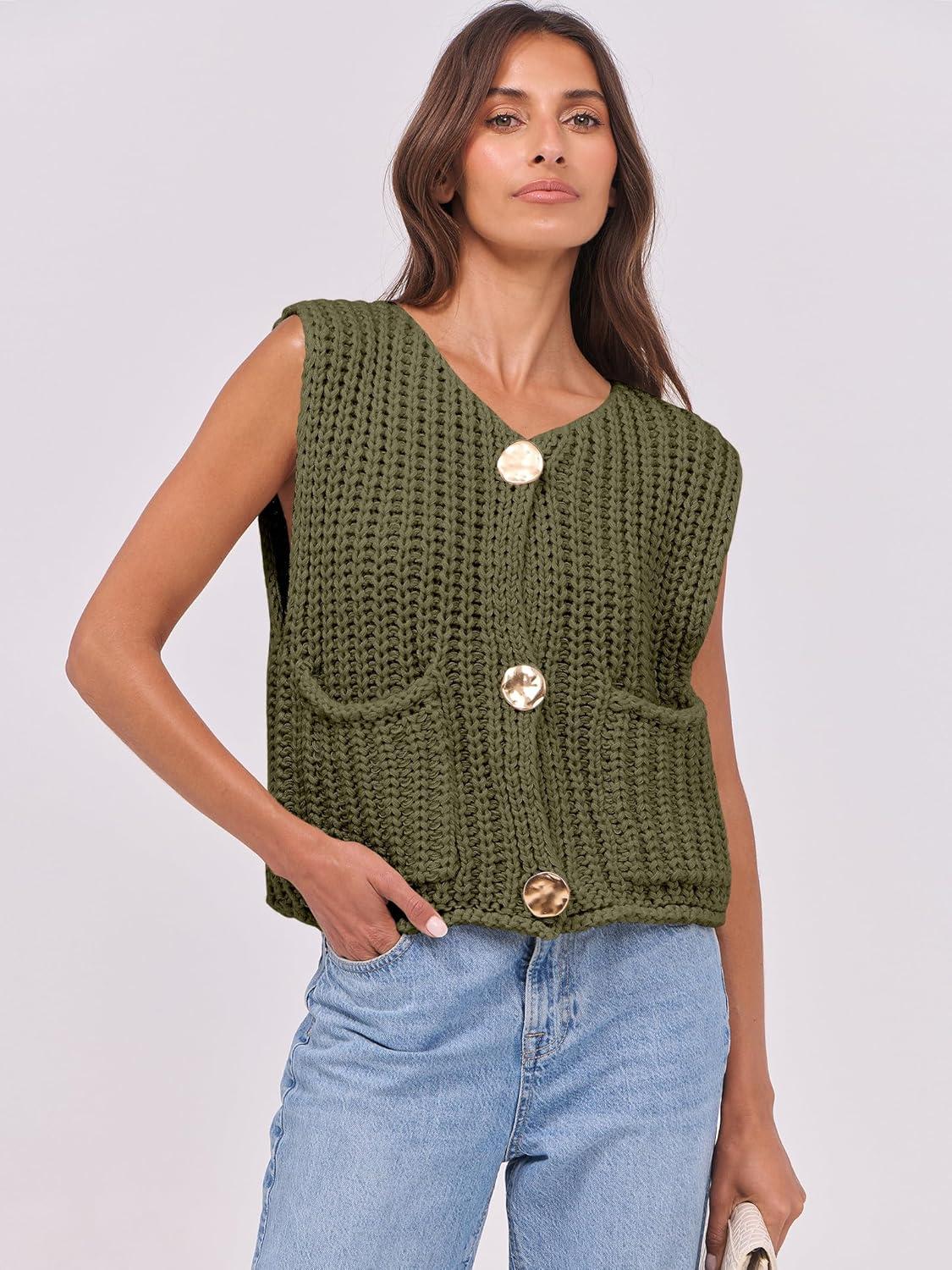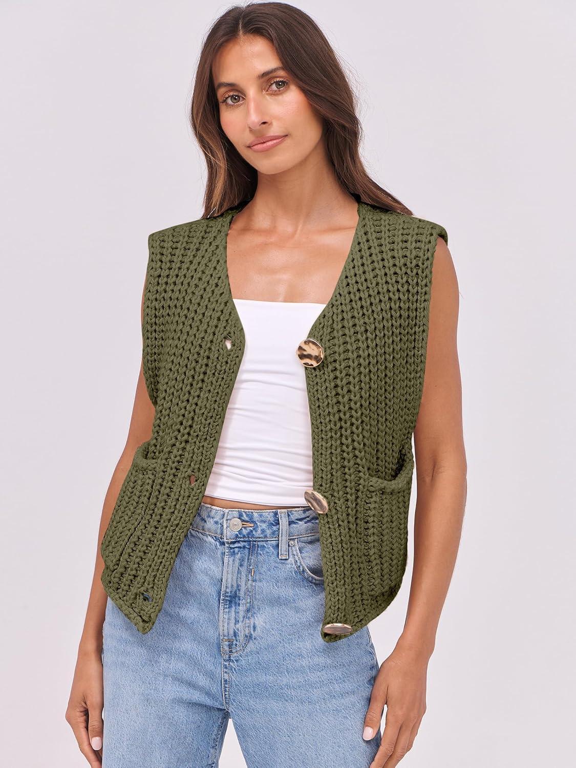 ANRABESS Women Chunky Knit Sweater Vest Button Down Casual Sleeveless Cardigan with Pockets Spring Trendy Outfits 2025(Army Green)