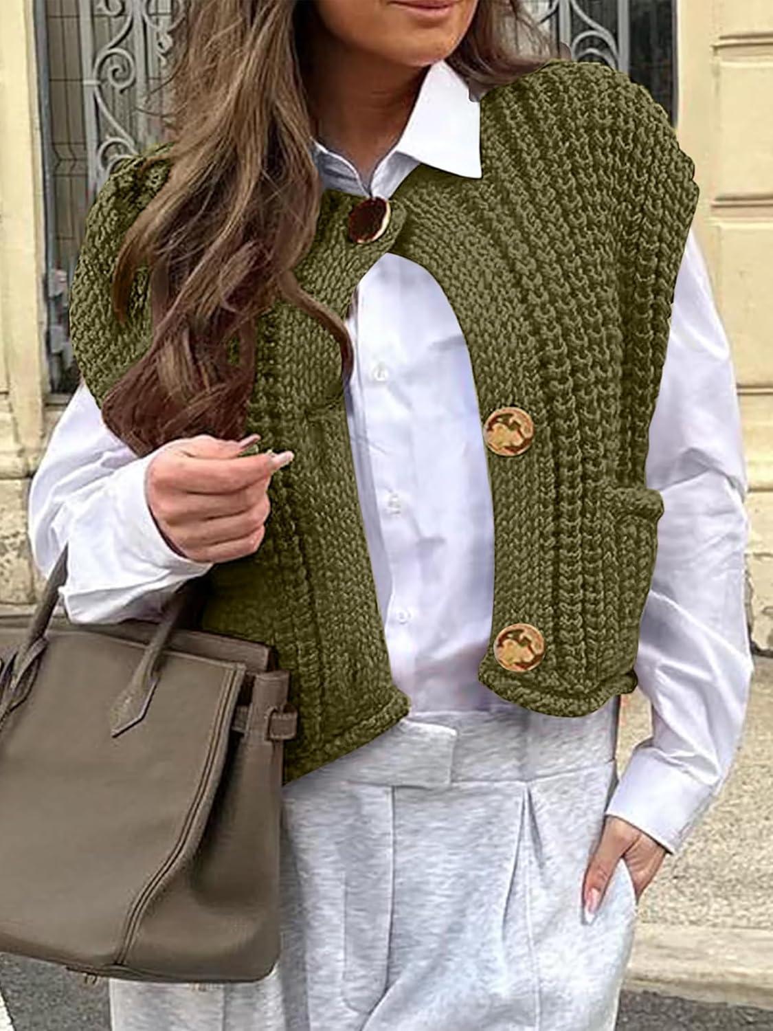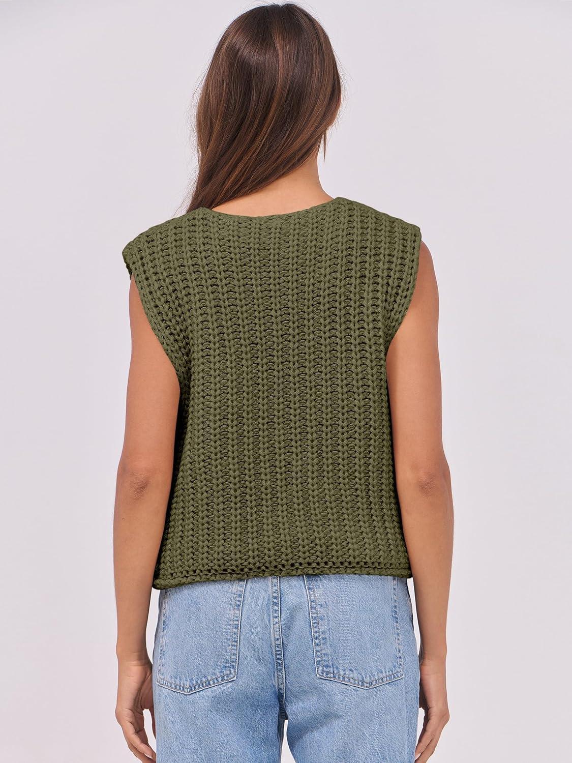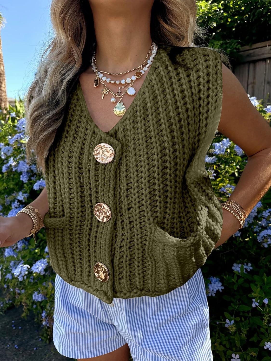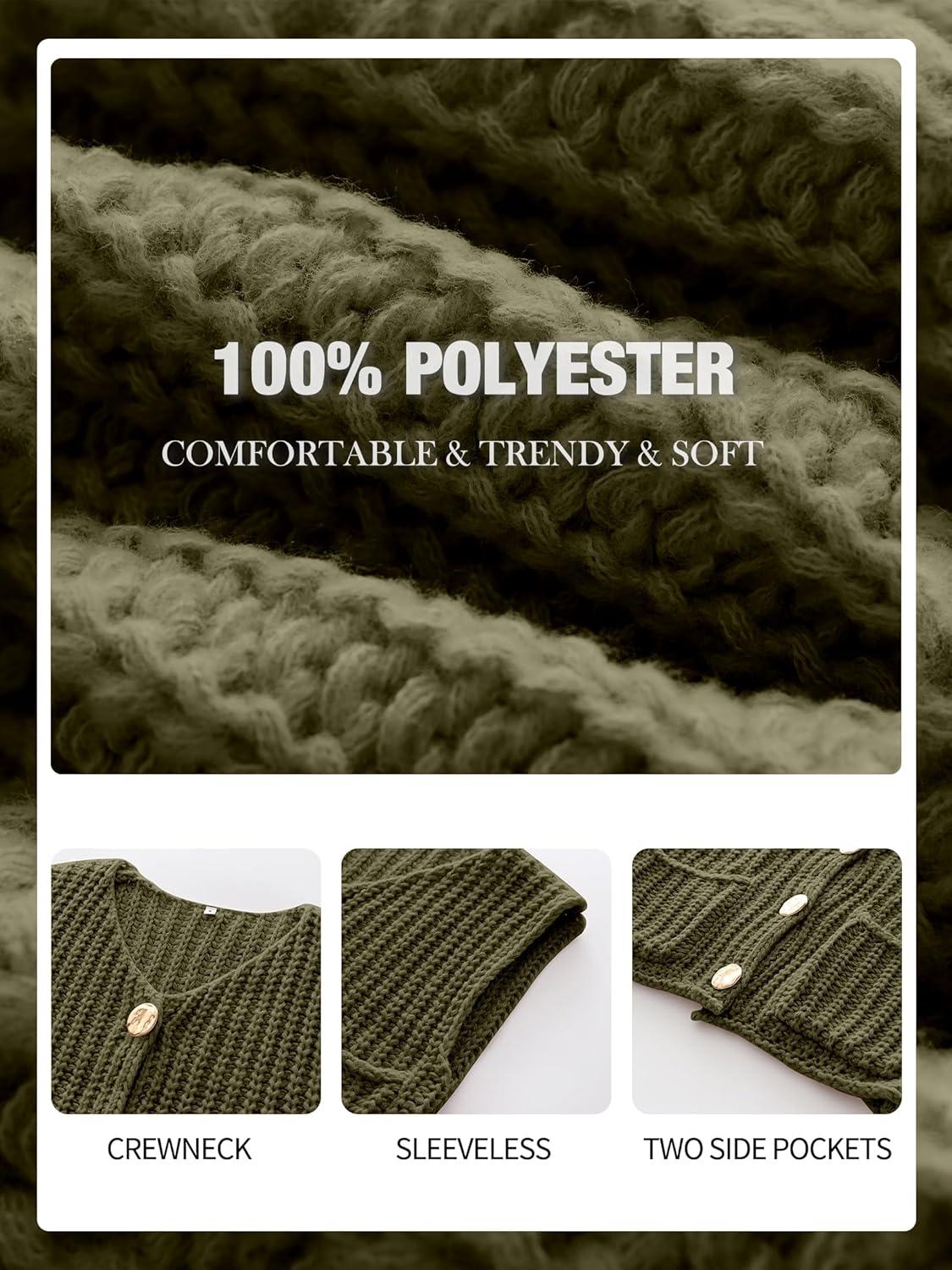 ANRABESS Women Chunky Knit Sweater Vest Button Down Casual Sleeveless Cardigan with Pockets Spring Trendy Outfits 2025(Army Green)