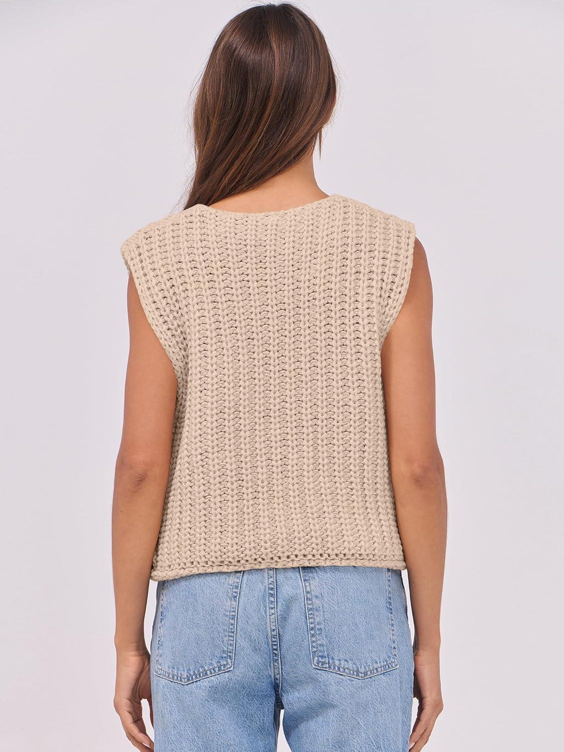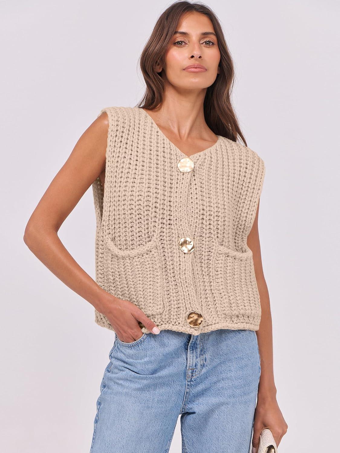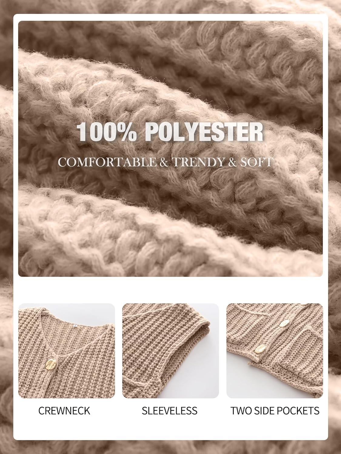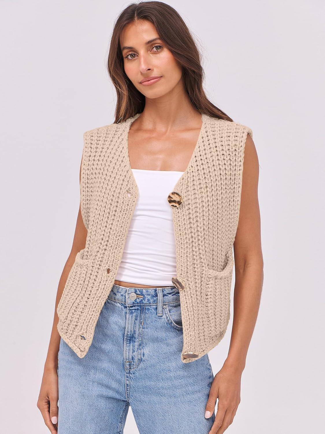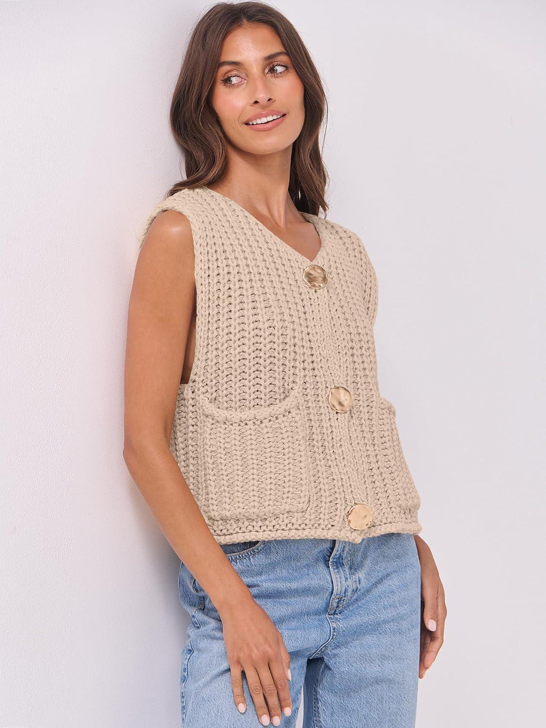 ANRABESS Women Chunky Knit Sweater Vest Button Down Casual Sleeveless Cardigan with Pockets Spring Trendy Outfits 2025(Beige)