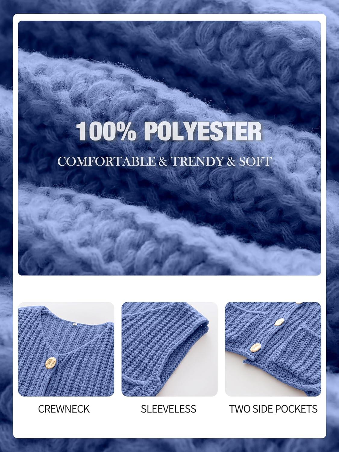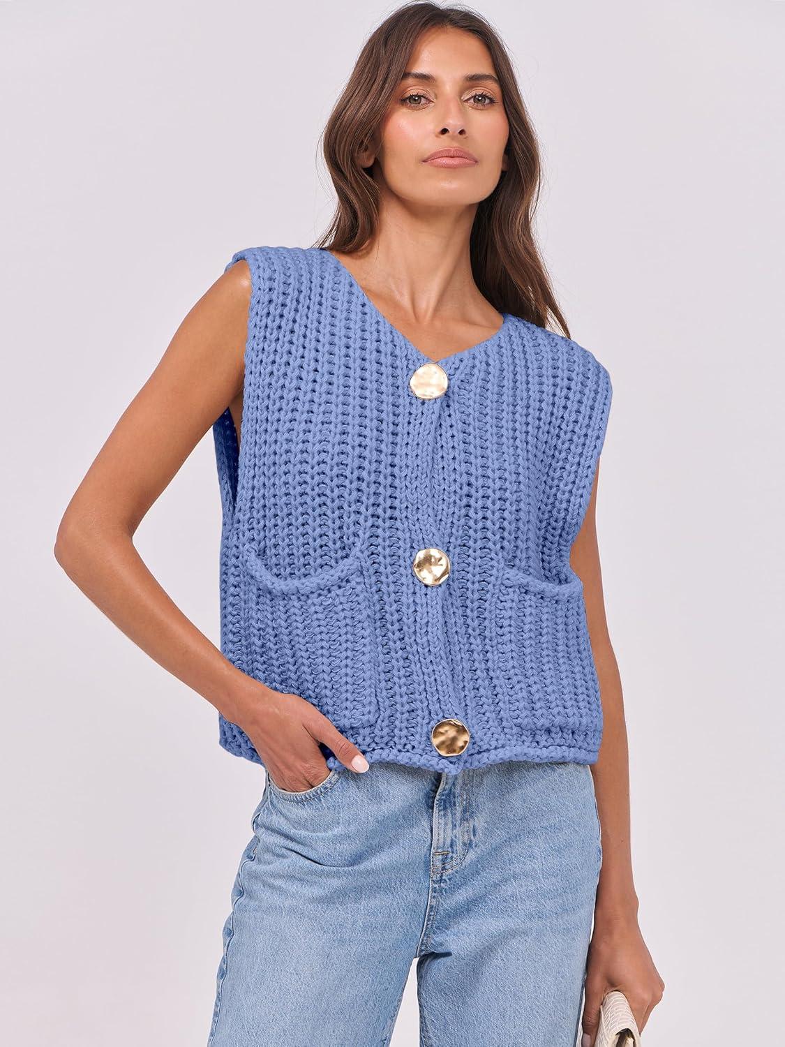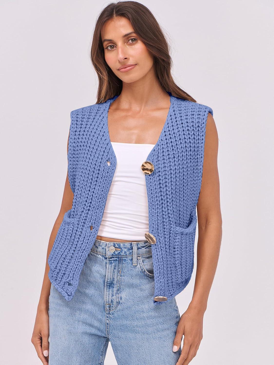 ANRABESS Women Chunky Knit Sweater Vest Button Down Casual Sleeveless Cardigan with Pockets Spring Trendy Outfits 2025(Light Blue)