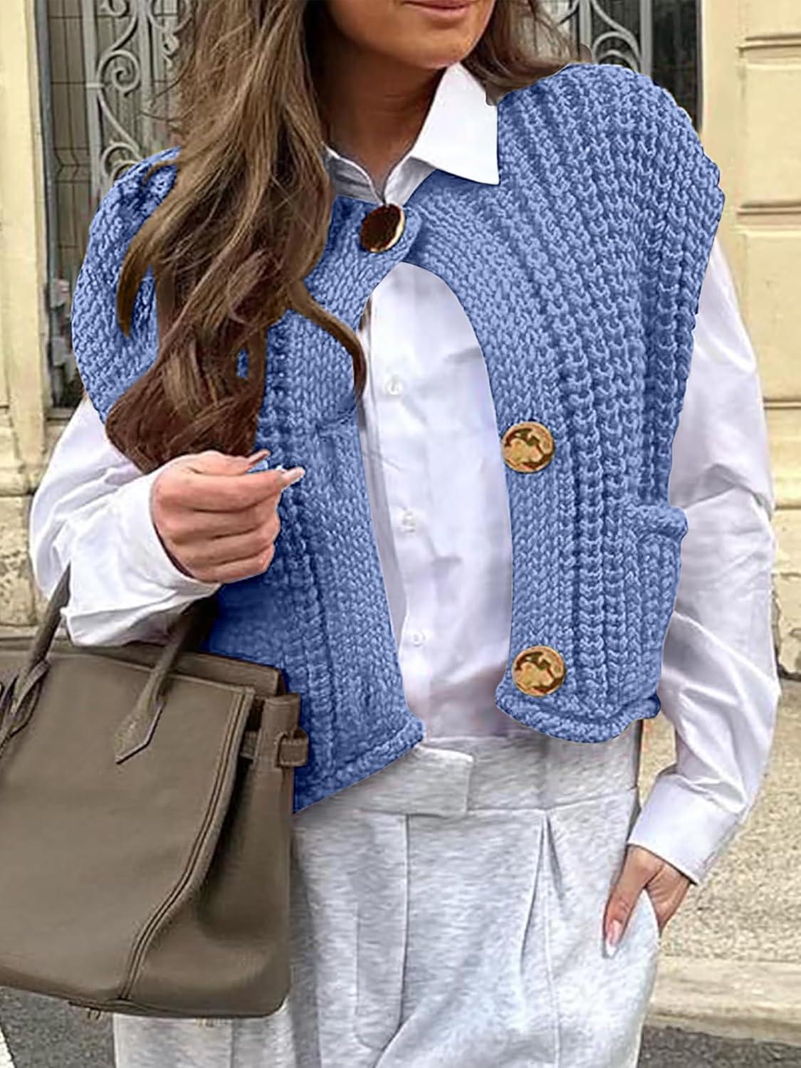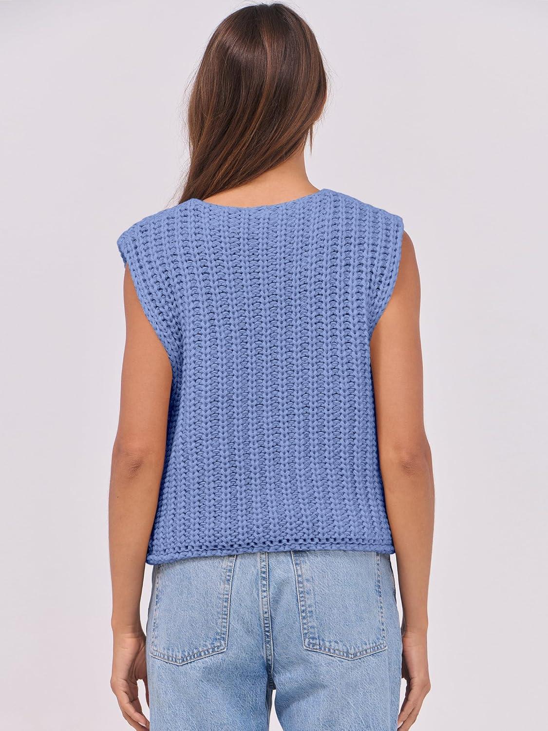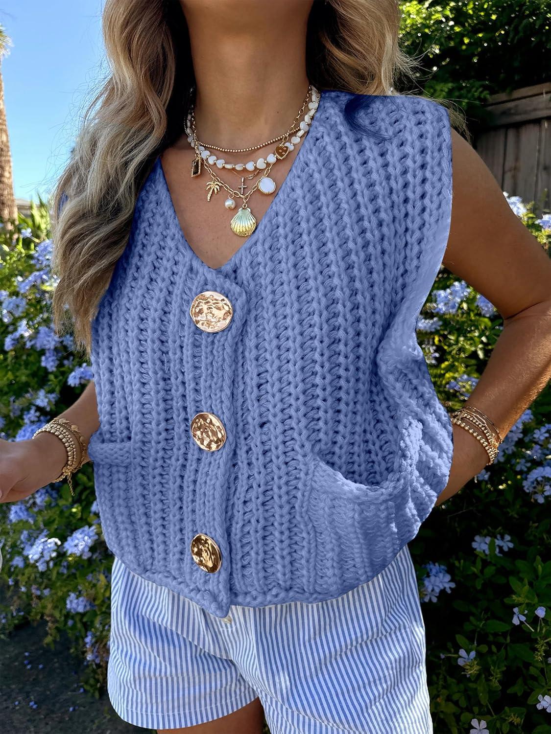 ANRABESS Women Chunky Knit Sweater Vest Button Down Casual Sleeveless Cardigan with Pockets Spring Trendy Outfits 2025(Light Blue)