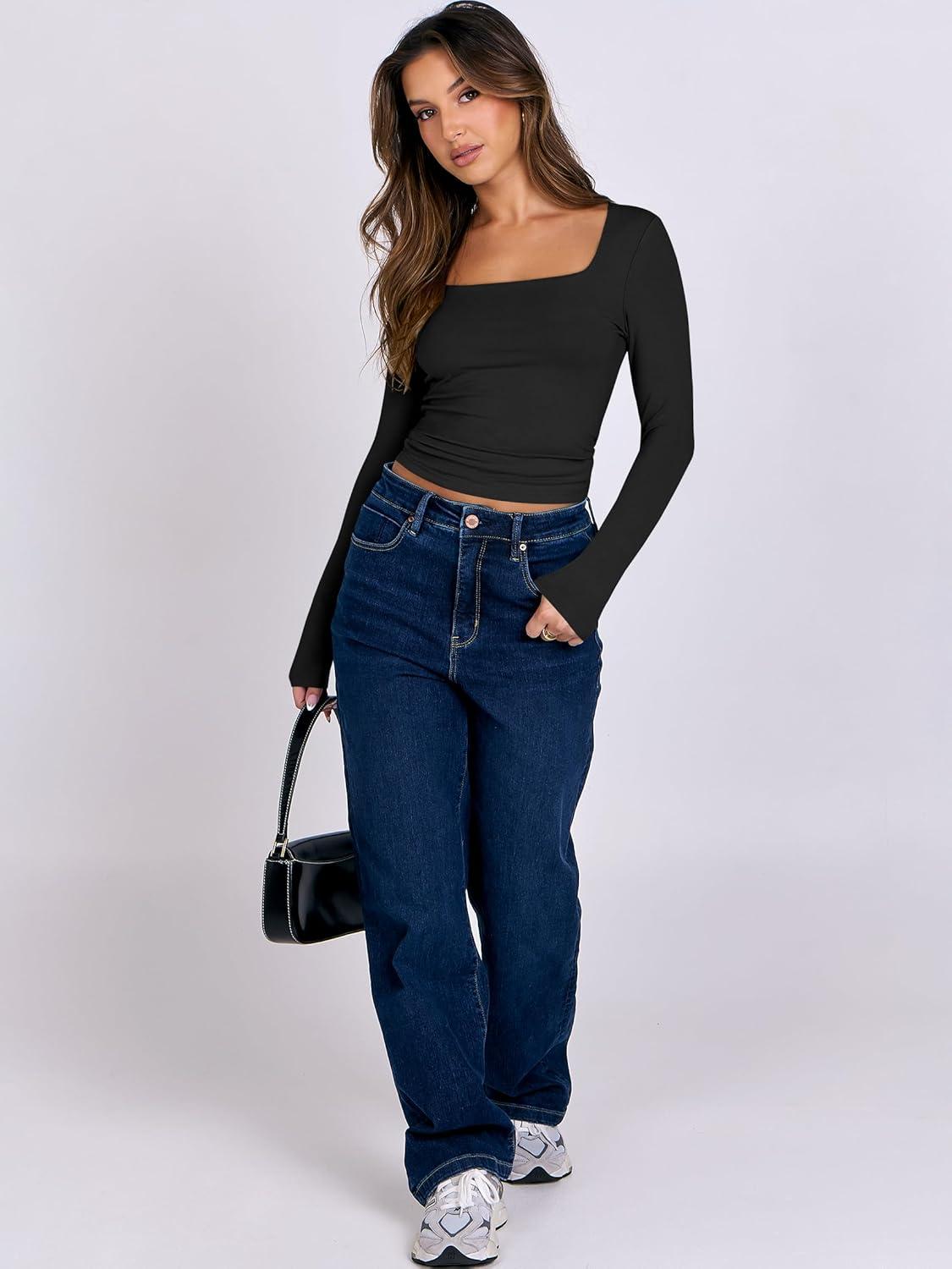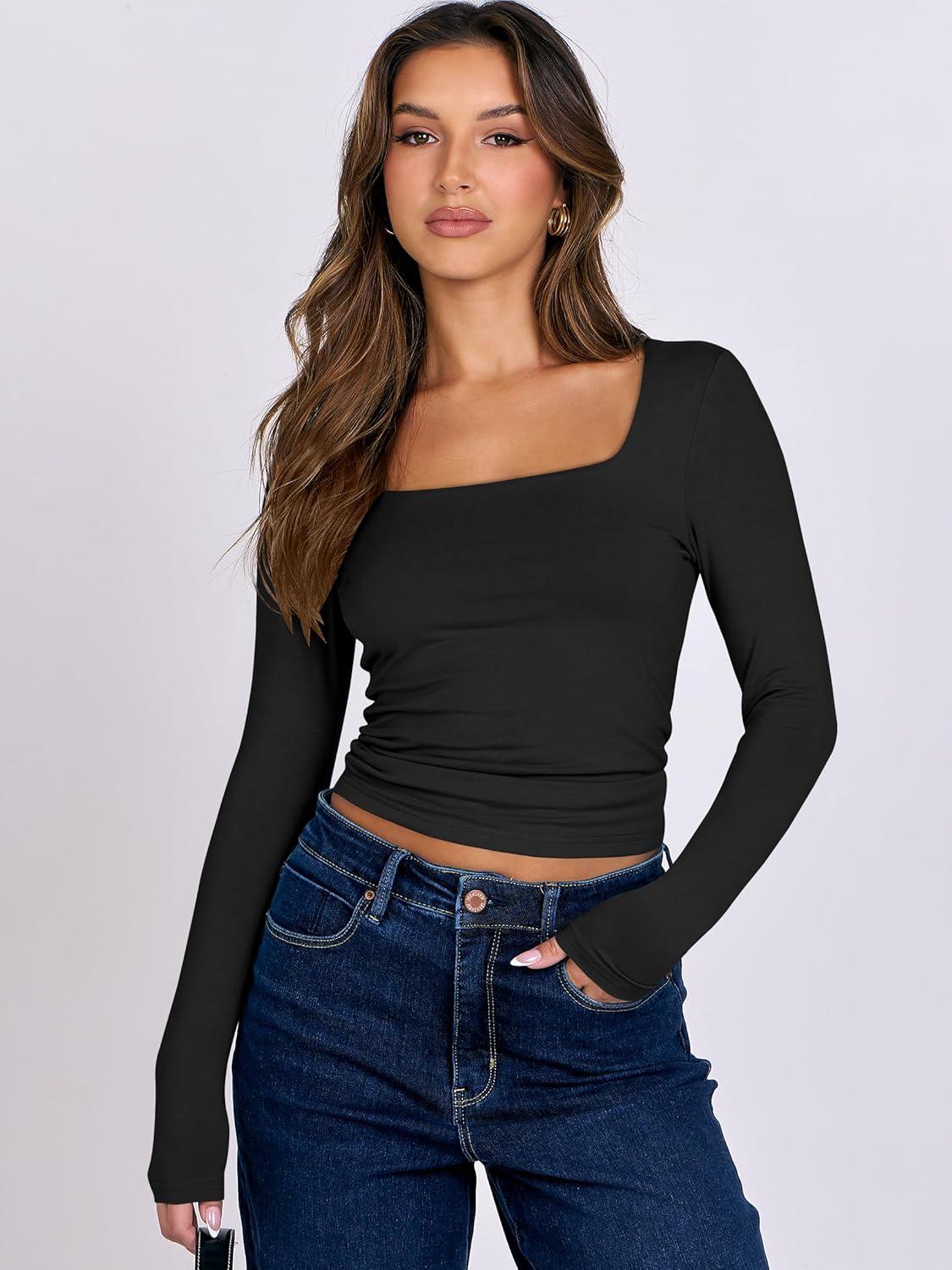 ANRABESS Women Double Lined Long Sleeve Crop Tops Shirts Square Neck Tight Fitted Going Out T-Shirt Basic Tee Outfits 2025(Black)