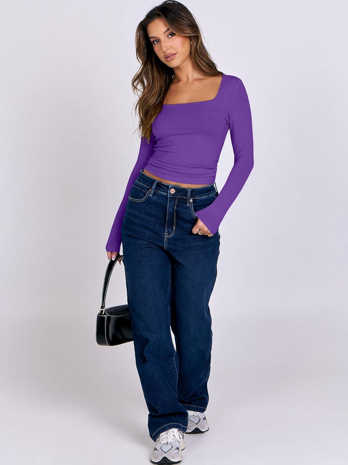 ANRABESS Women Double Lined Long Sleeve Crop Tops Shirts Square Neck Tight Fitted Going Out T-Shirt Basic Tee Outfits 2025(Bright Purple)