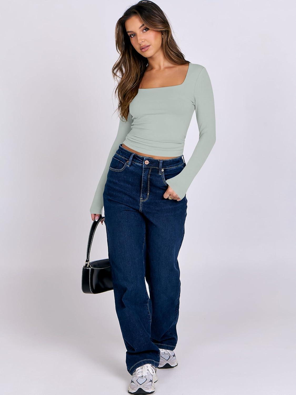 ANRABESS Women Double Lined Long Sleeve Crop Tops Shirts Square Neck Tight Fitted Going Out T-Shirt Basic Tee Outfits 2025(Light Green)