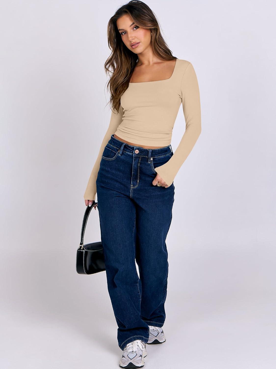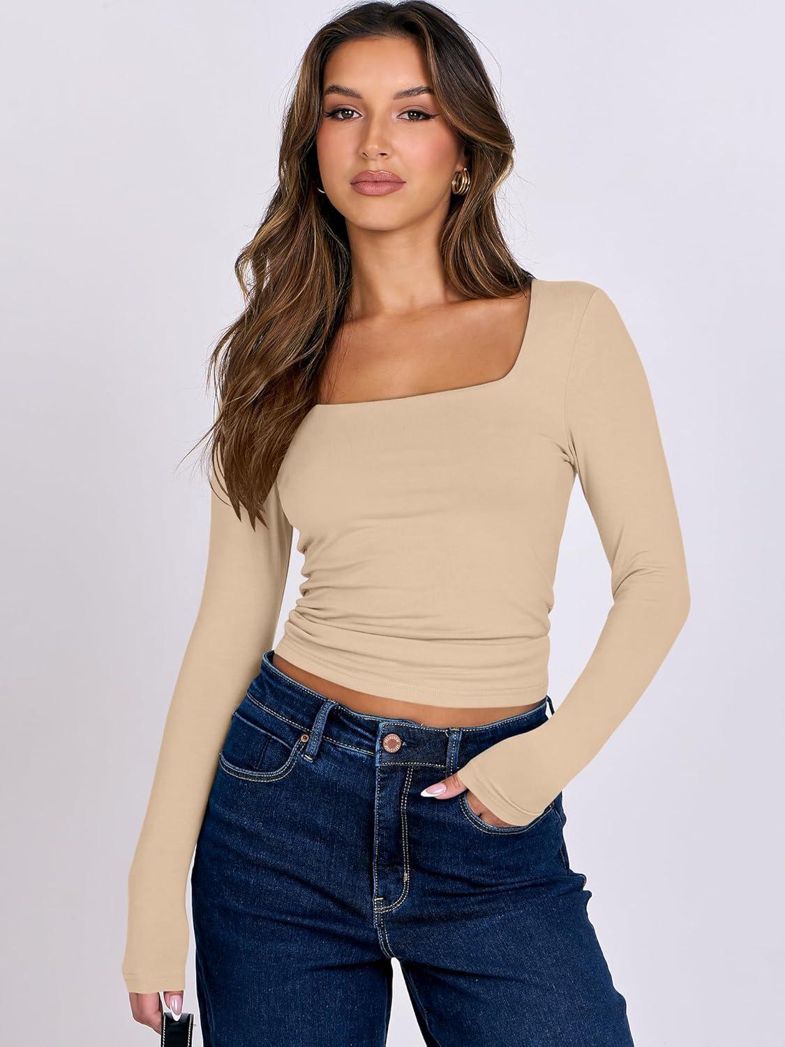 ANRABESS Women Double Lined Long Sleeve Crop Tops Shirts Square Neck Tight Fitted Going Out T-Shirt Basic Tee Outfits 2025(Light Khaiki)