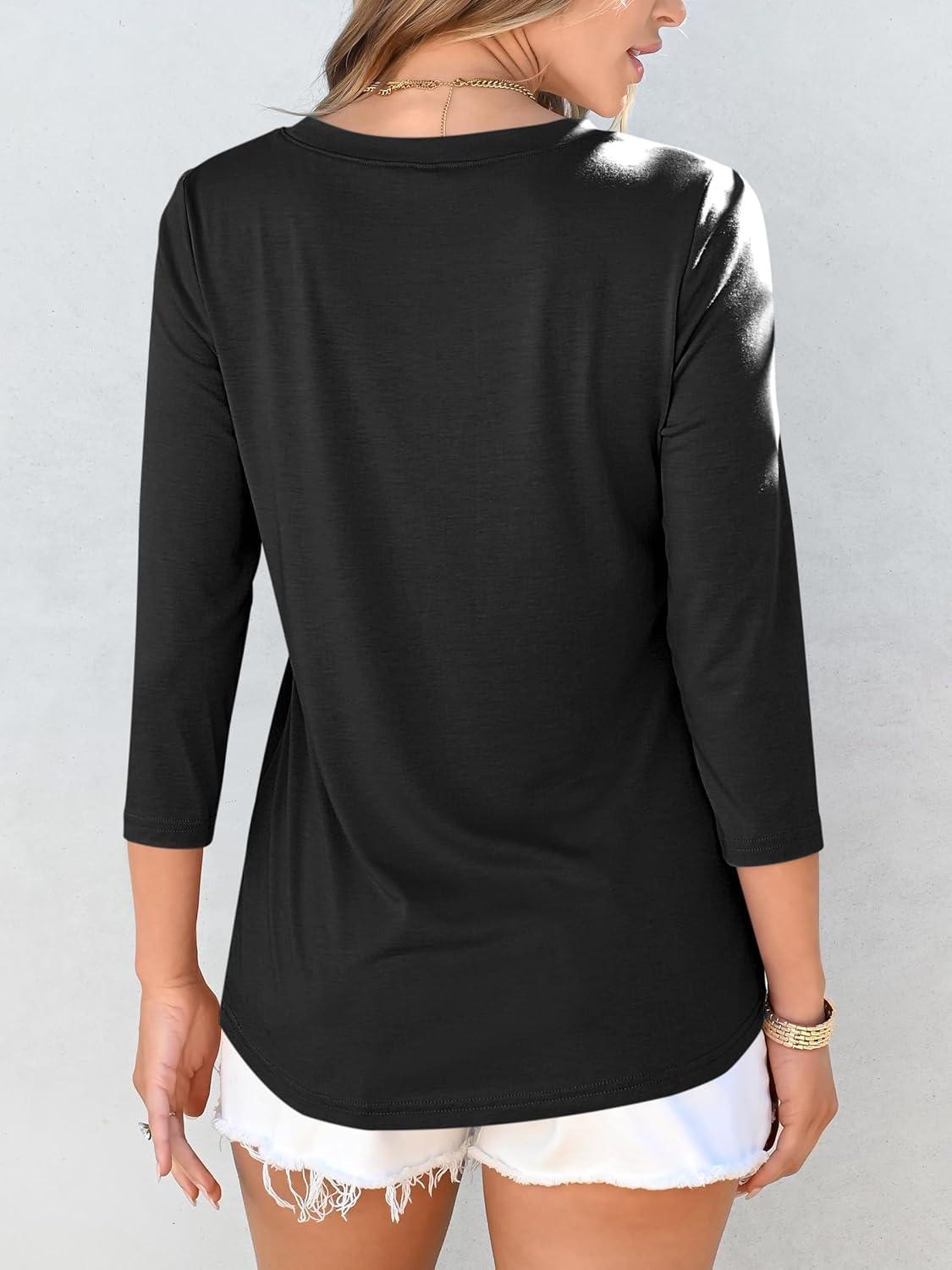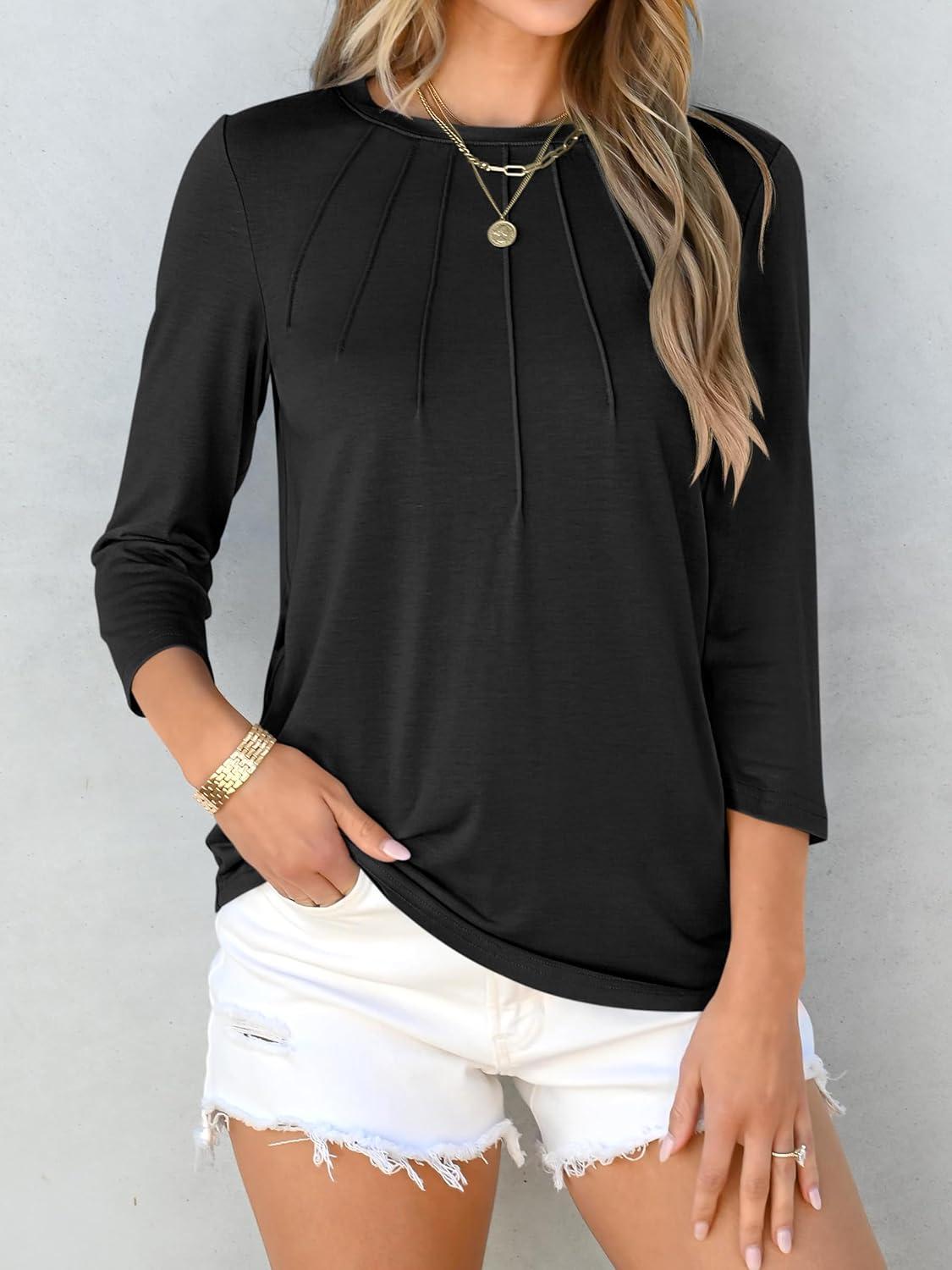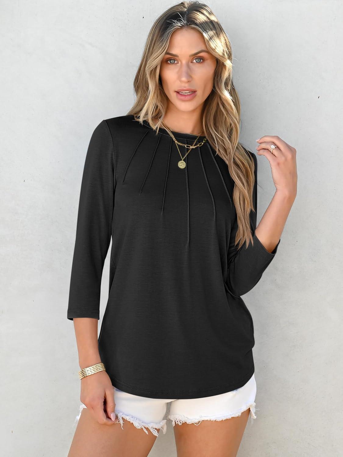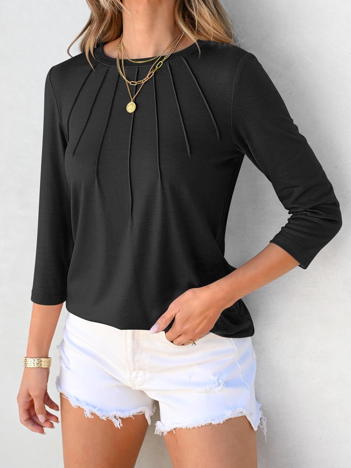 ANRABESS Women Dressy Casual Blouse 3/4 Long Sleeve T Shirts Pleated Round Neck Business Work Tunic Tops 2025 Fall Outfits(Black)