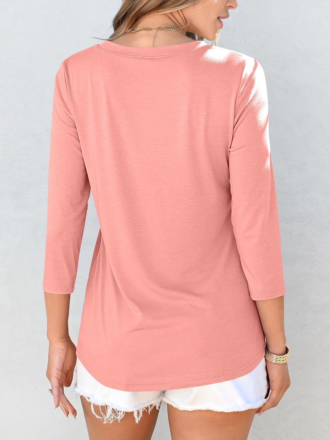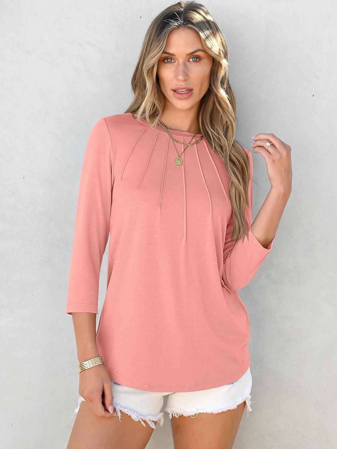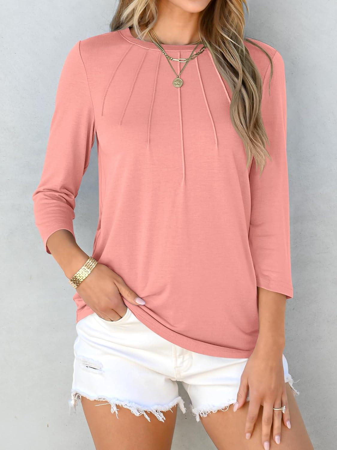 ANRABESS Women Dressy Casual Blouse 3/4 Long Sleeve T Shirts Pleated Round Neck Business Work Tunic Tops 2025 Fall Outfits(Coral)