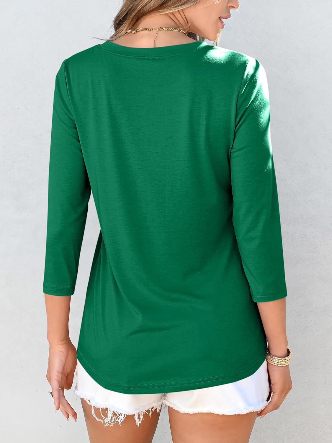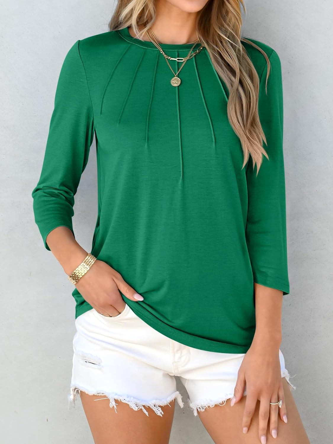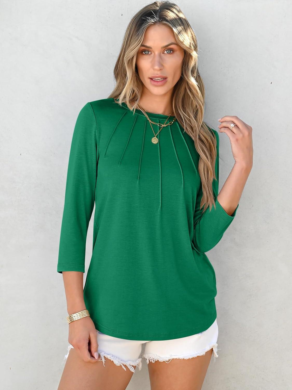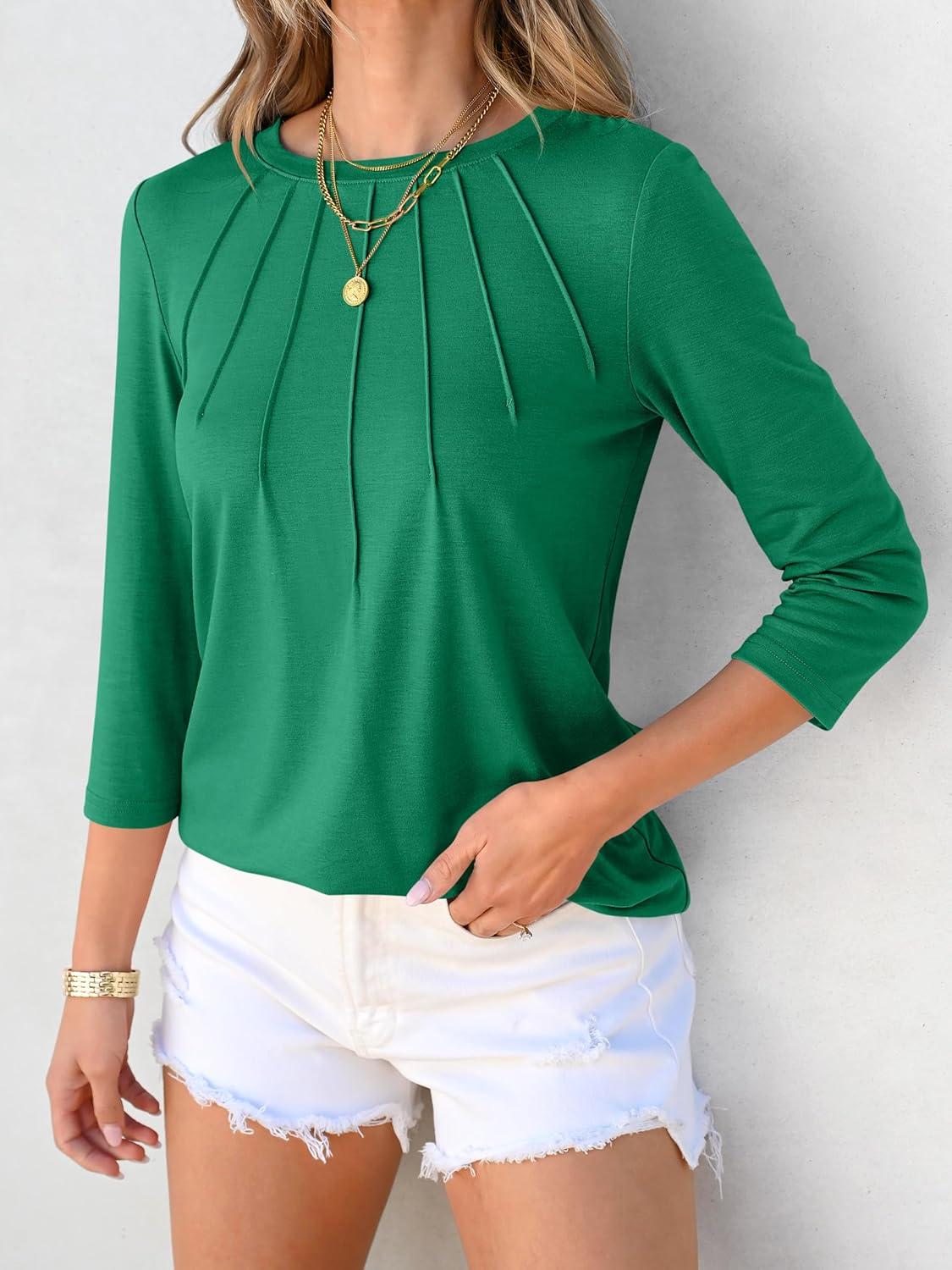 ANRABESS Women Dressy Casual Blouse 3/4 Long Sleeve T Shirts Pleated Round Neck Business Work Tunic Tops 2025 Fall Outfits(Green)