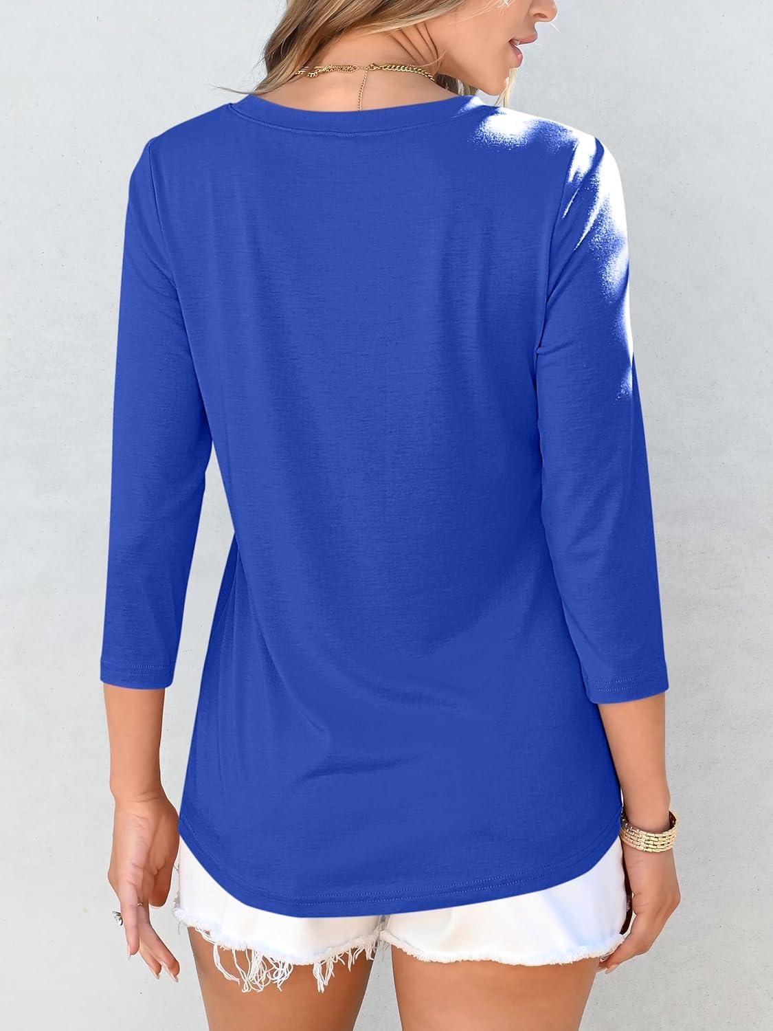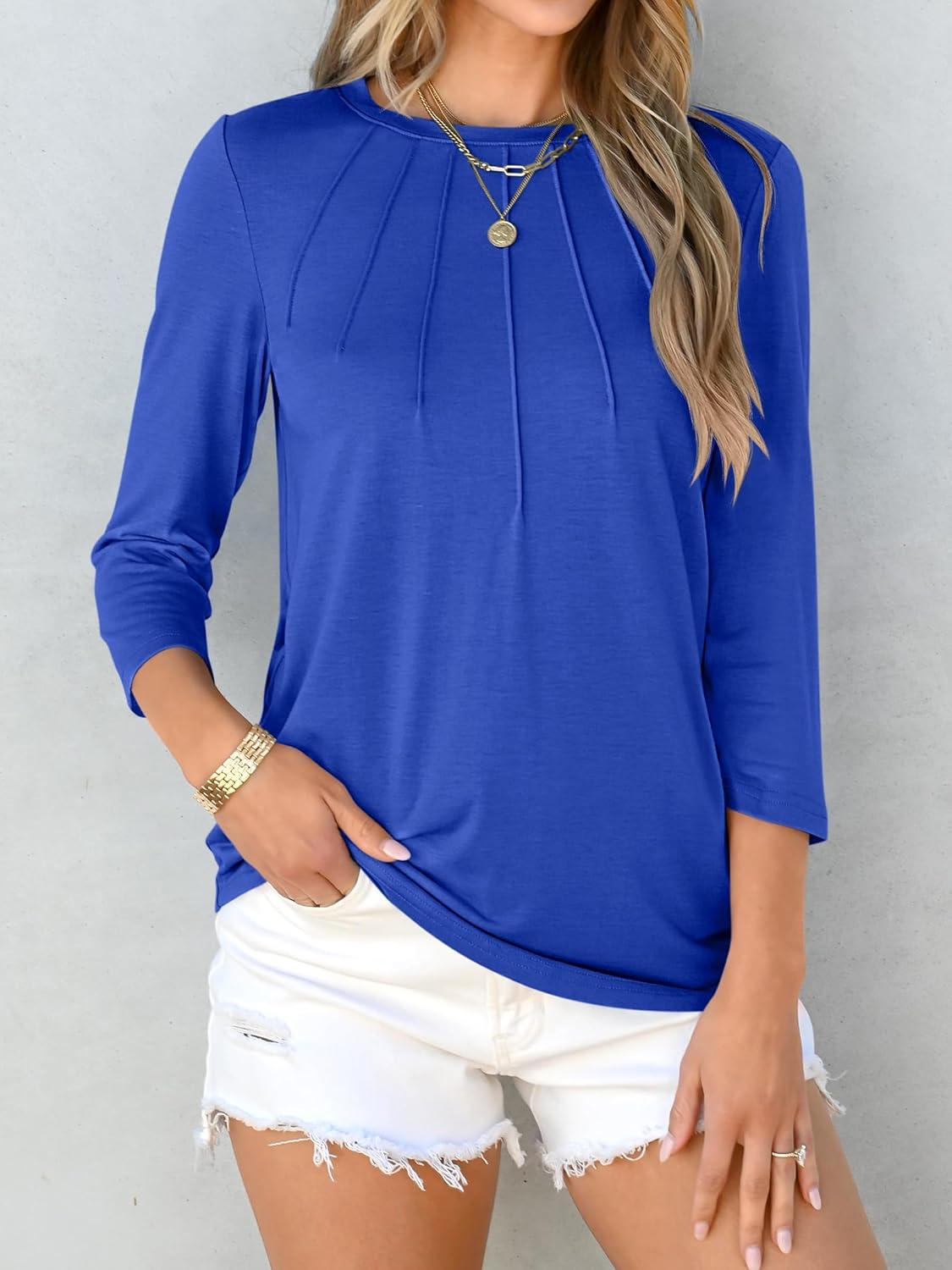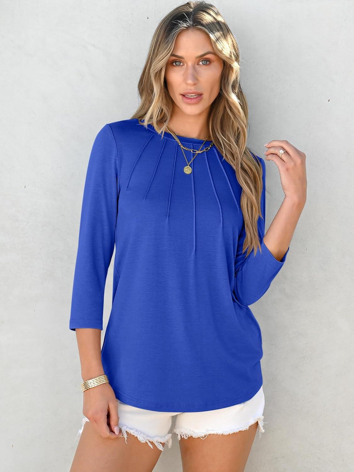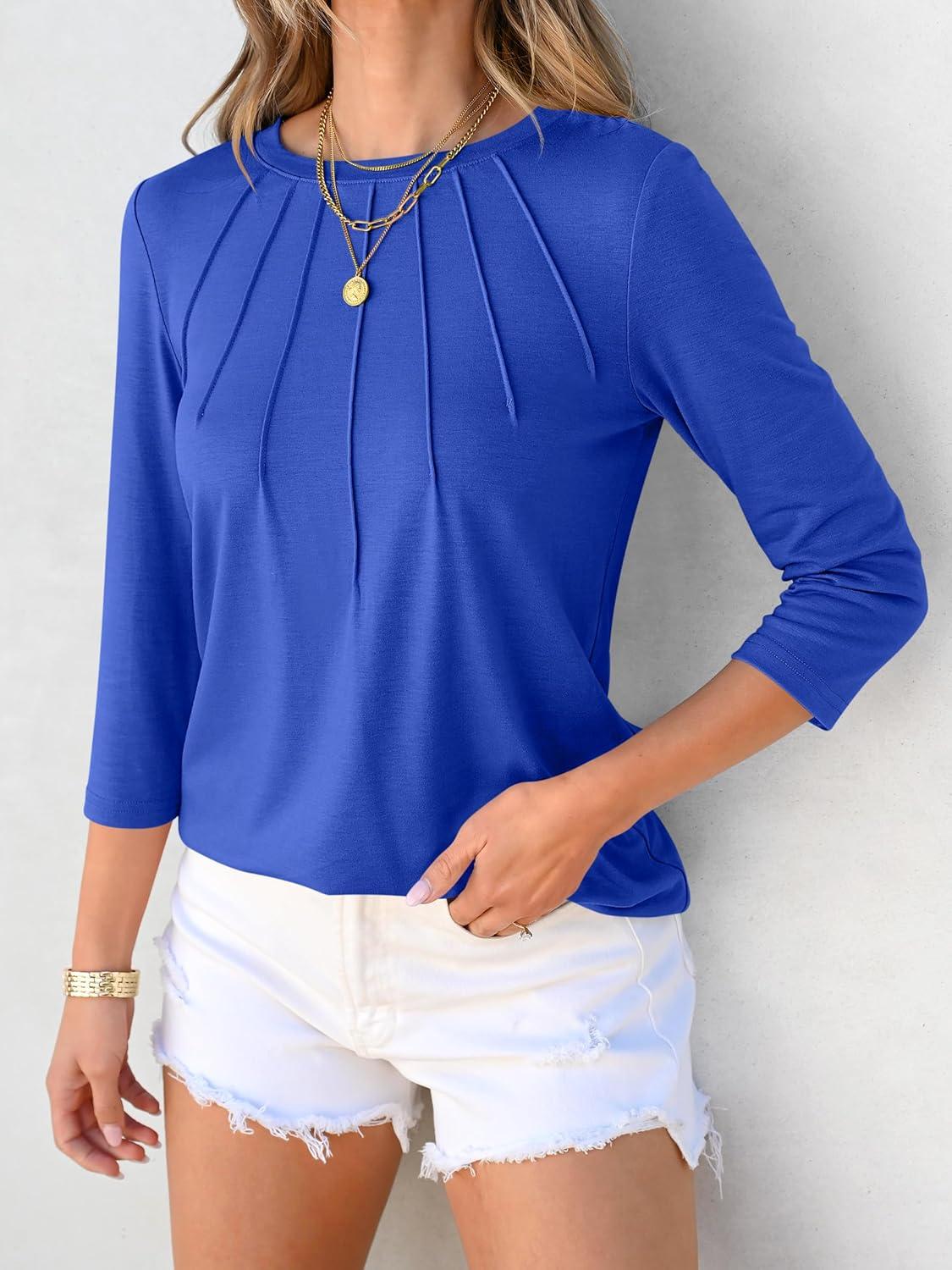ANRABESS Women Dressy Casual Blouse 3/4 Long Sleeve T Shirts Pleated Round Neck Business Work Tunic Tops 2025 Fall Outfits(Royal Blue)