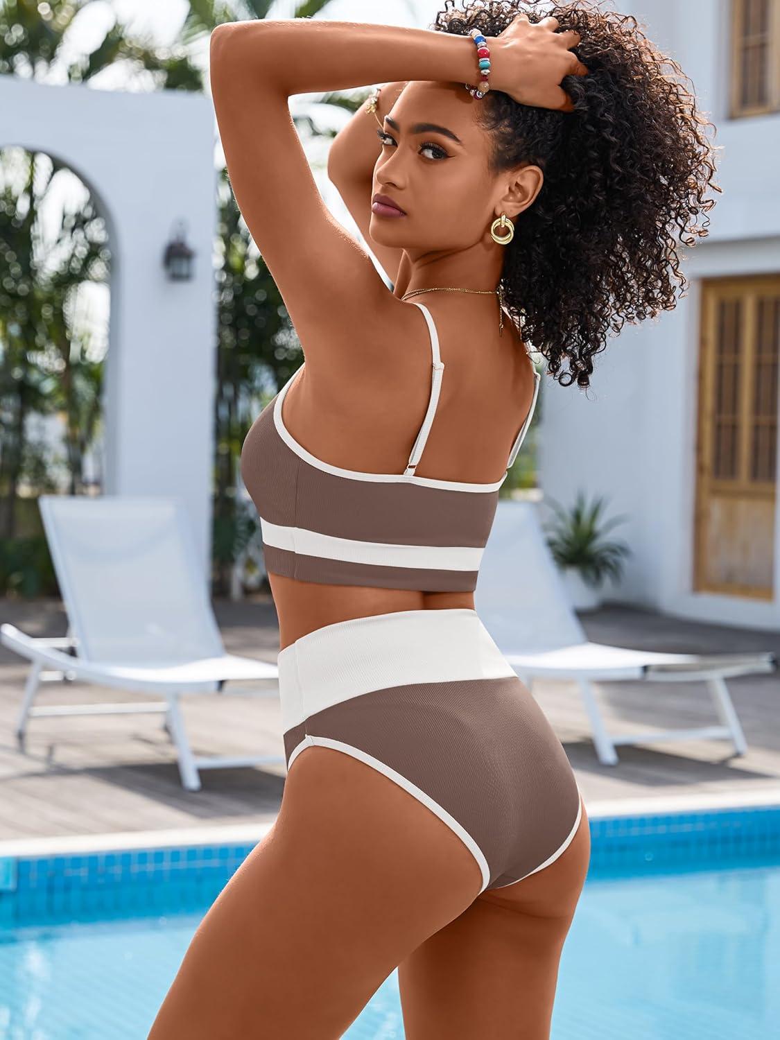 ANRABESS Women High Waisted Bikini Sets Color Block Summer Beach Vacation 2 Piece Bathing Suit Tummy Control Ribbed Swimsuit(Brown White)