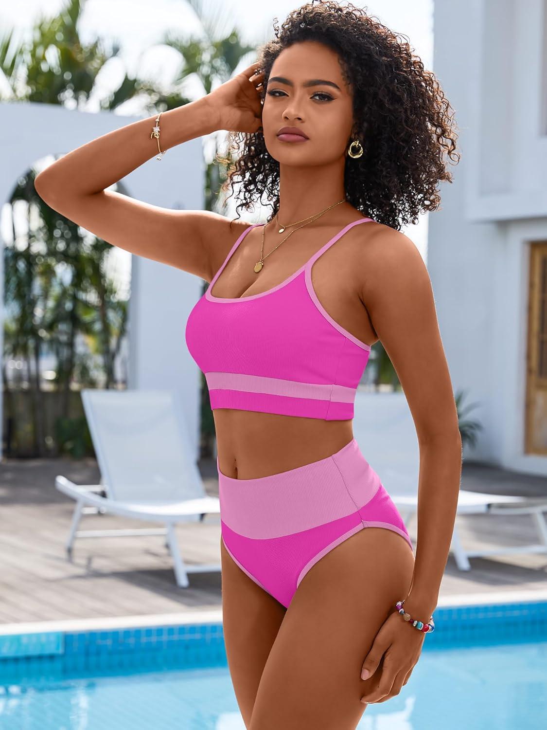 ANRABESS Women High Waisted Bikini Sets Color Block Summer Beach Vacation 2 Piece Bathing Suit Tummy Control Ribbed Swimsuit(Hot Pink)