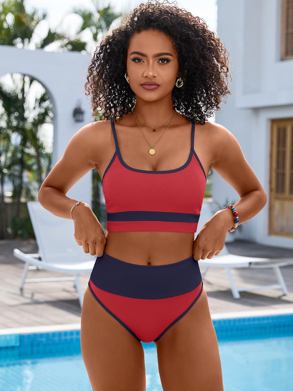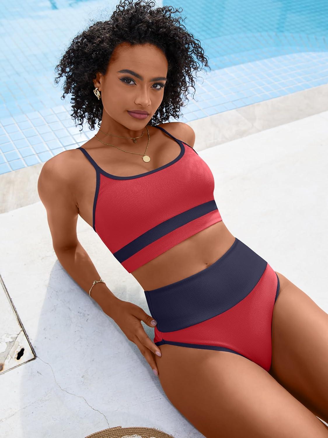 ANRABESS Women High Waisted Bikini Sets Color Block Summer Beach Vacation 2 Piece Bathing Suit Tummy Control Ribbed Swimsuit(Red Navy)